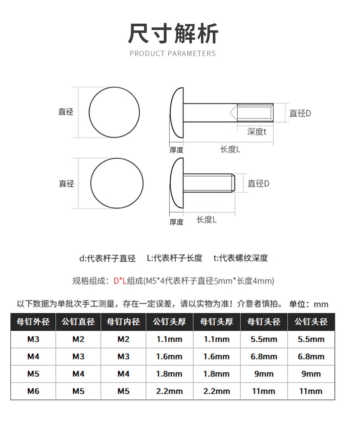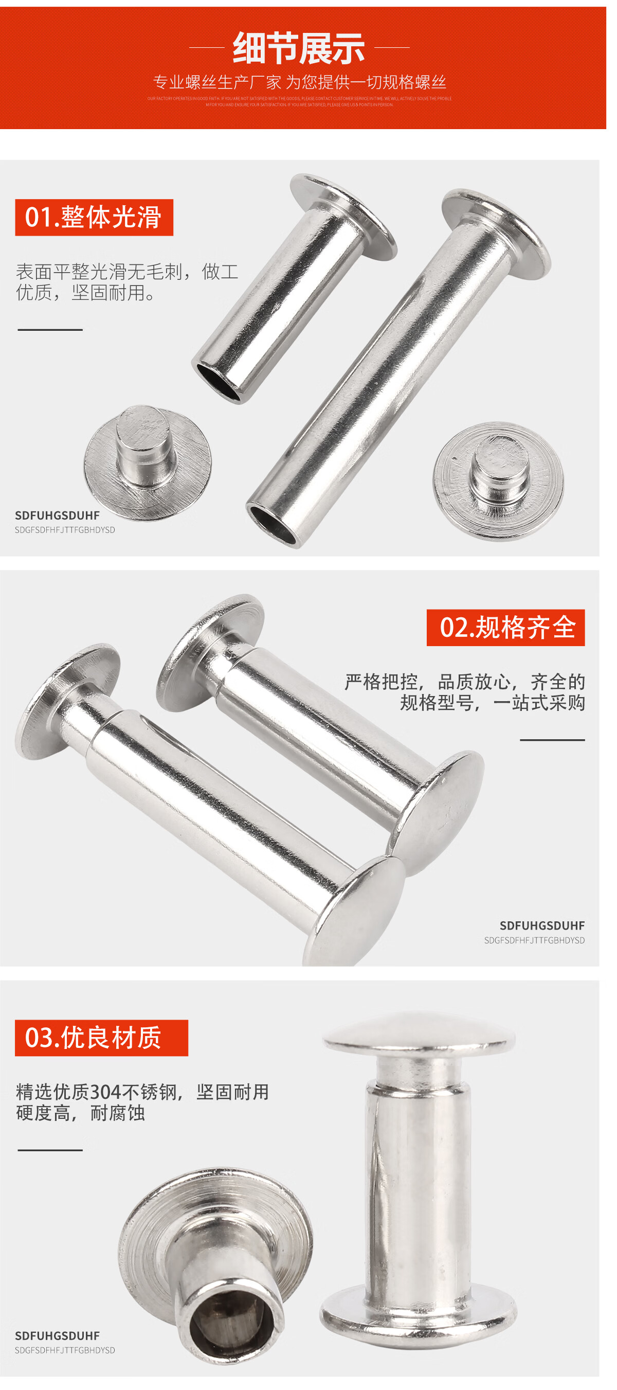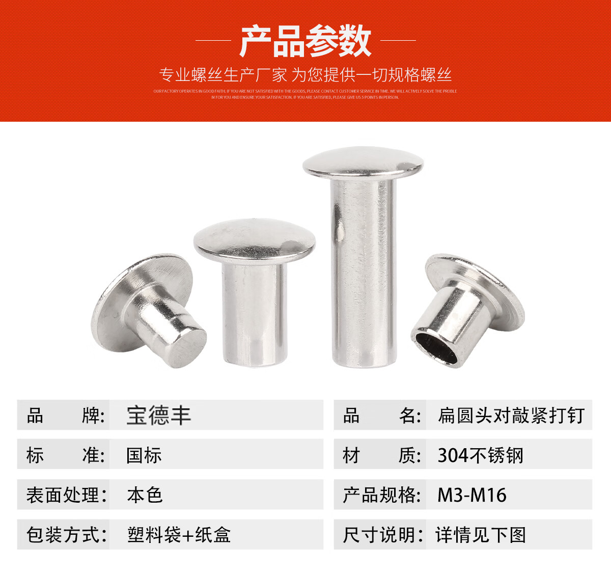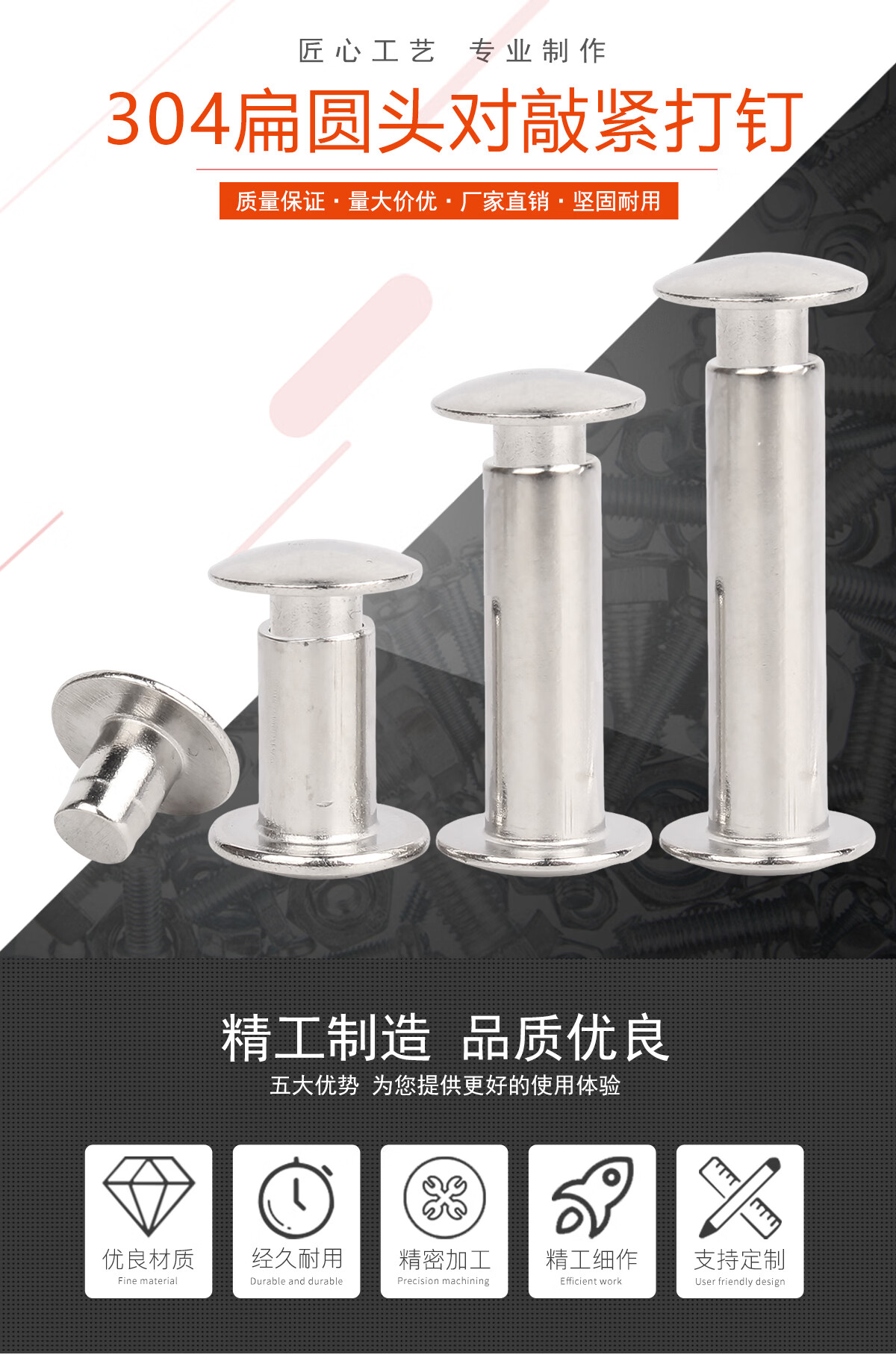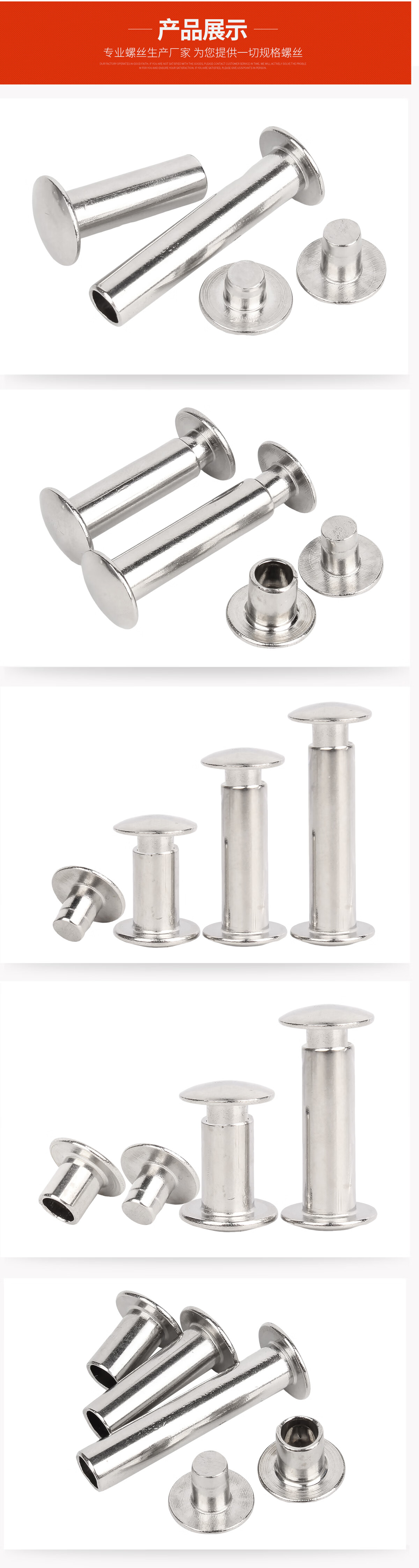 宝德丰304不锈钢扁圆头对敲子母铆钉公母对铆平头半空心书相册卡紧打钉 M3x4(50套)