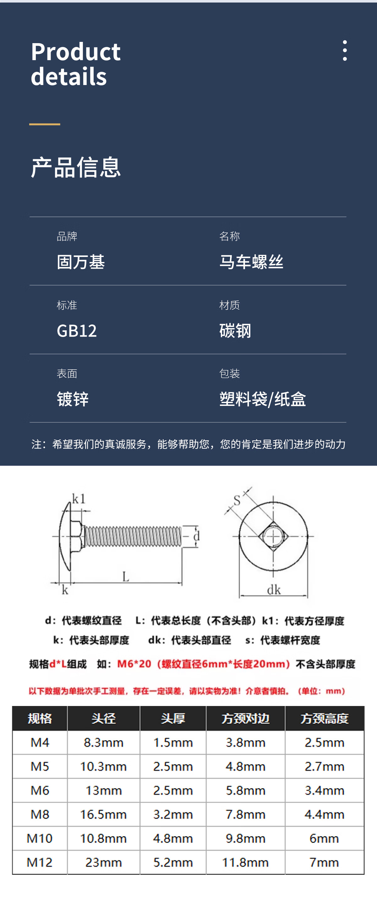 固万基(GUWANJI)镀锌马车螺栓大扁头半圆头货架螺栓GB12四方颈螺丝钉M4M5M6M8-M12 M10x110[20个]半牙