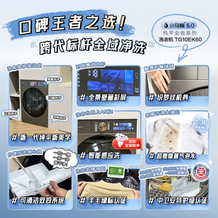 小天鹅(LittleSwan)小乌梅5.0跨代机皇 AWE同款 滚筒洗衣机全自动 10KG纯平全嵌 真1.36洗净比超微除菌气泡水以旧换新 【重磅新品】TG10EK60 滚筒单洗