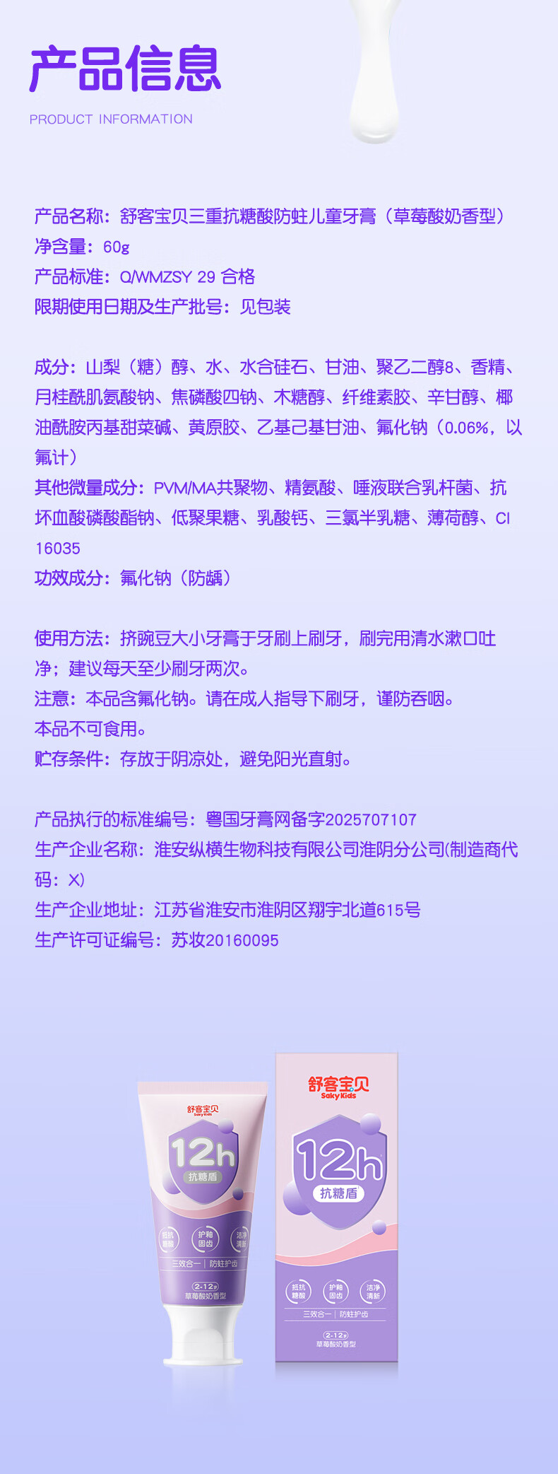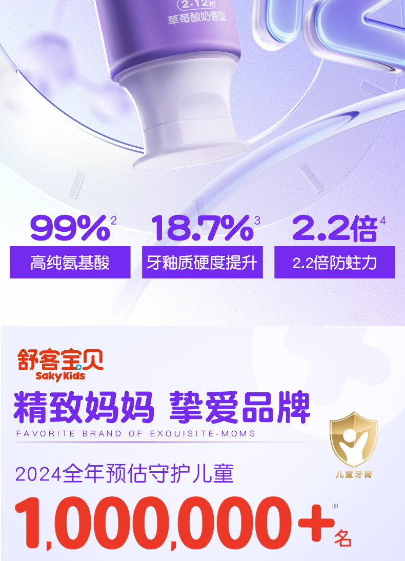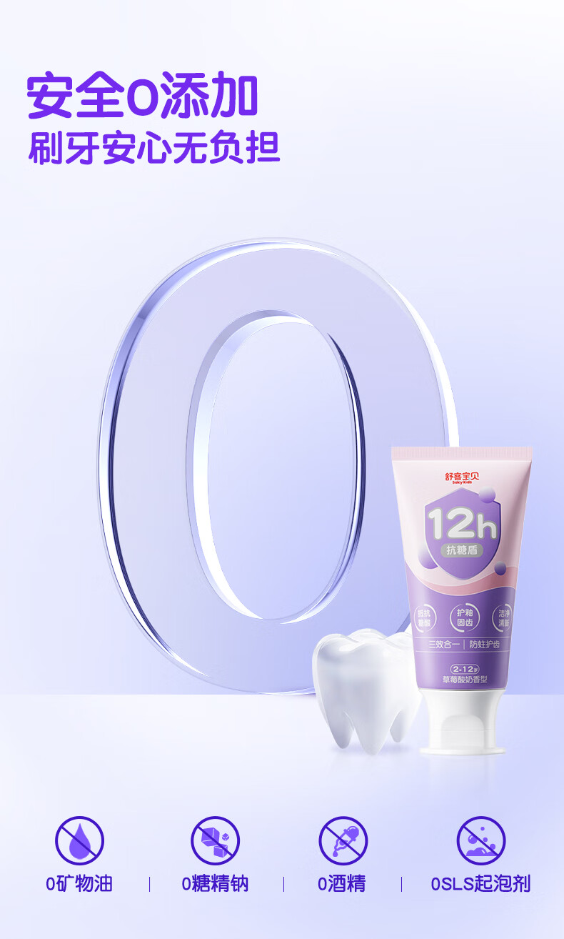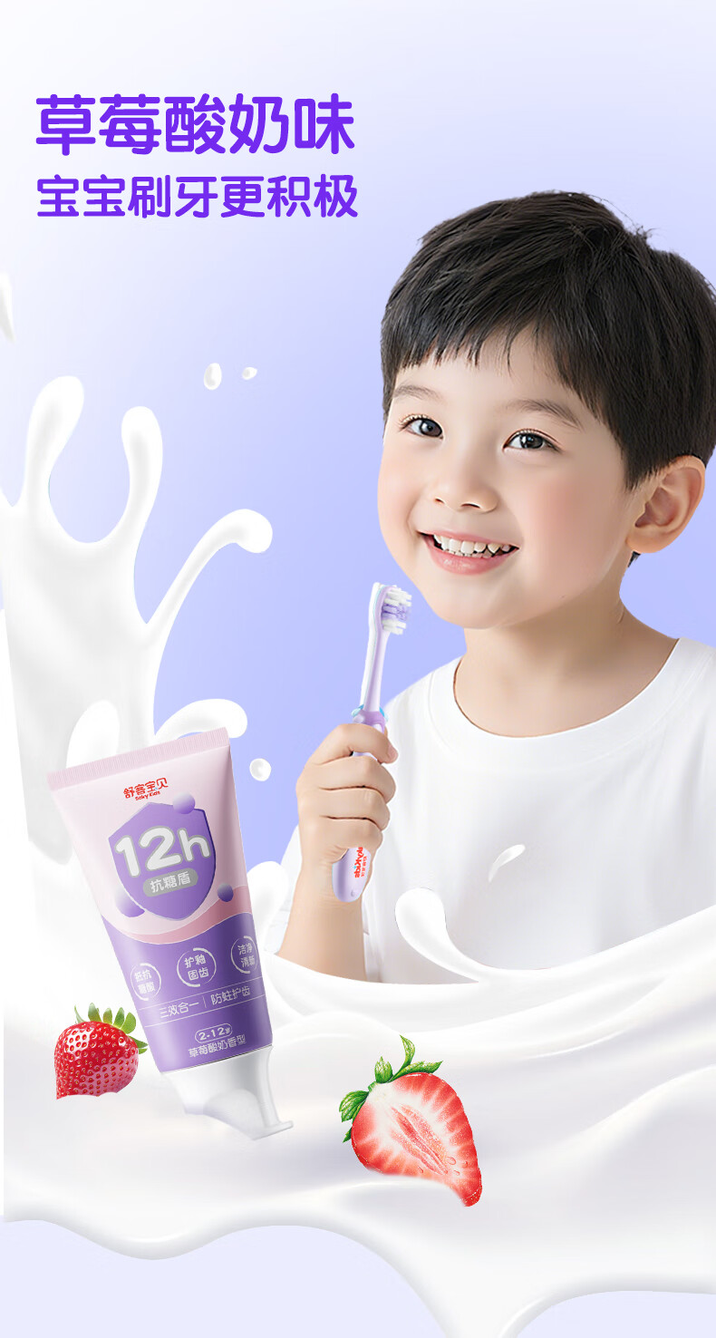 舒客宝贝(sakykids)牙膏抗糖防蛀青少年2-12岁含氟换牙期固齿护牙60g*3支装草莓味