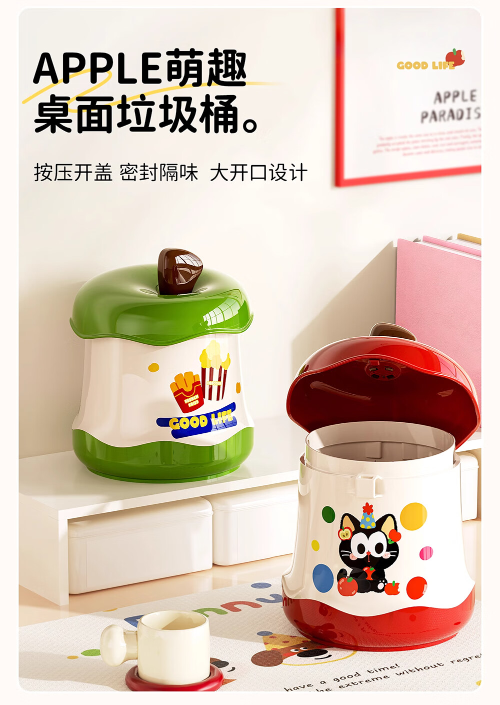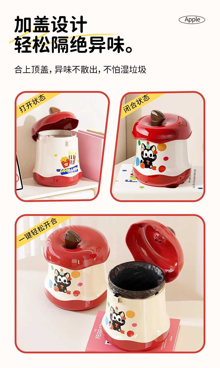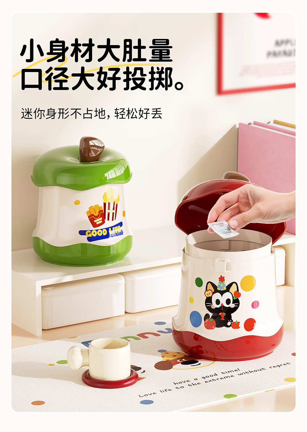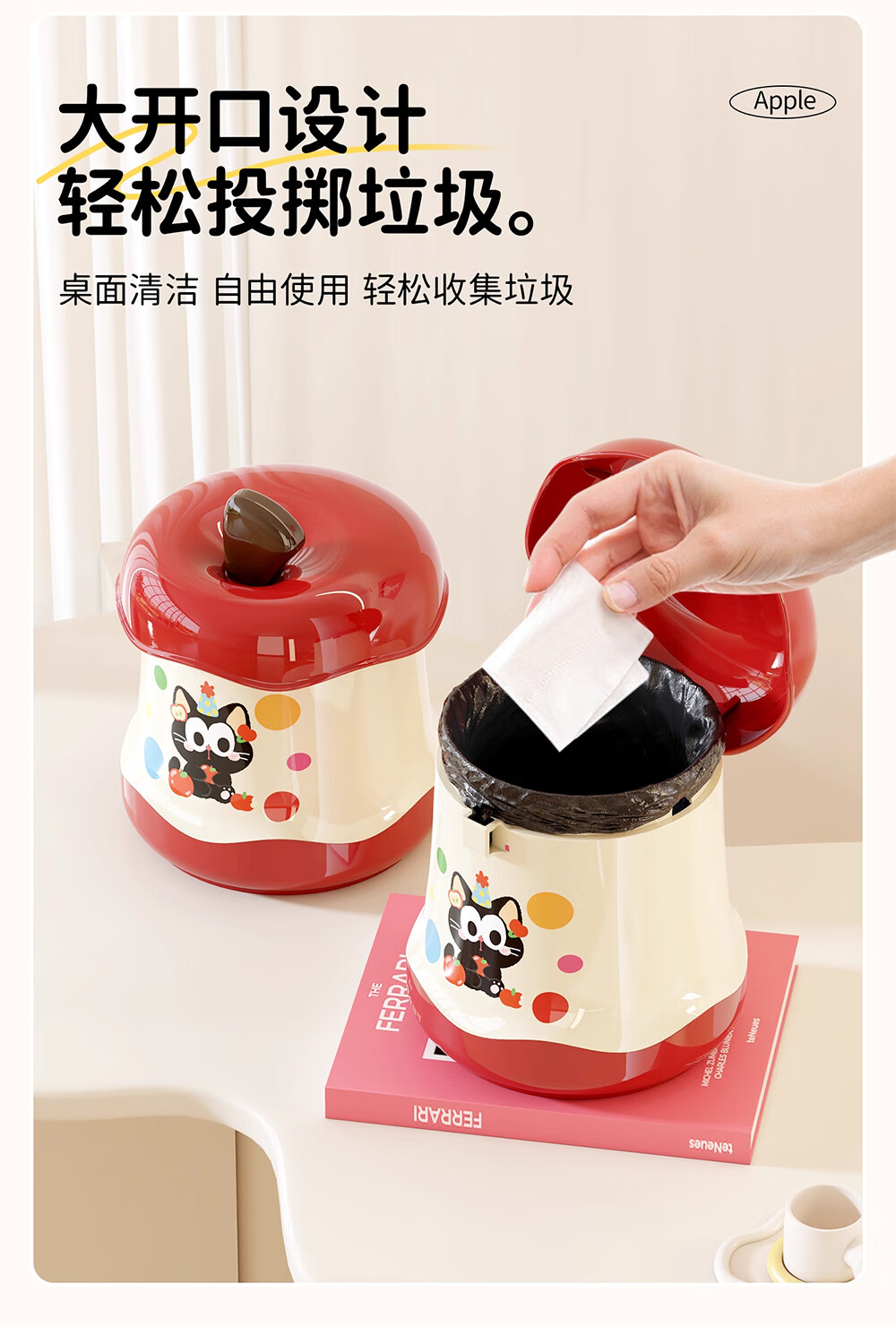 木格格桌面垃圾桶高颜值网红新款带盖可爱办公室宿舍桌上迷你小卫生纸篓 红苹果+波点猫【按压弹盖/萌趣造型】