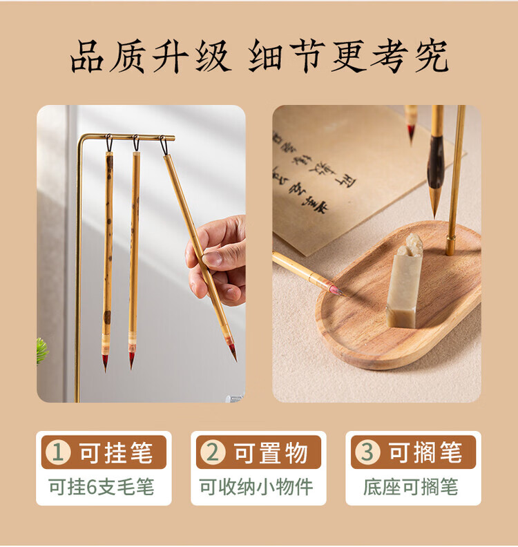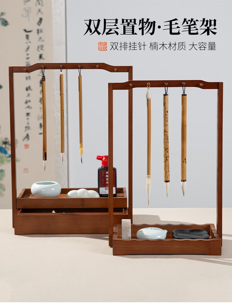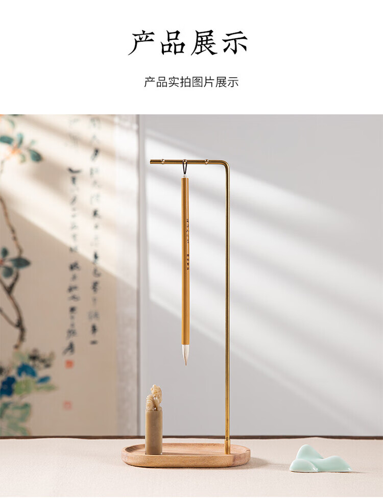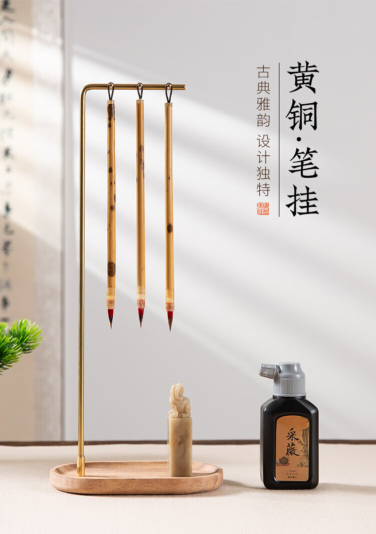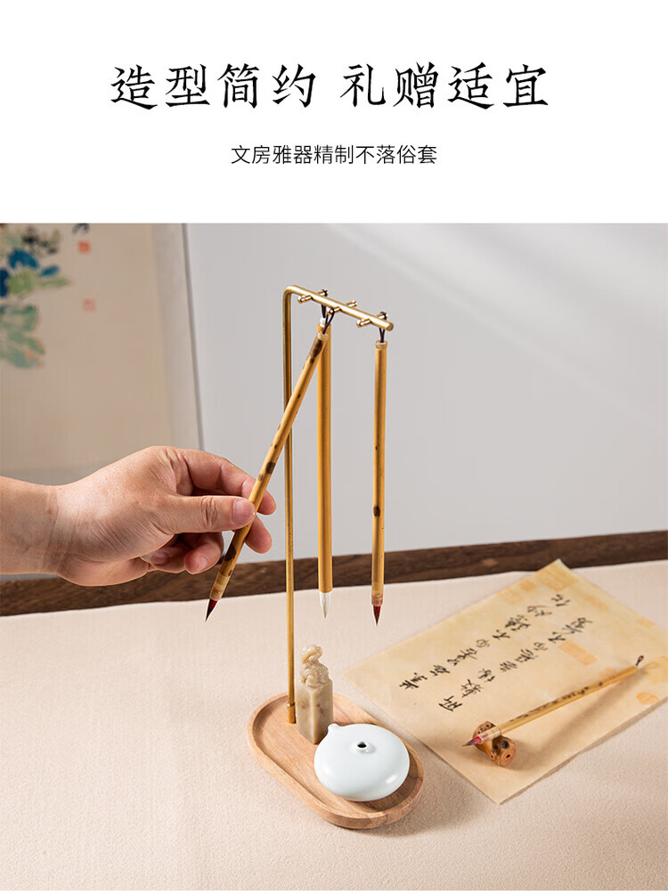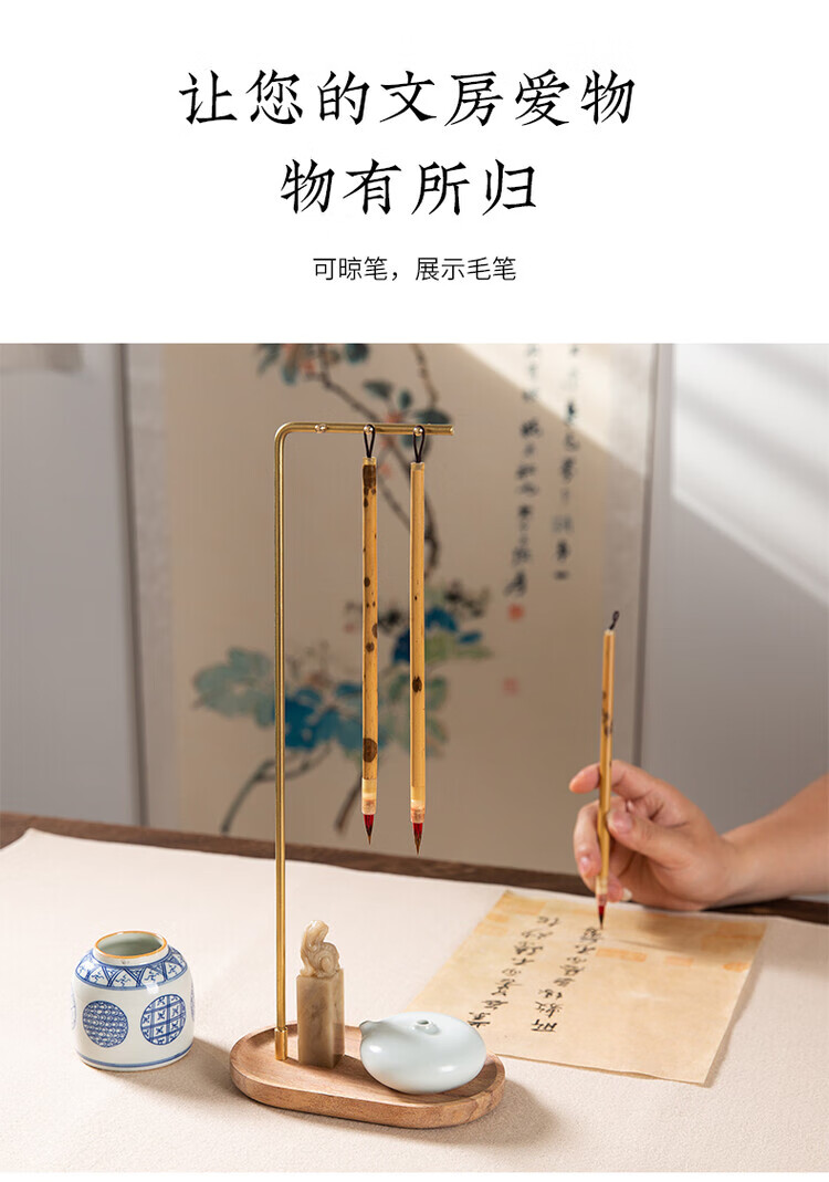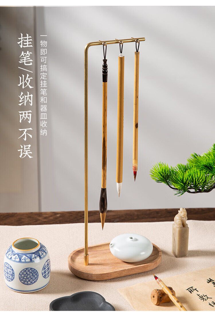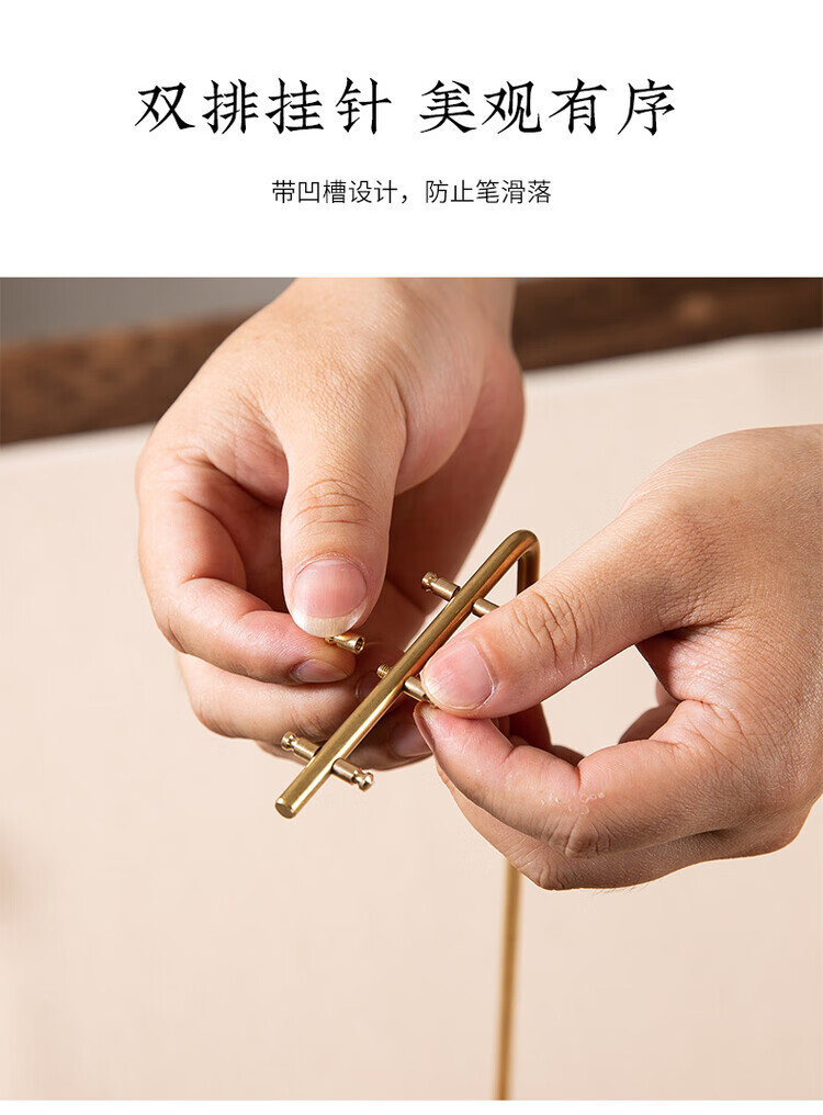 梅林笔庄黄铜笔挂怀古毛笔架新中式多功能实木铜针架子古风创意办公室桌面简约收纳置物架挂架文房四宝摆件 【单层】楠竹毛笔架