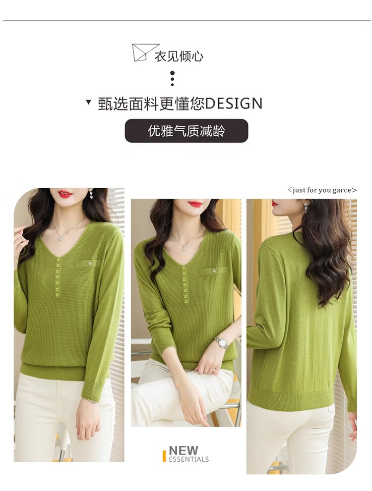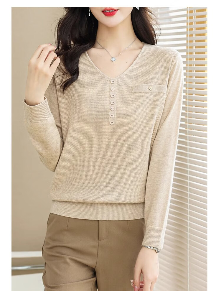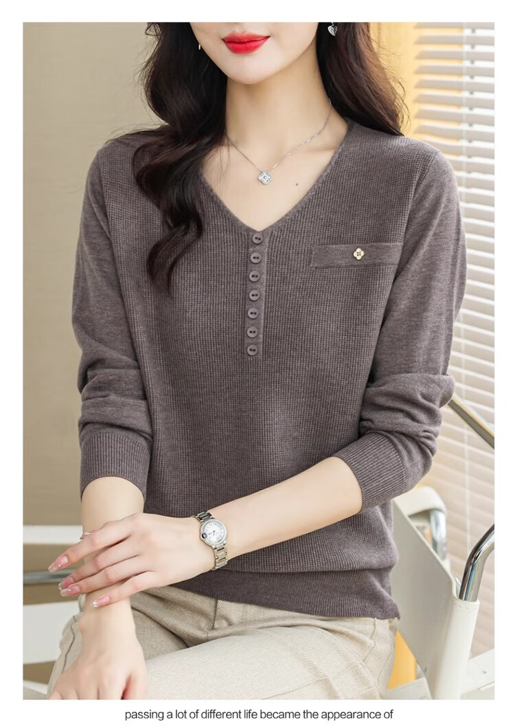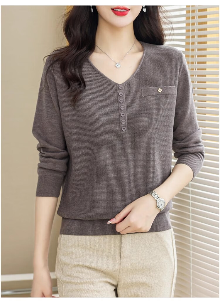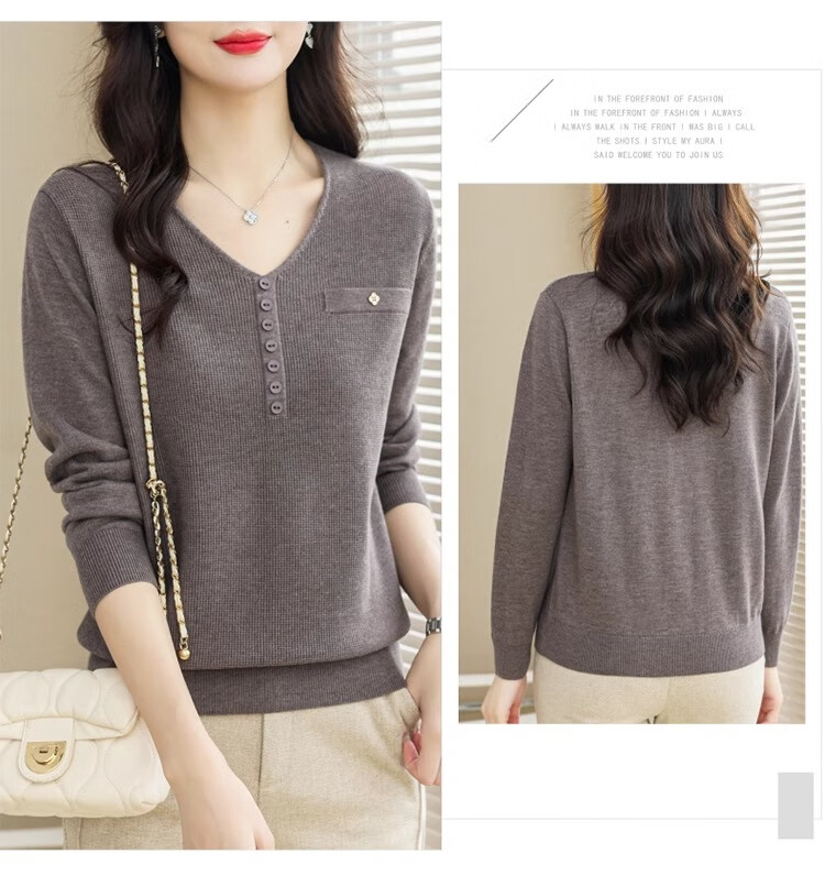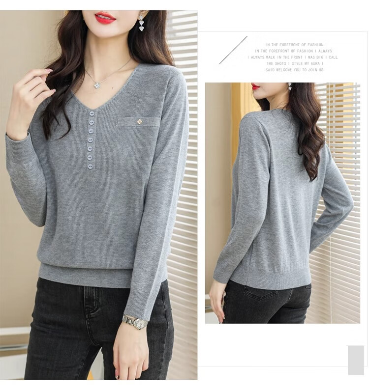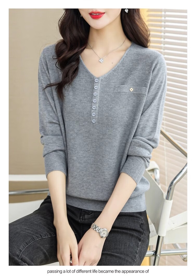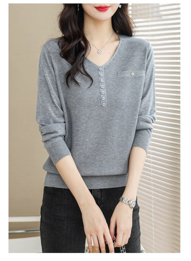 香影芬针织衫女长袖春秋装遮肚子上衣v领时尚毛衣女洋气内搭针织打底衫 灰色 XL (建议115-125斤)