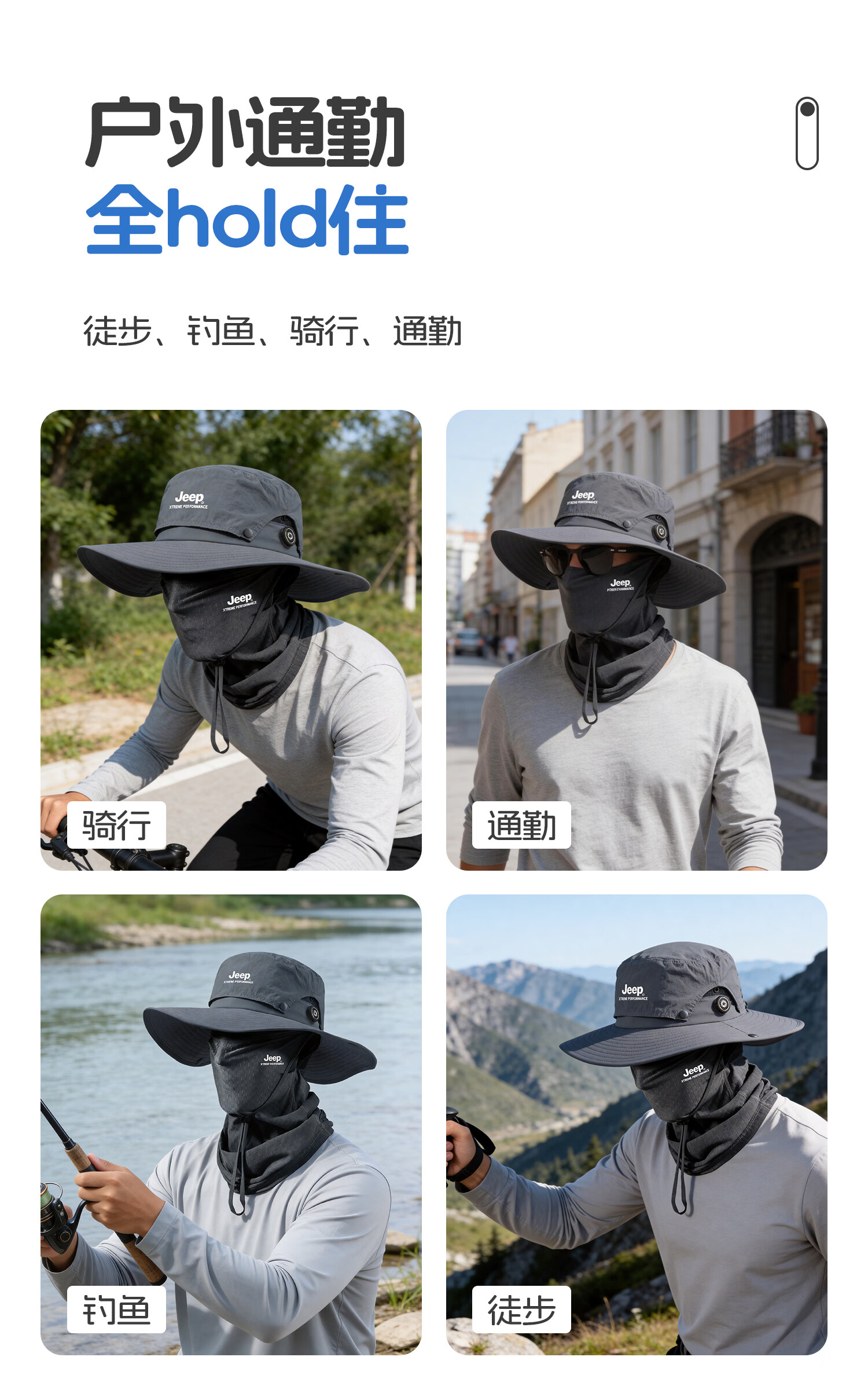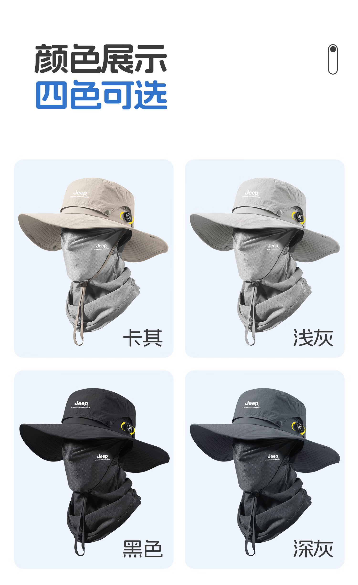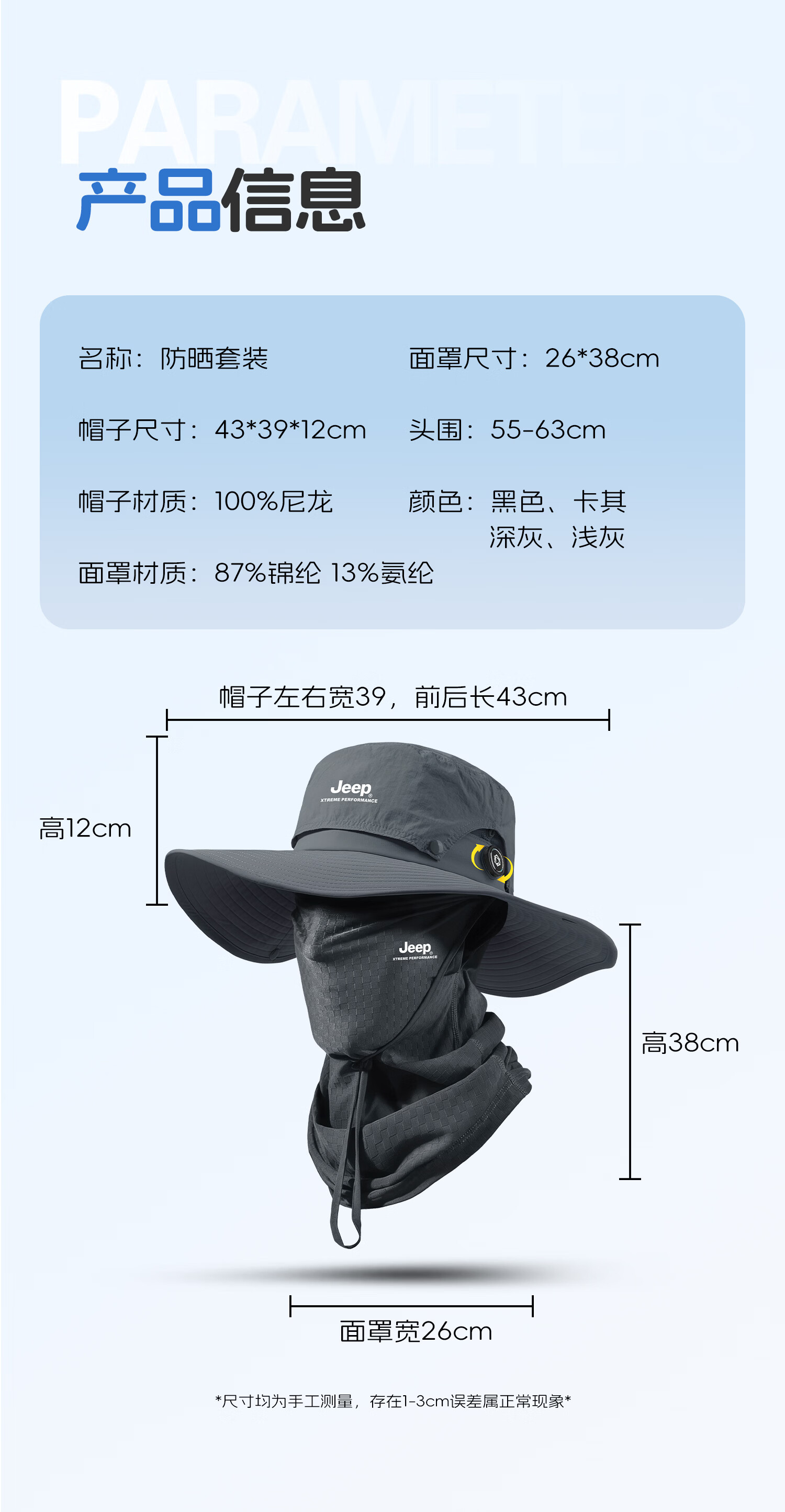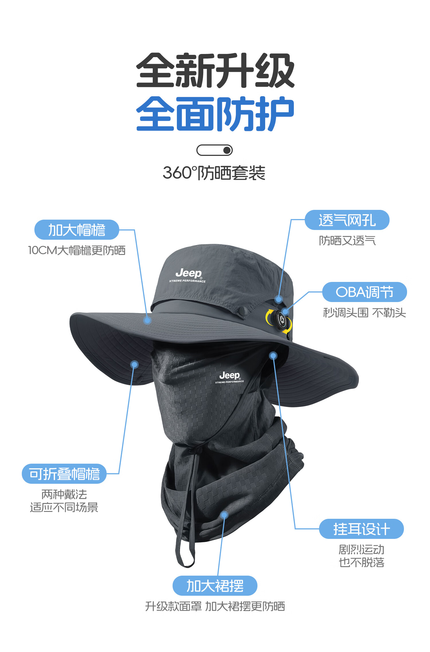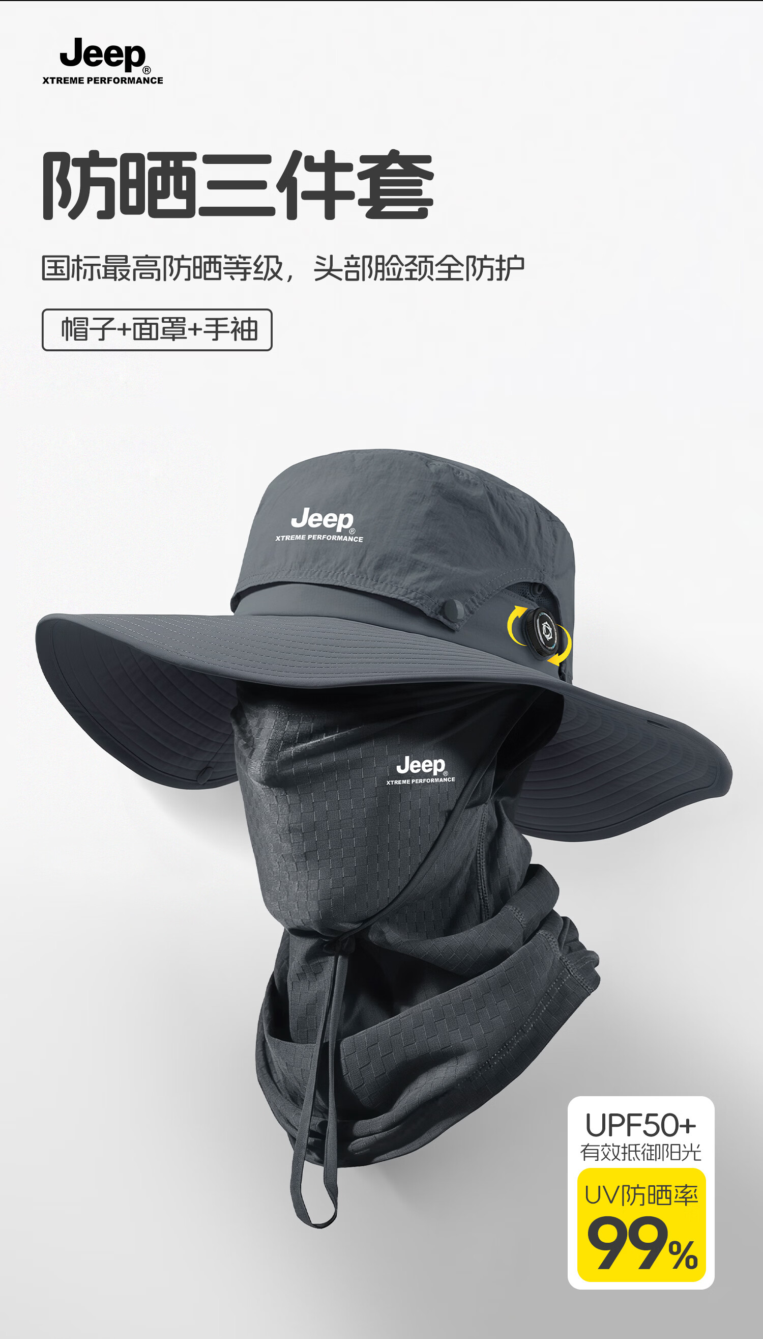 JEEP男士夏季出行透气防晒帽登山遮阳帽户外钓鱼帽大帽檐渔夫帽子男 黑色三件套【帽子+面罩+手袖】送墨镜 均码 【可旋钮调节】