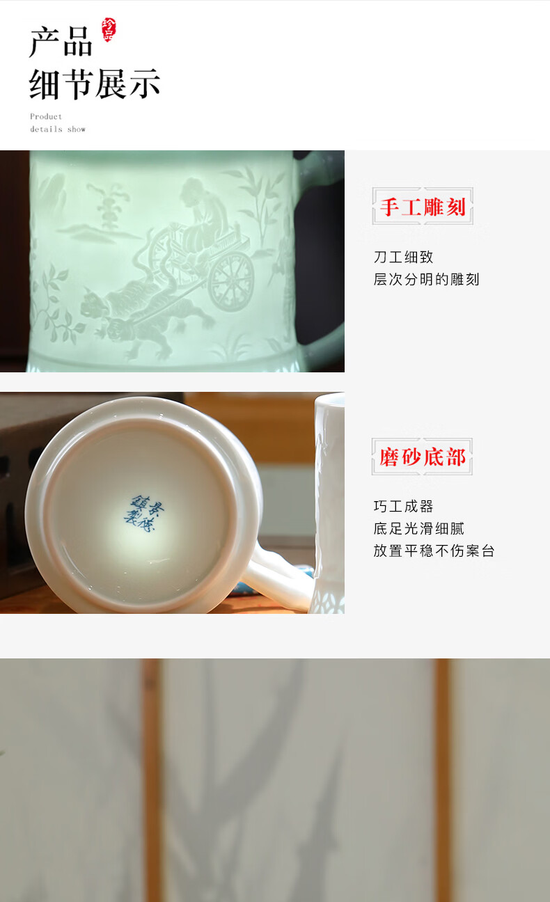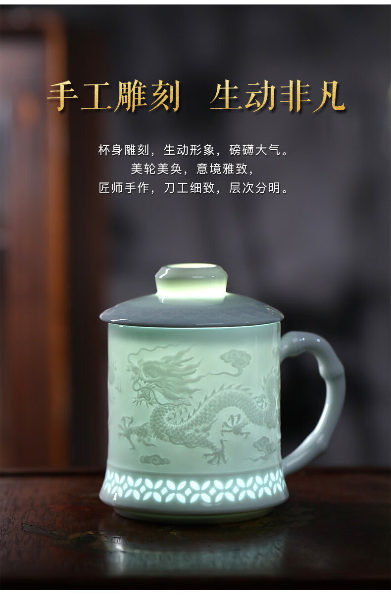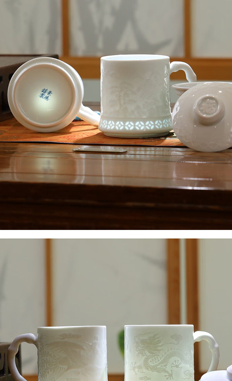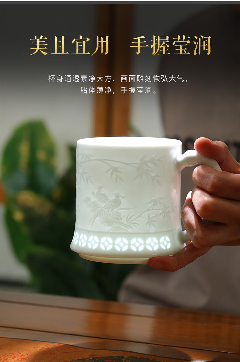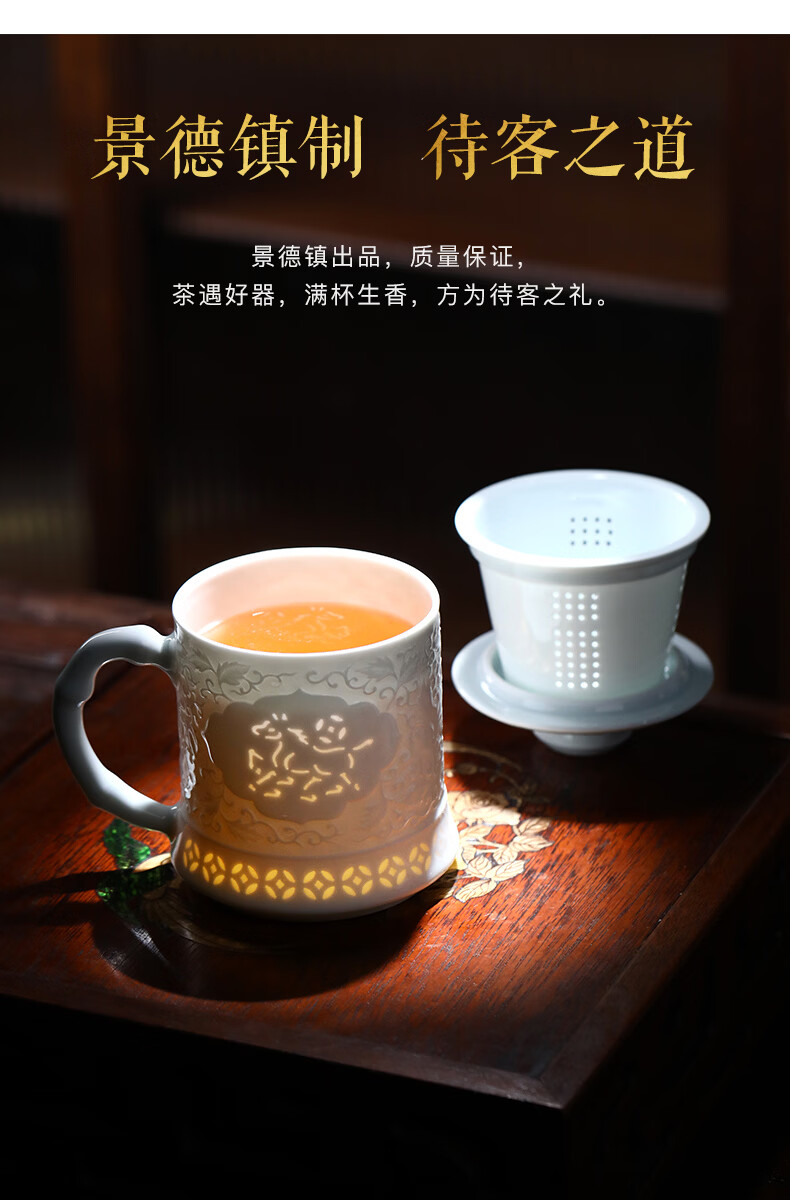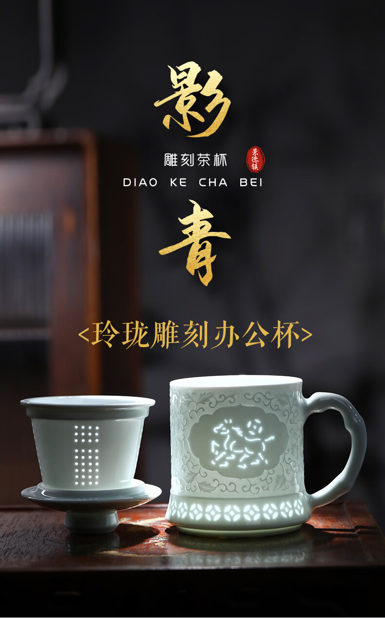 御嘉斋景德镇陶瓷茶杯高档大容量带盖杯马克杯子家用办公室礼物 影青玲珑办公杯-大好河山礼盒装