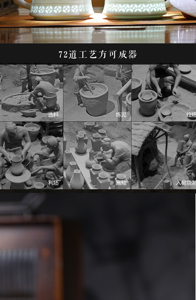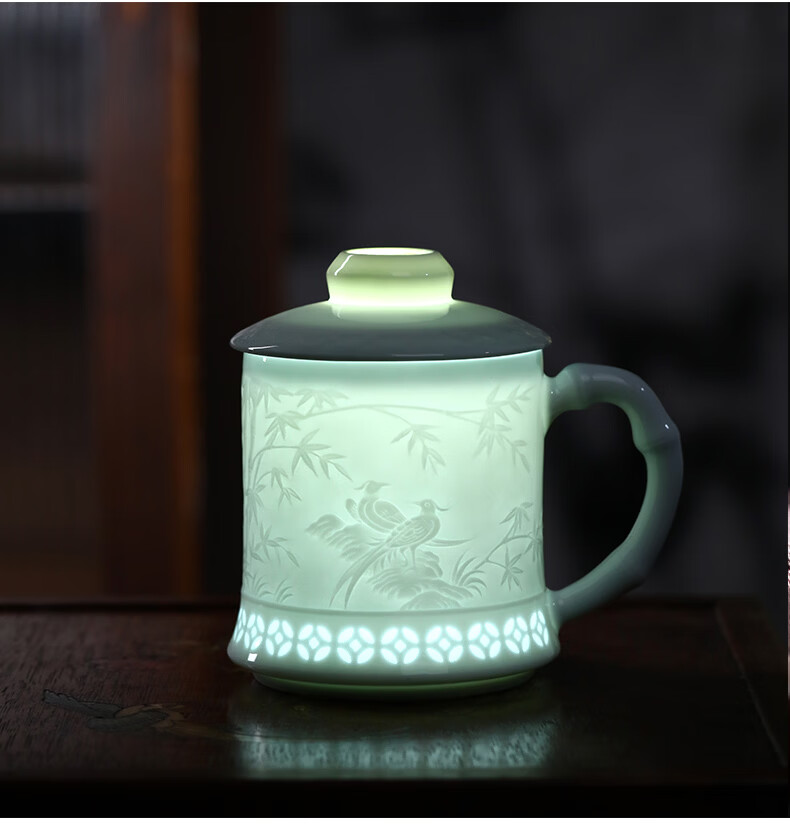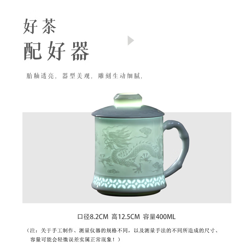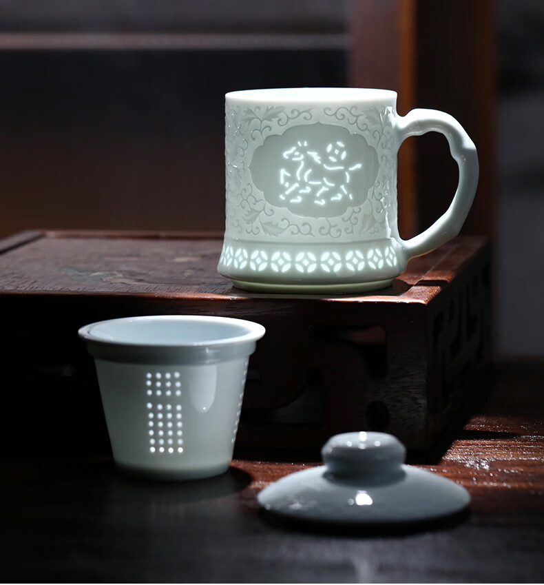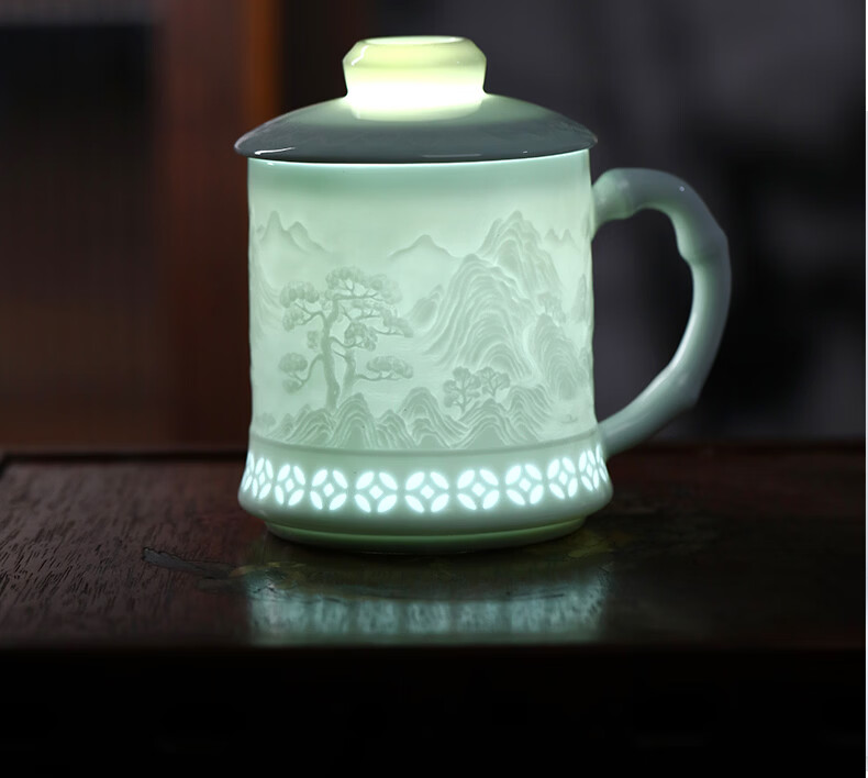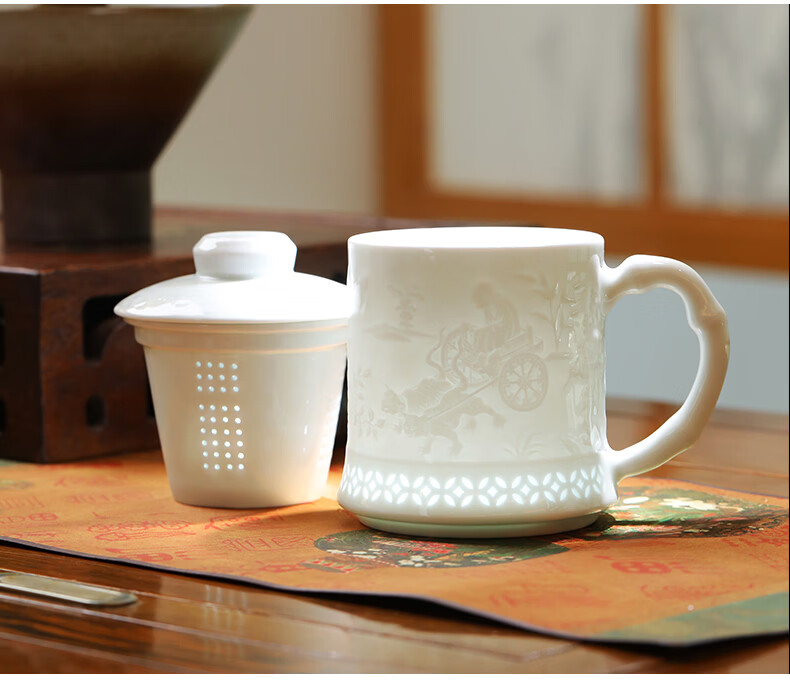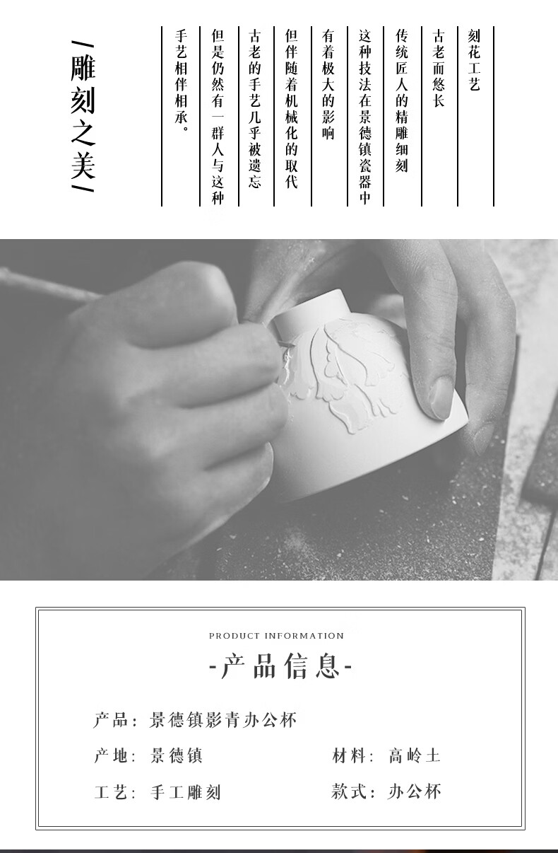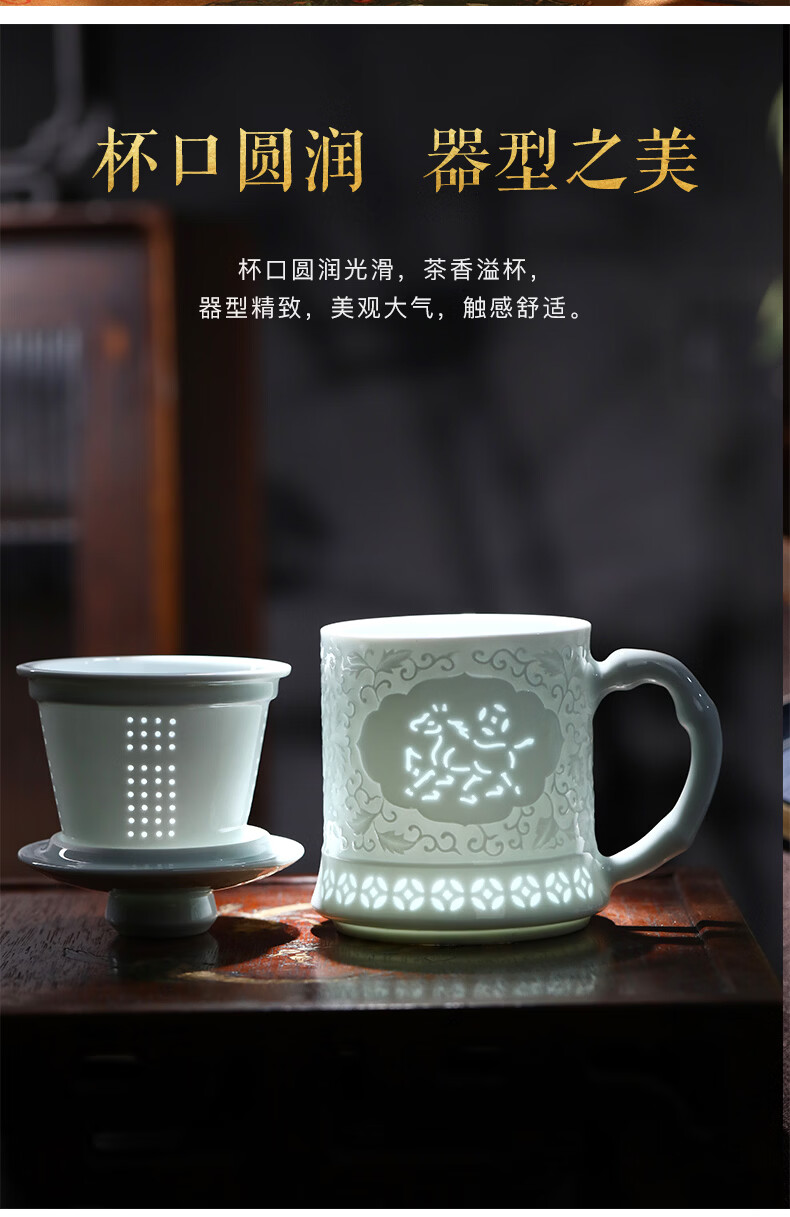 御嘉斋景德镇陶瓷茶杯高档大容量带盖杯马克杯子家用办公室礼物 影青玲珑办公杯-大好河山礼盒装