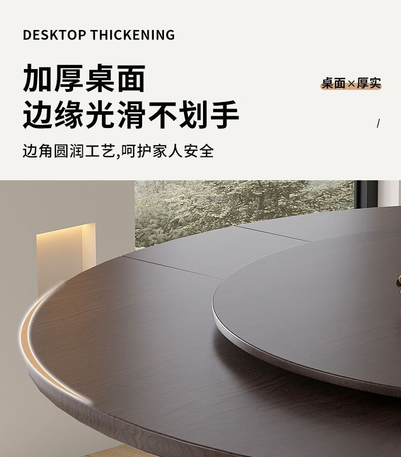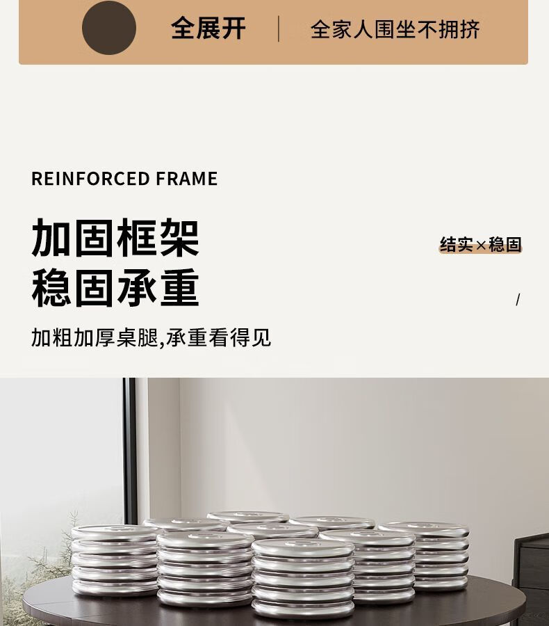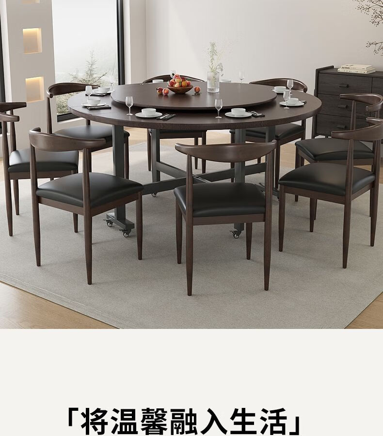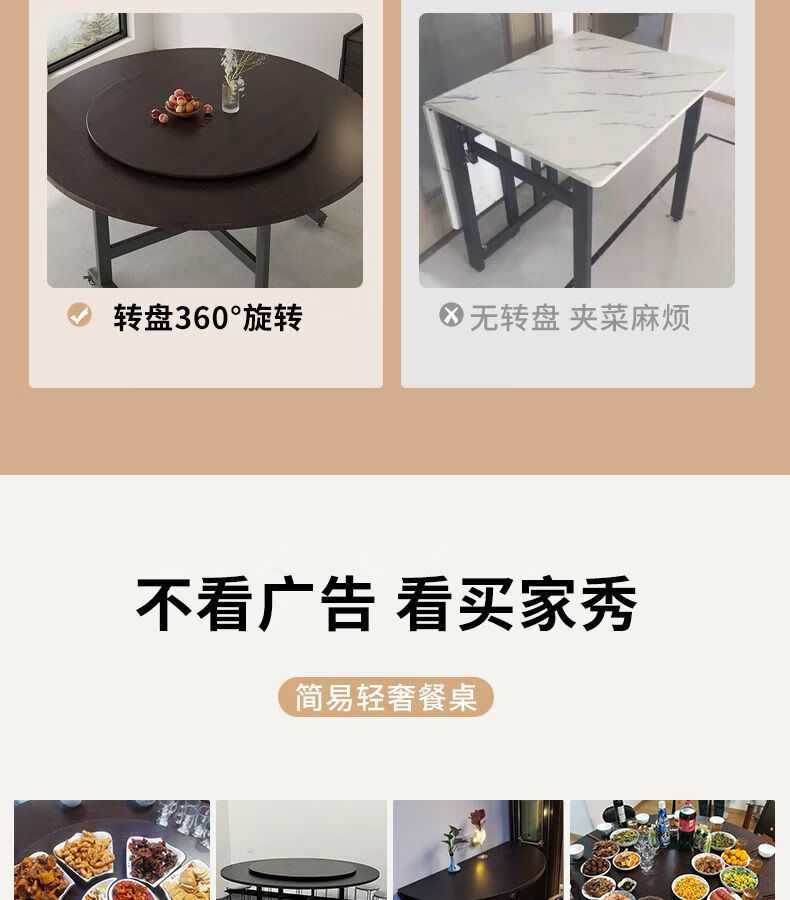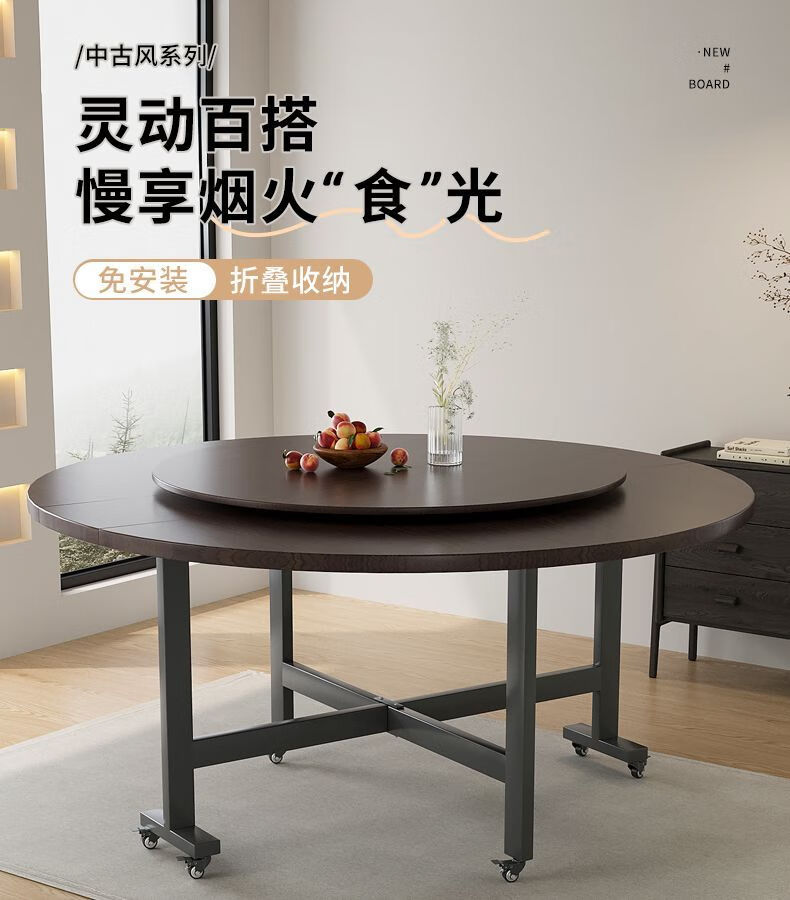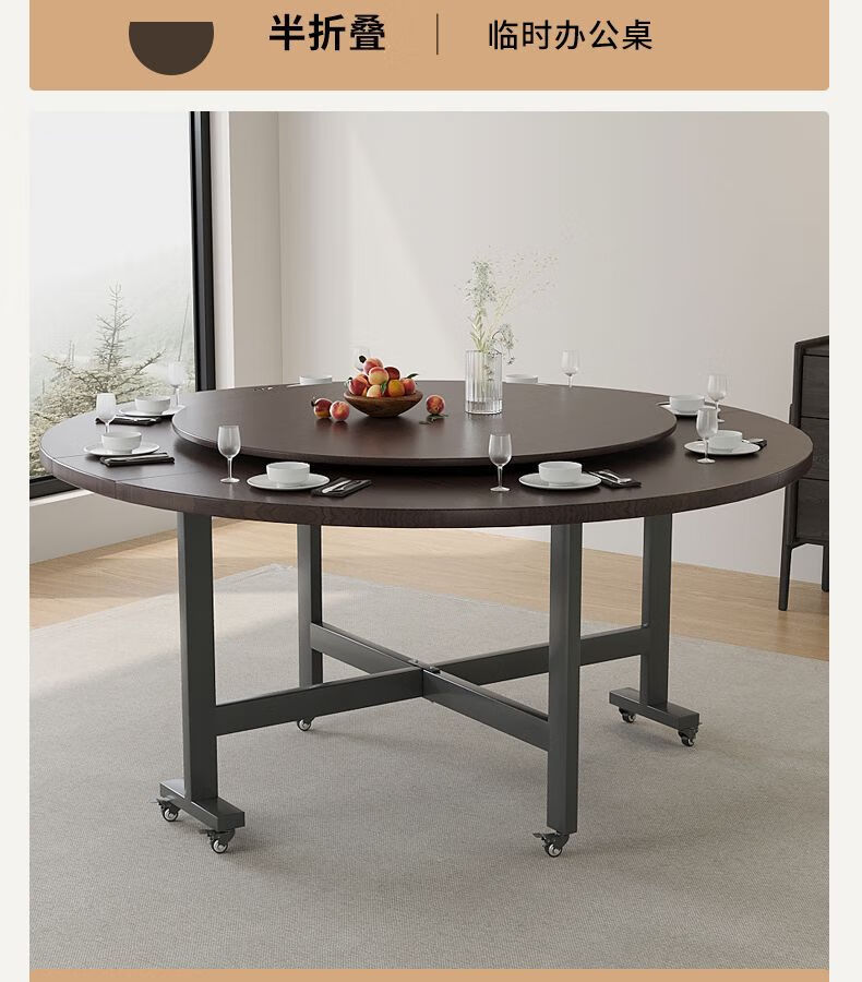 科虎折叠餐桌家用小户型带转盘大圆桌多功能吃饭桌子 黄木纹 圆凳