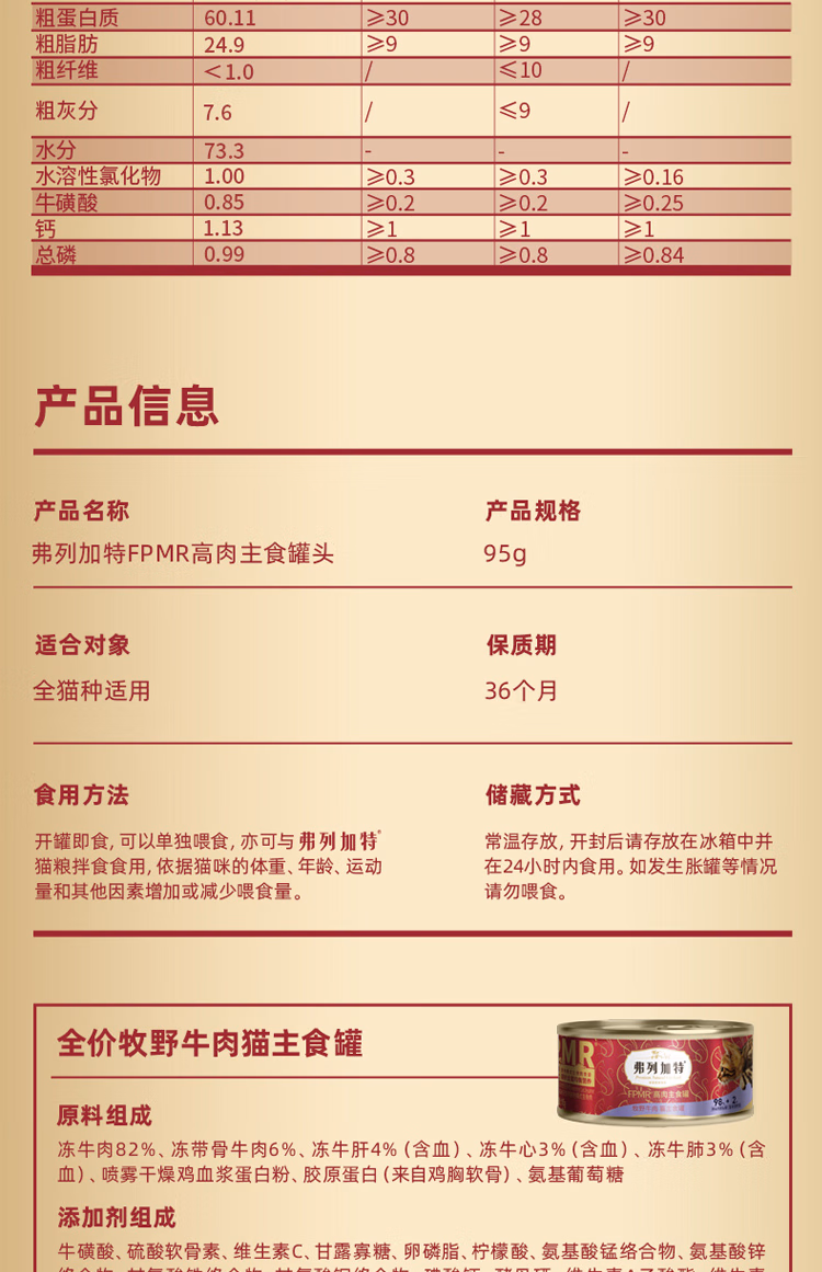 弗列加特98%高含肉量 国产猫罐头95g 主食罐全猫幼猫成猫通用 湿粮猫罐头 【尝鲜试用】牧野牛肉味95g
