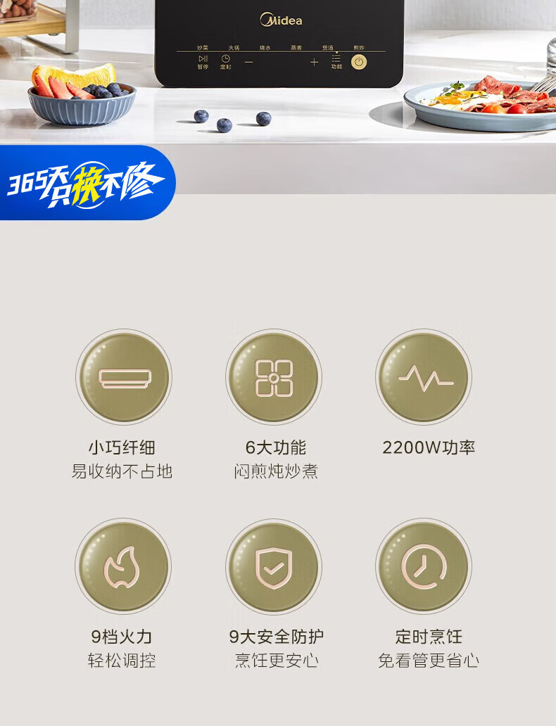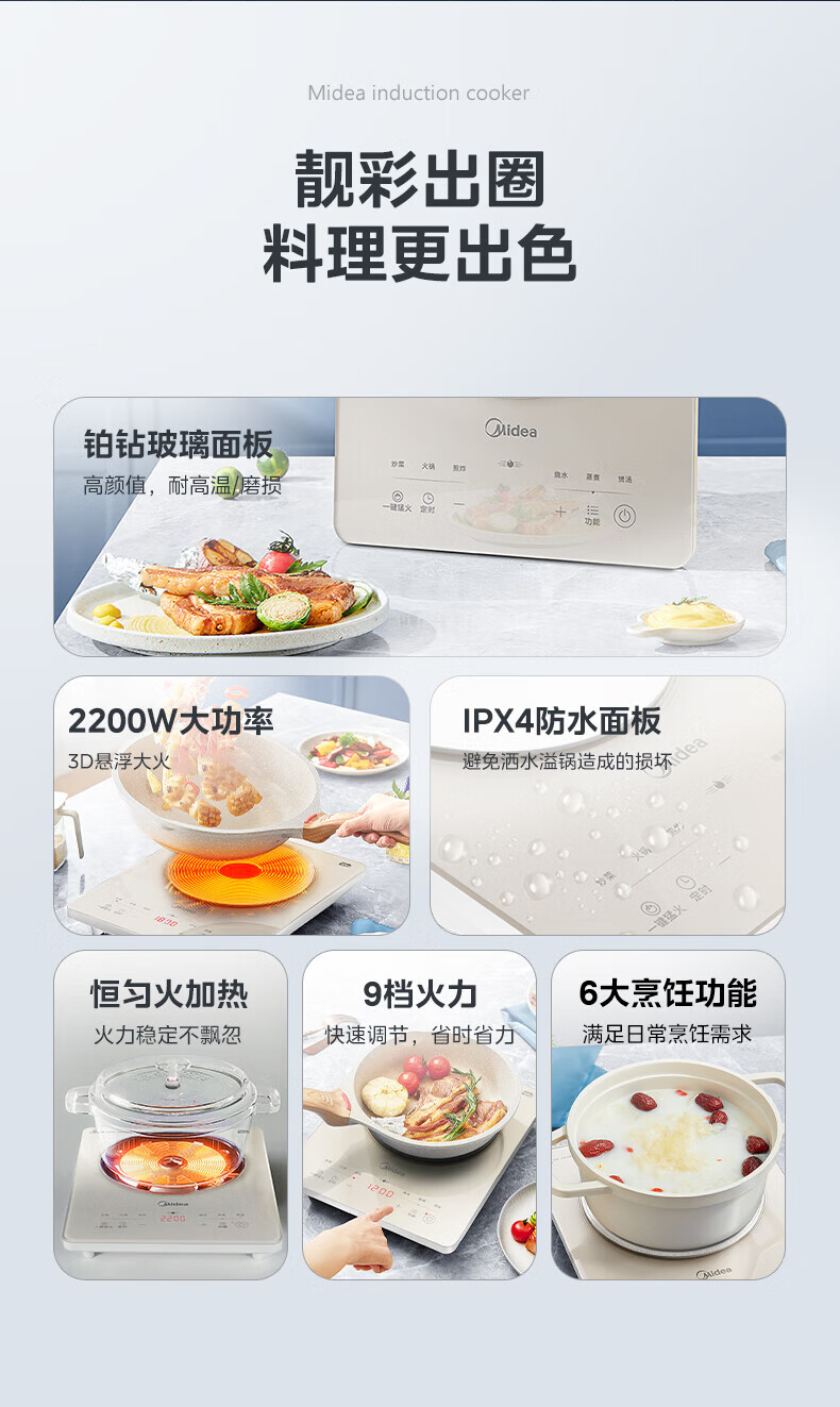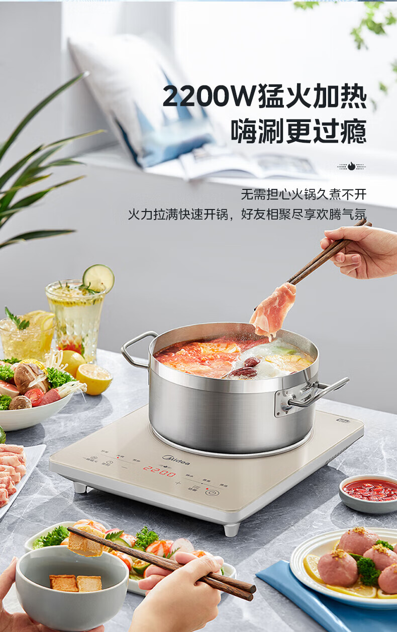 美的(Midea) 电磁炉大功率家用 防水面板2200W大功率 炒菜火锅不粘炒锅一体小型电磁灶 【铂钻面板】E22B23 电磁炉