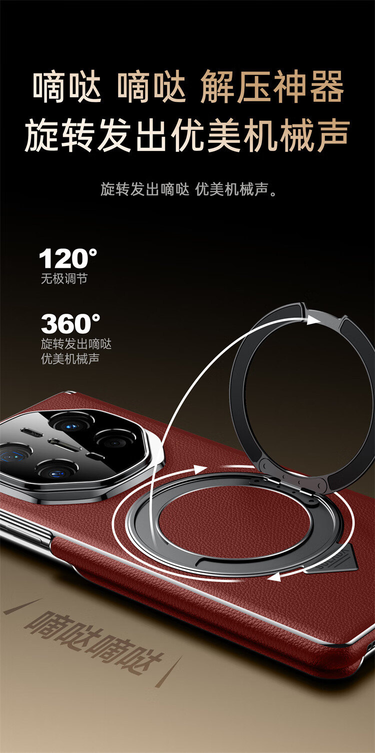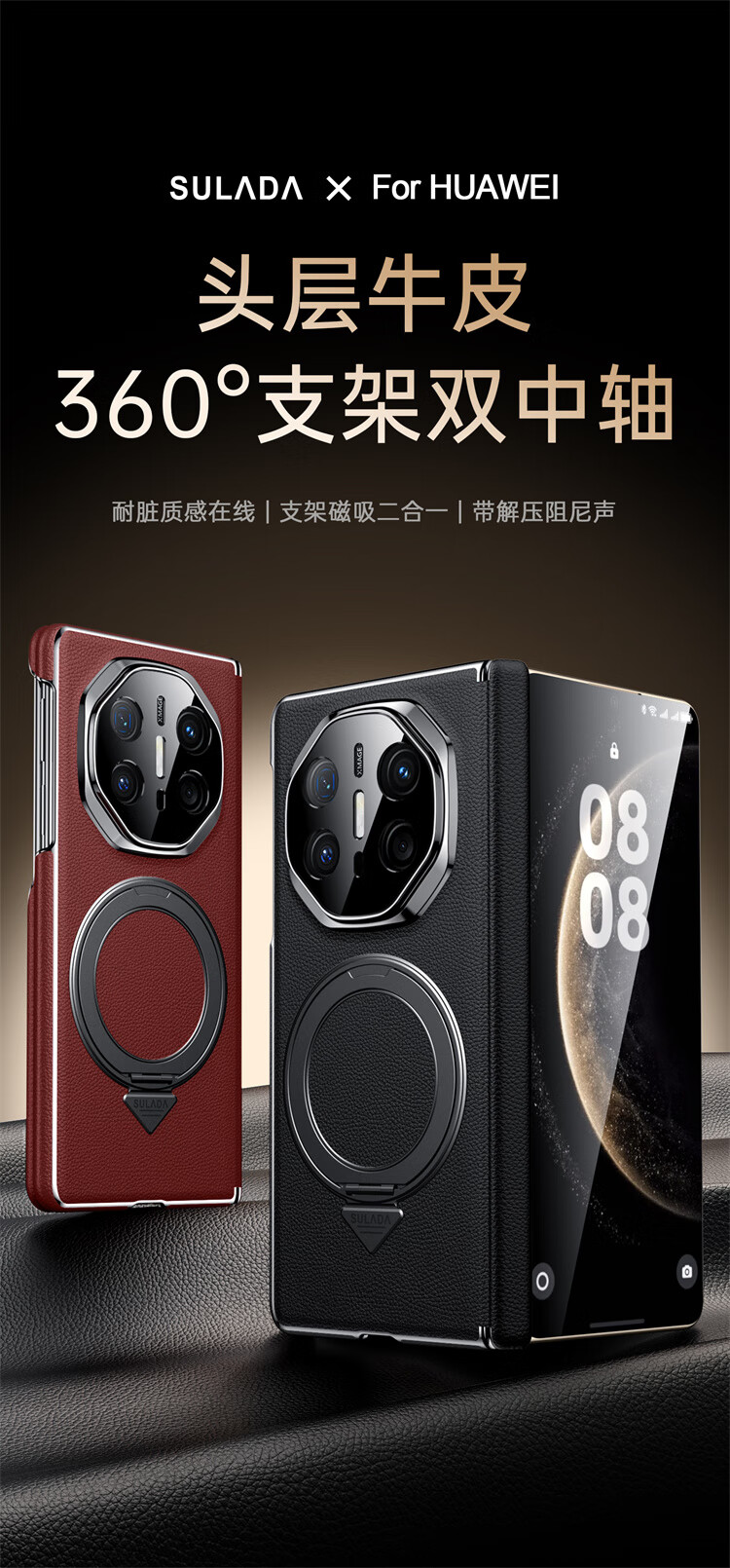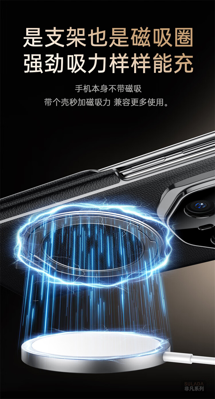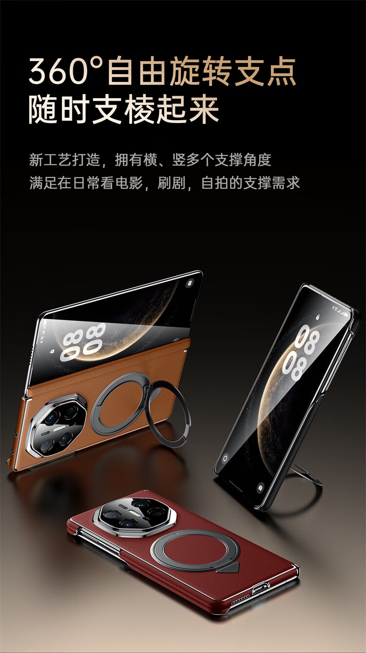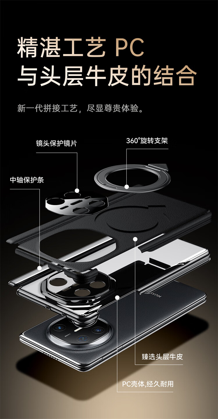 苏拉达适用华为MateX6/X5手机壳真皮旋转支架XTs防摔磁吸双中轴X3保护套 【羽砂黑】双边中轴全包后壳 华为 Mate X6 典藏版