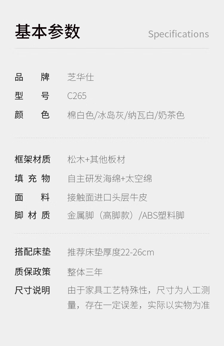 芝华仕(CHEERS)五星皮床主卧室大床双人床真皮床现代软包吐司床芝华士C265白1.8m