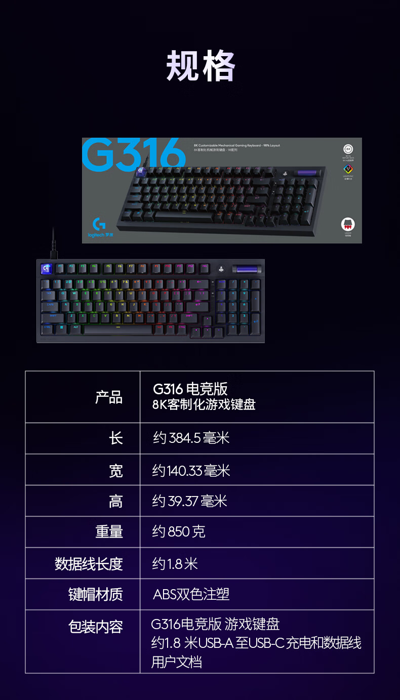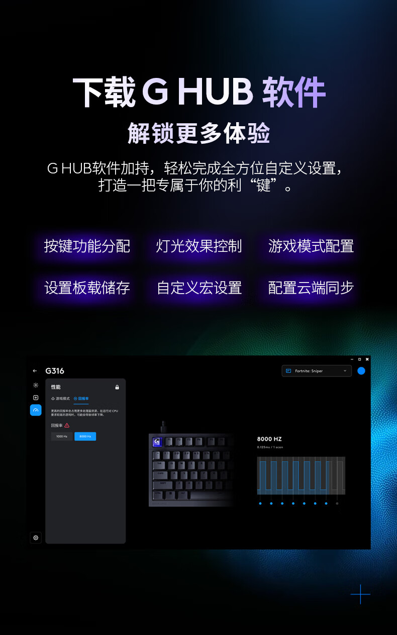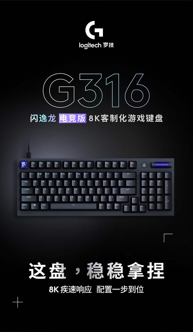 罗技(G)闪逸龙 G316电竞版 8K客制化游戏键盘黑色L轴(线性轴 顺滑连贯)