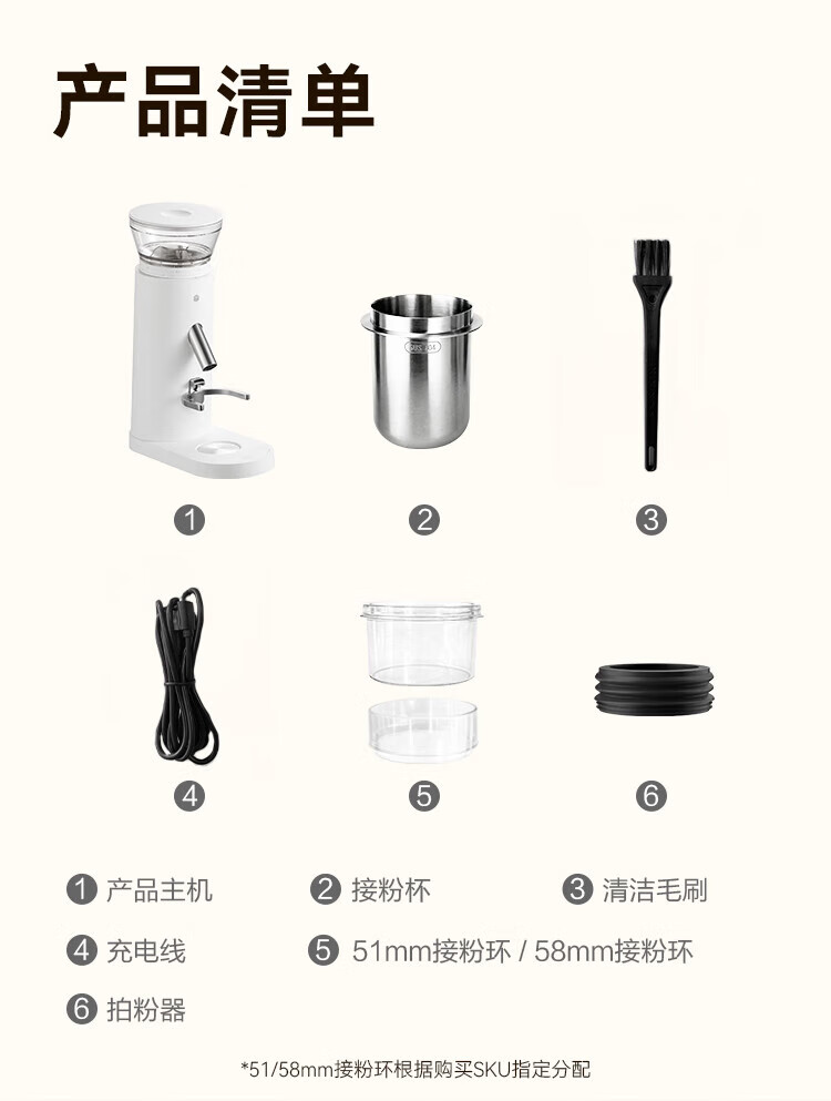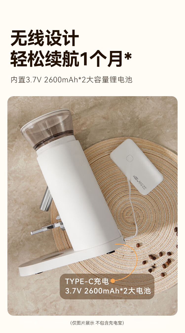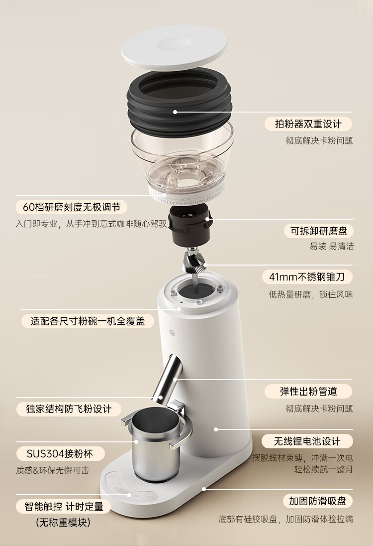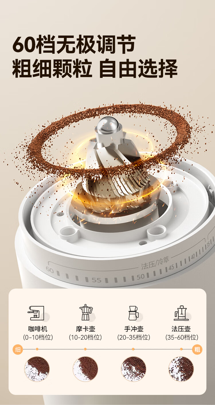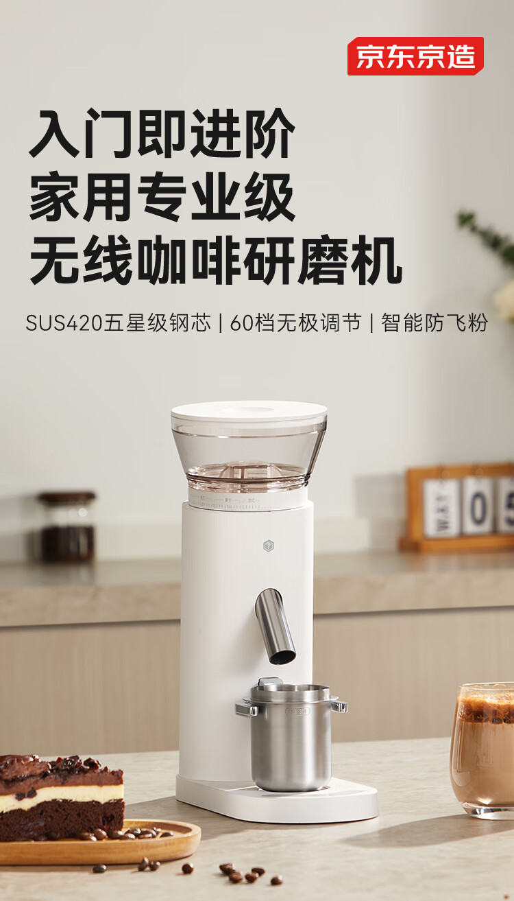 京东京造电动无线咖啡磨豆机防飞粉设计60档调节奶油白51mm手柄支架/接粉杯两用