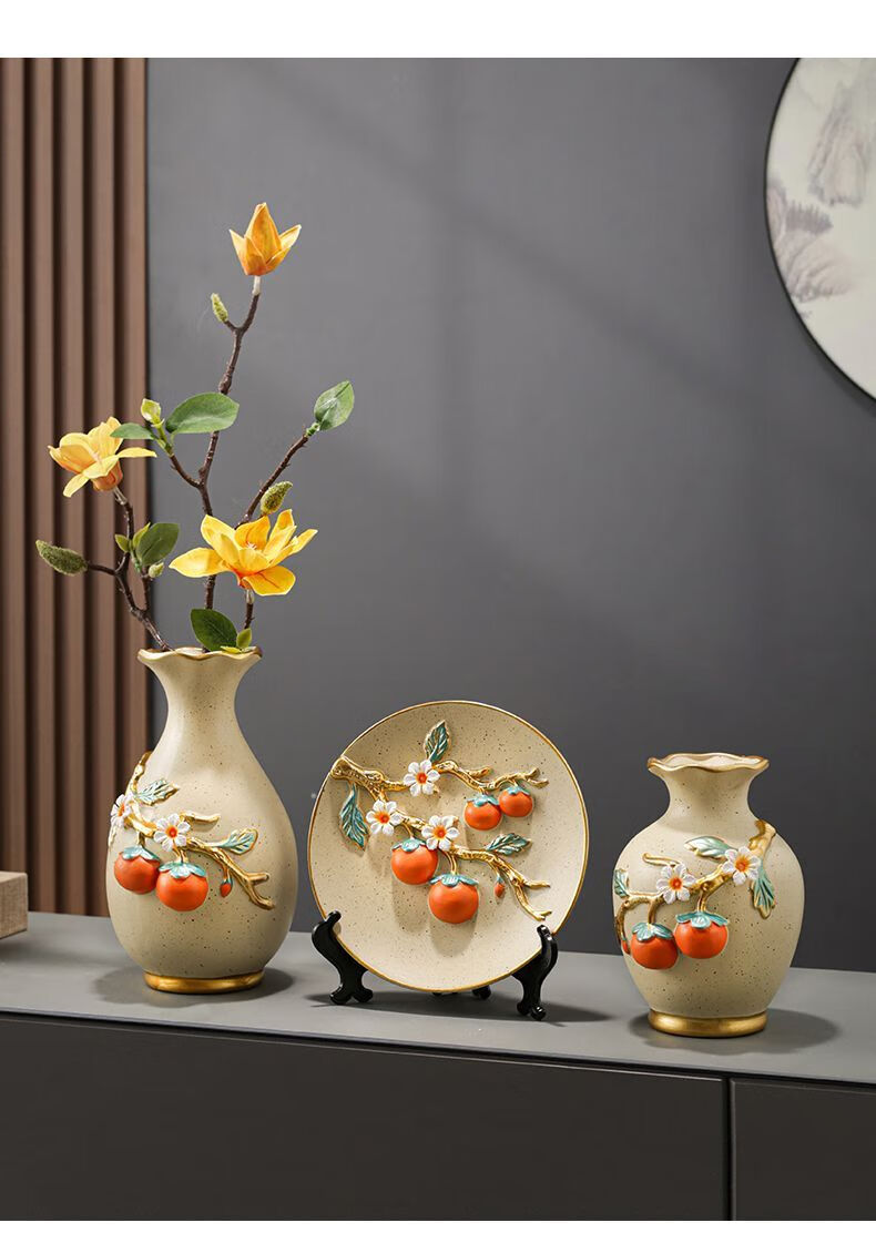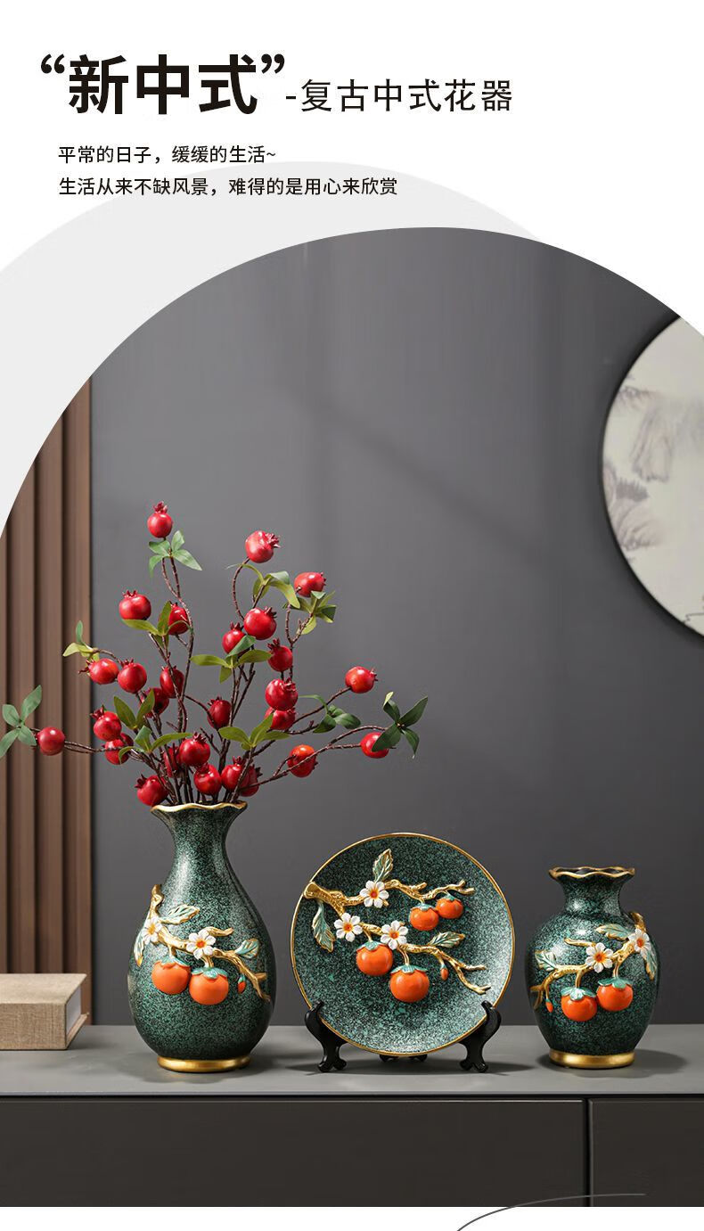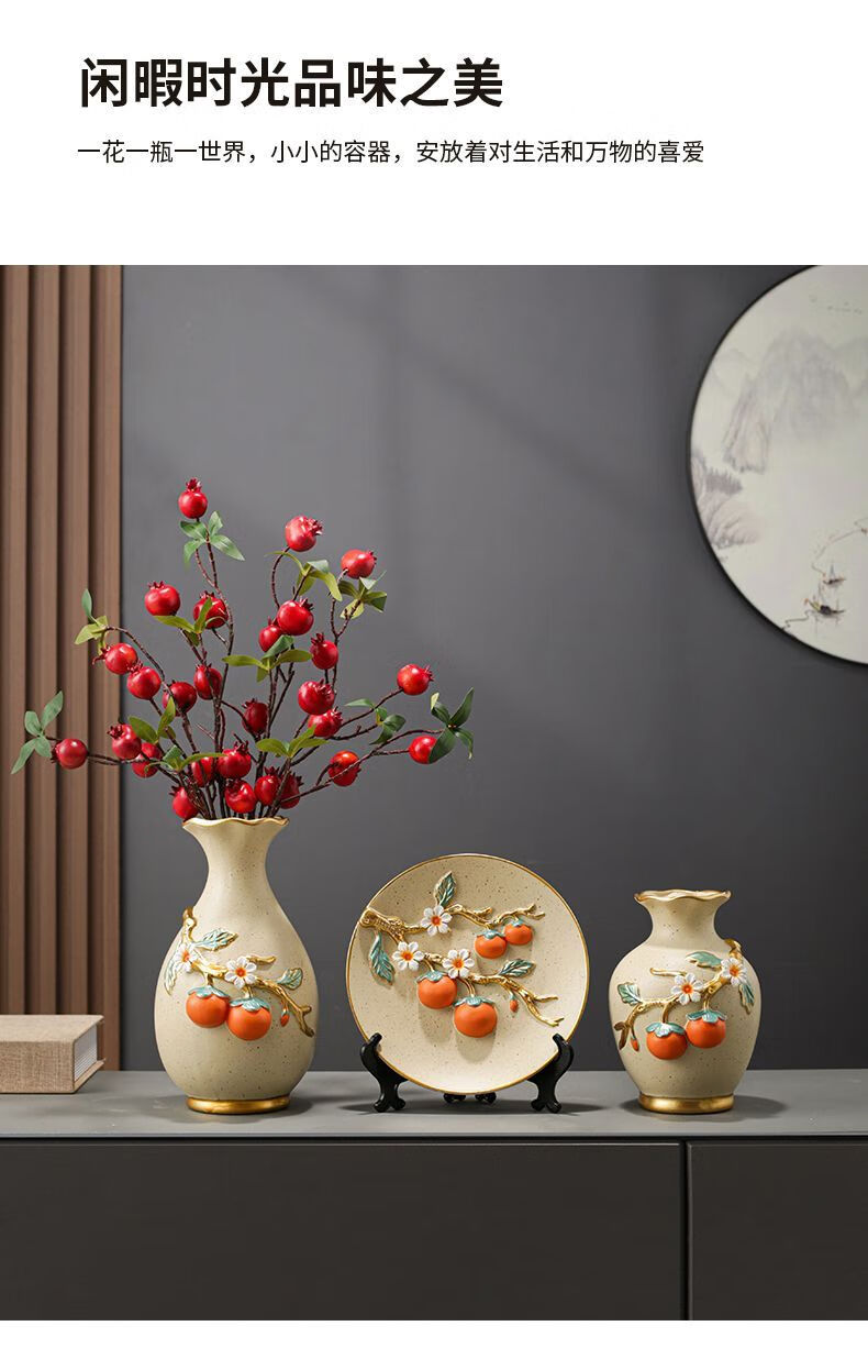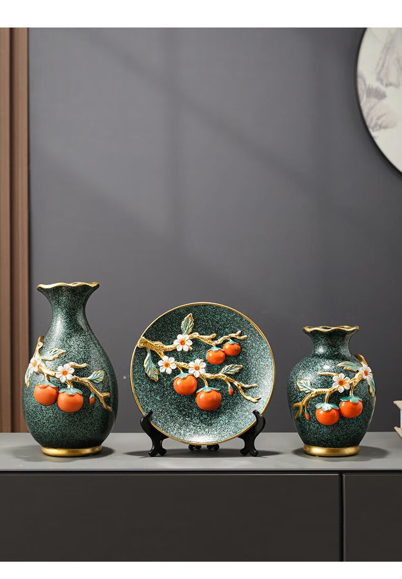 OYKTN新中式养真花陶瓷花瓶三件套立体事事如意客厅玄关电视柜酒柜摆件 A5花瓶大小一对-不含盘