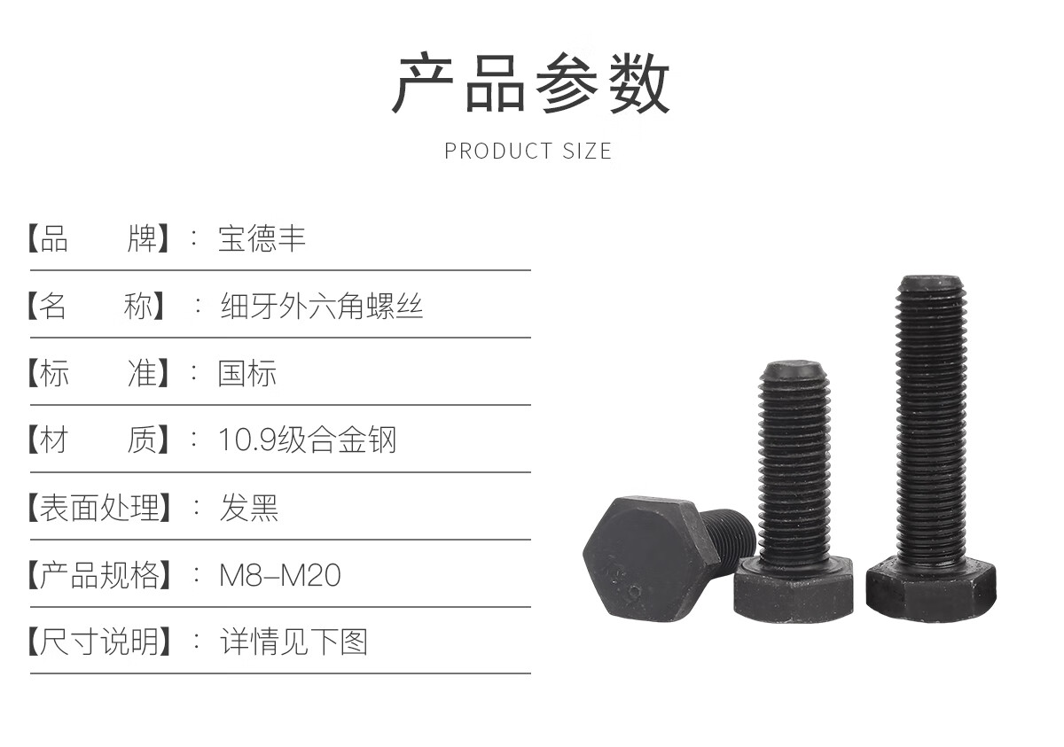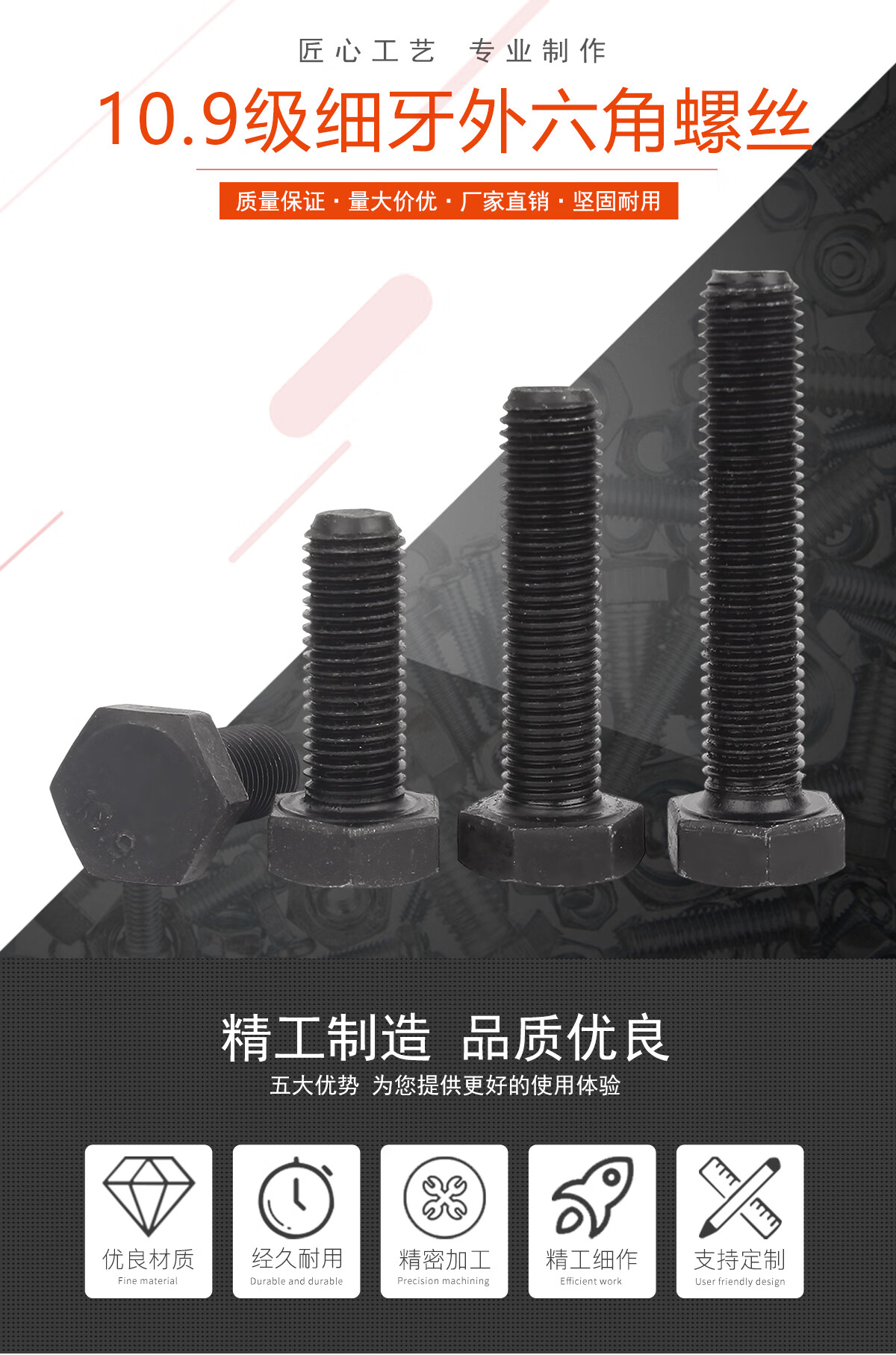 宝德丰10.9级细牙外六角螺丝钉细丝细扣幼牙螺栓M8M10M12M14M16M18M20mm M8x1x16全牙(20只)