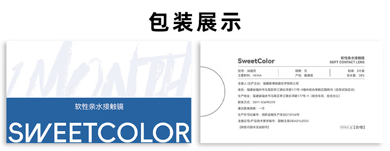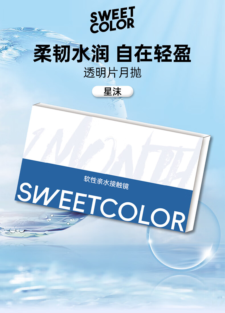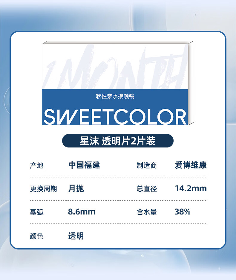 Sweet Color美瞳月抛2片透明片蓝片舒适水润学生党隐形近视眼镜 650度