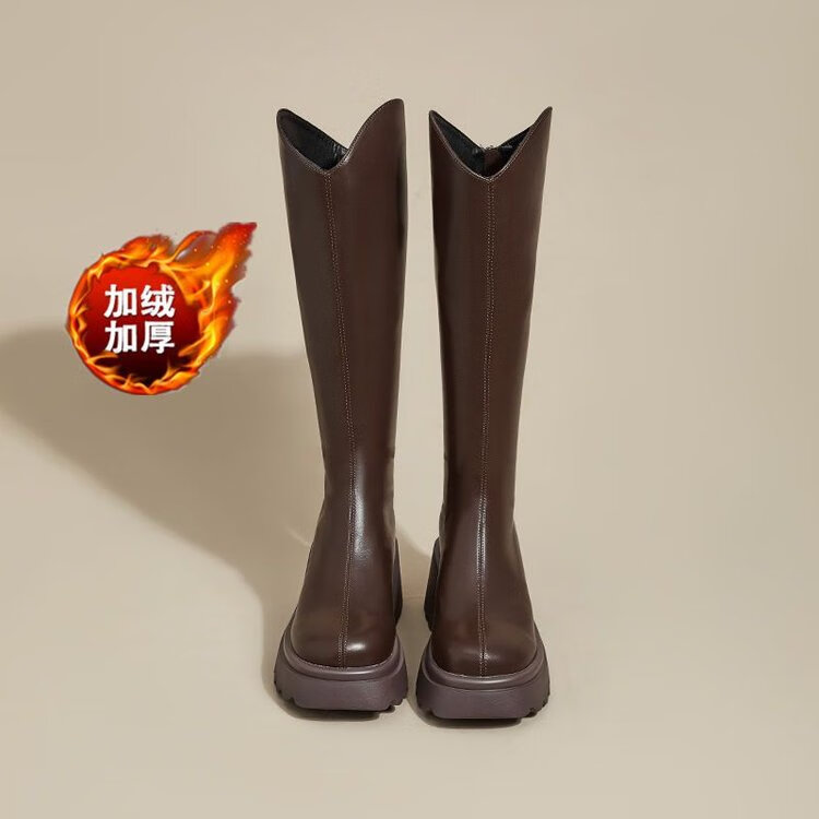 星期六西部牛仔靴女休闲马丁靴女士新款百搭秋冬复古加绒骑士靴子 棕色(加绒款) 【跟高4.5cm】 35