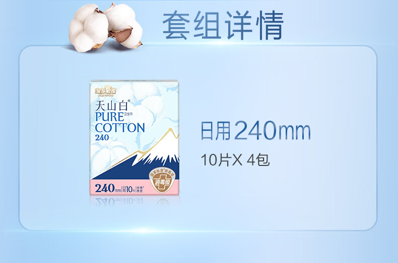 淘淘氧棉天山白纯棉消毒级日用卫生巾240mm10片*4 京东自营
