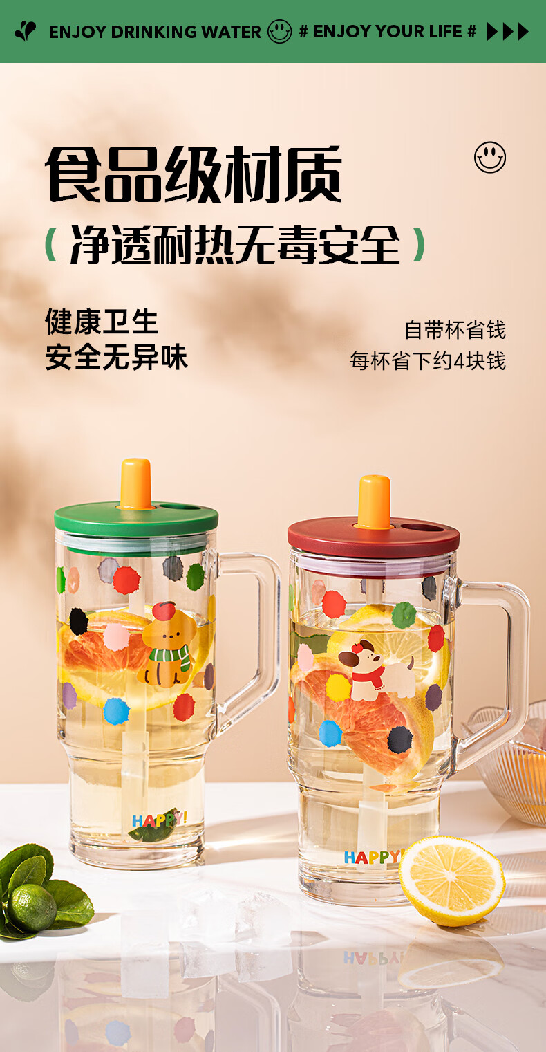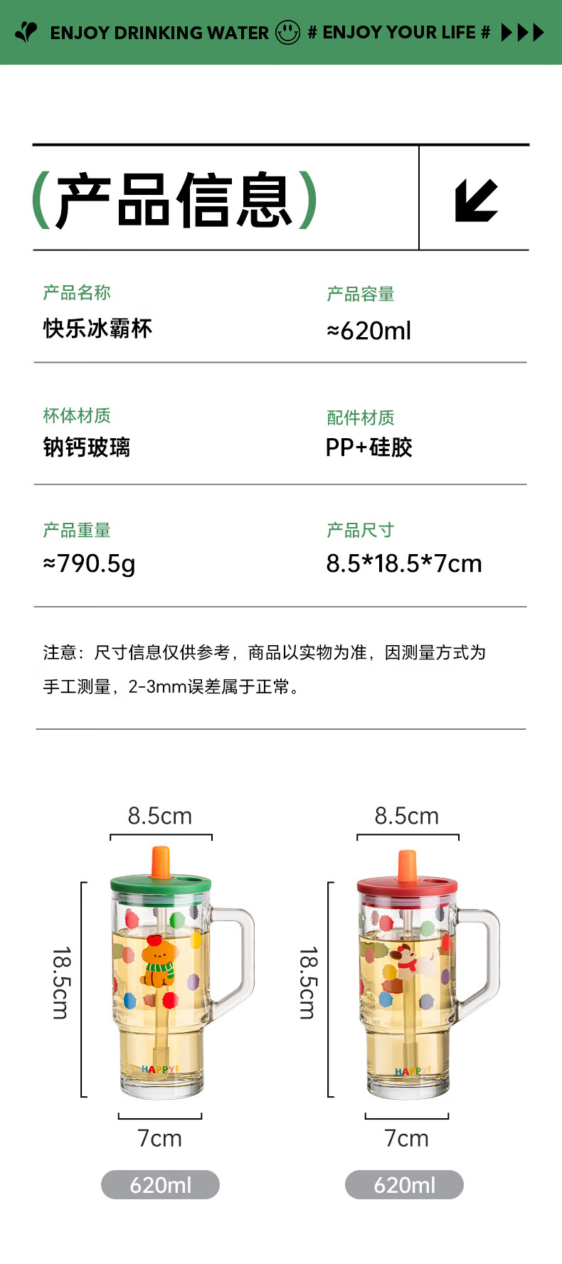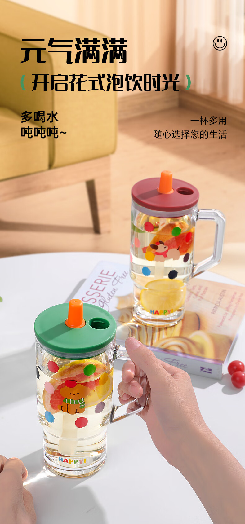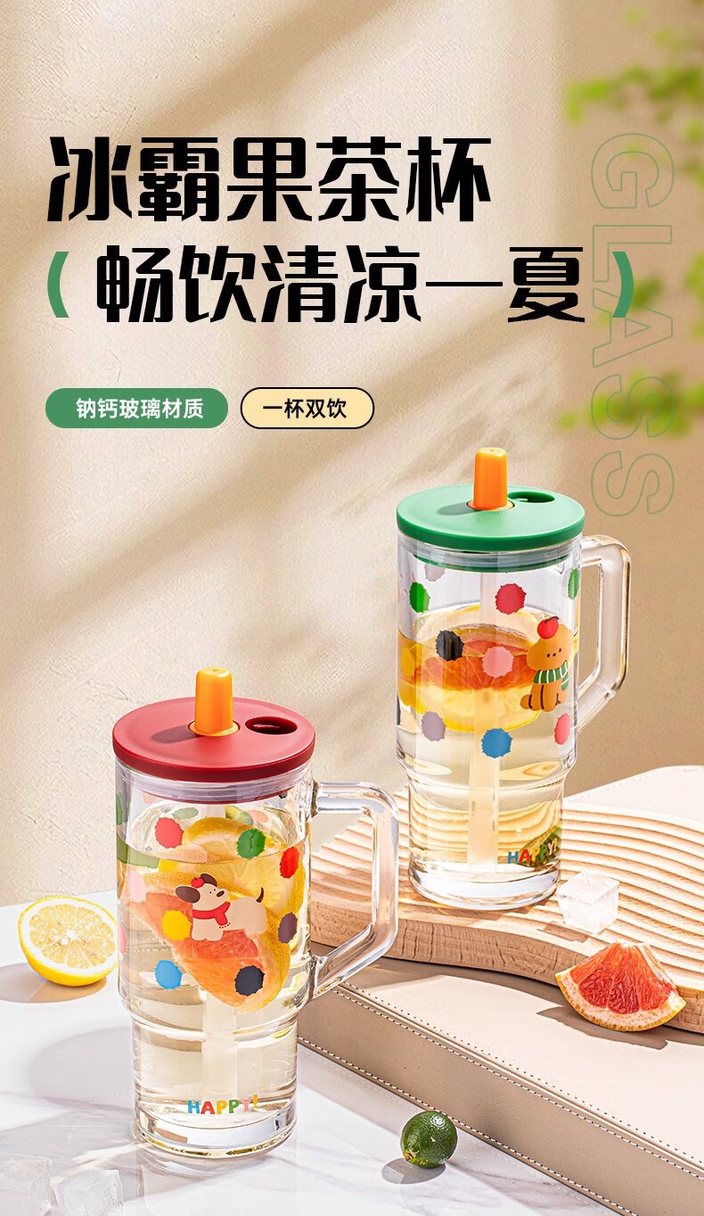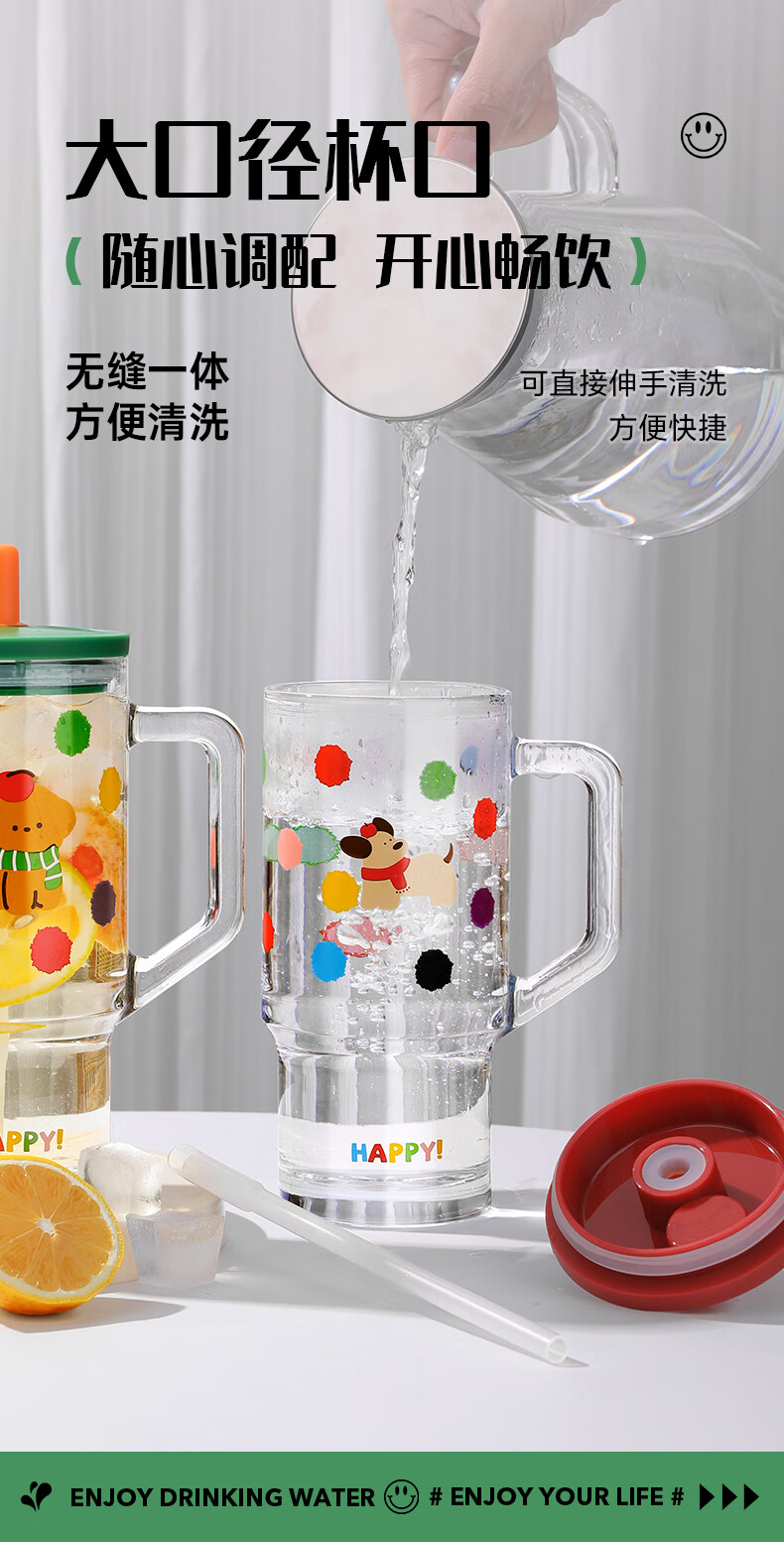 乐唯诗网红超大容量把手吸管玻璃杯子冰霸杯高颜值家用办公室巨无霸水杯 冰霸吸管杯【樱桃红】 620ml 1只
