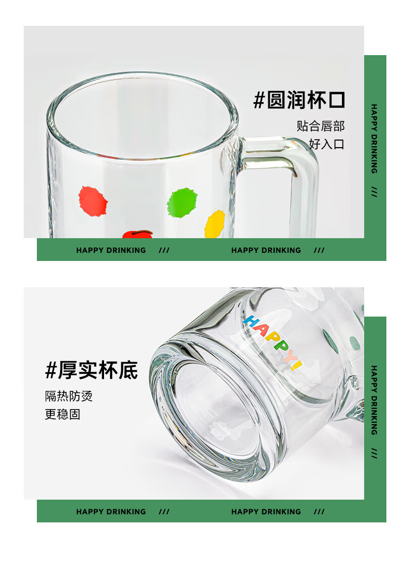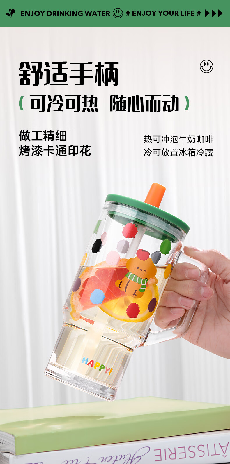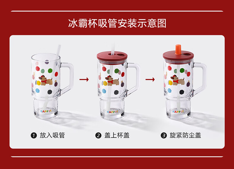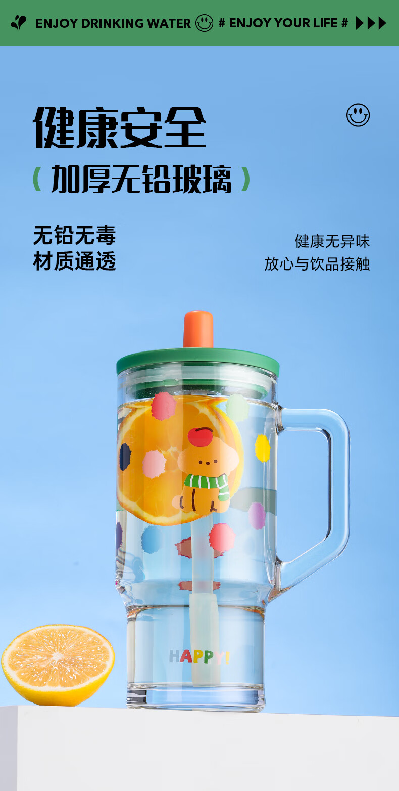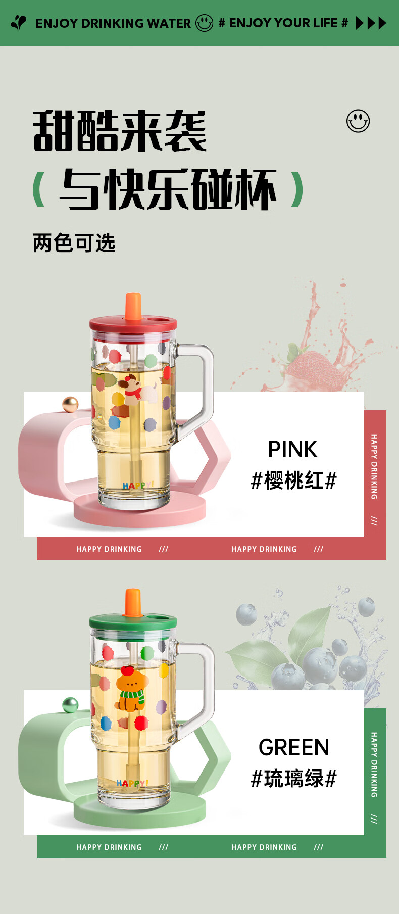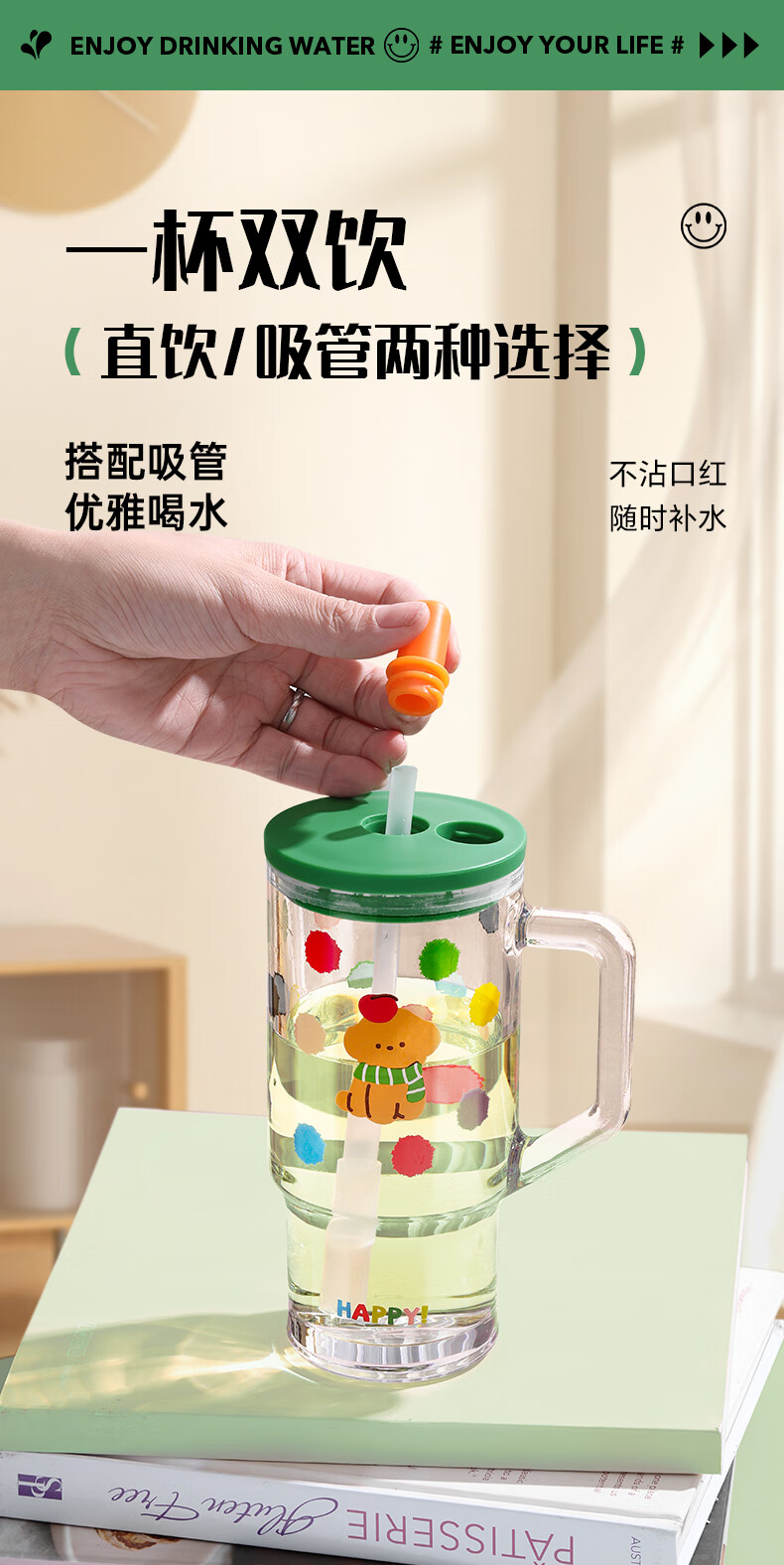 乐唯诗网红超大容量把手吸管玻璃杯子冰霸杯高颜值家用办公室巨无霸水杯 冰霸吸管杯【樱桃红】 620ml 1只