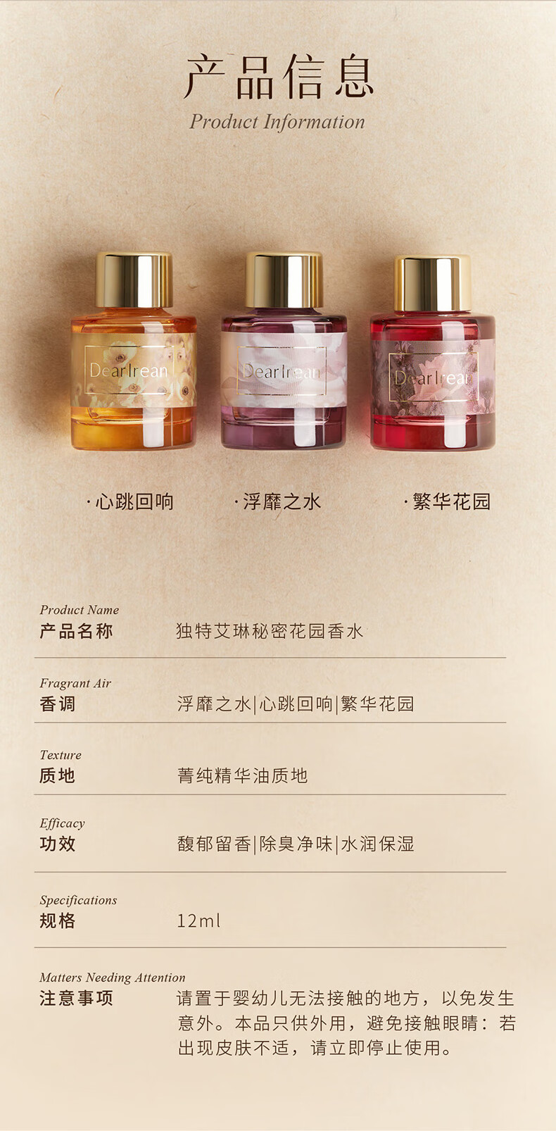 独特艾琳(Dear lrean)圣诞礼物香水秘密花园淡香持久留香清新女士高端香水节日礼物女士 浮靡之水 12ml 秘密花园香水