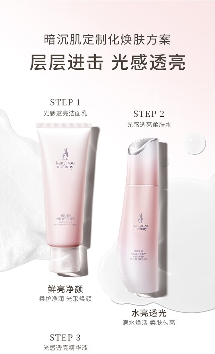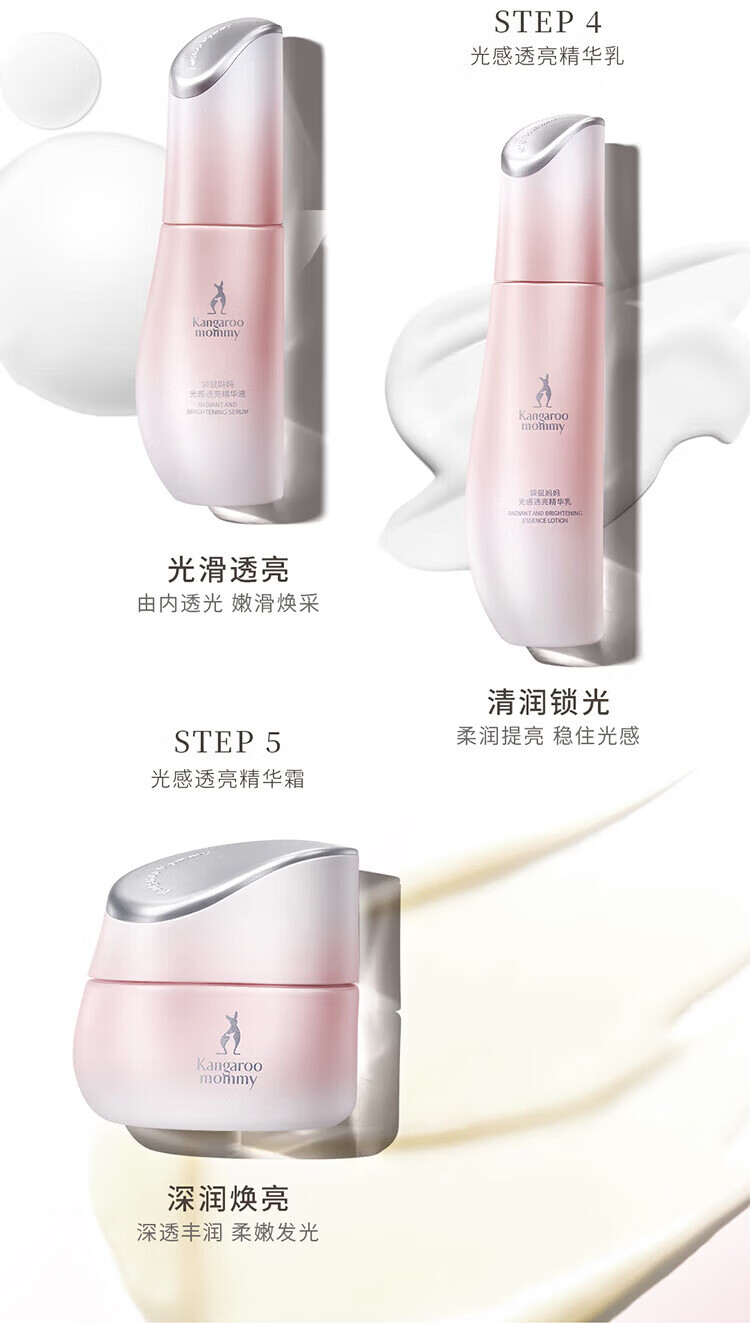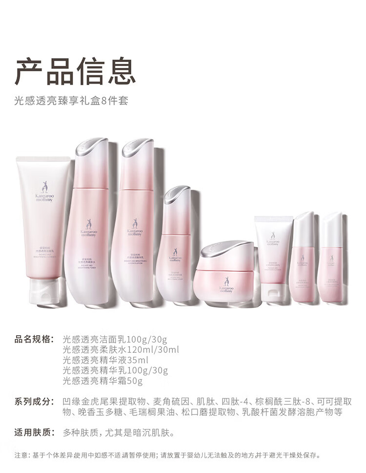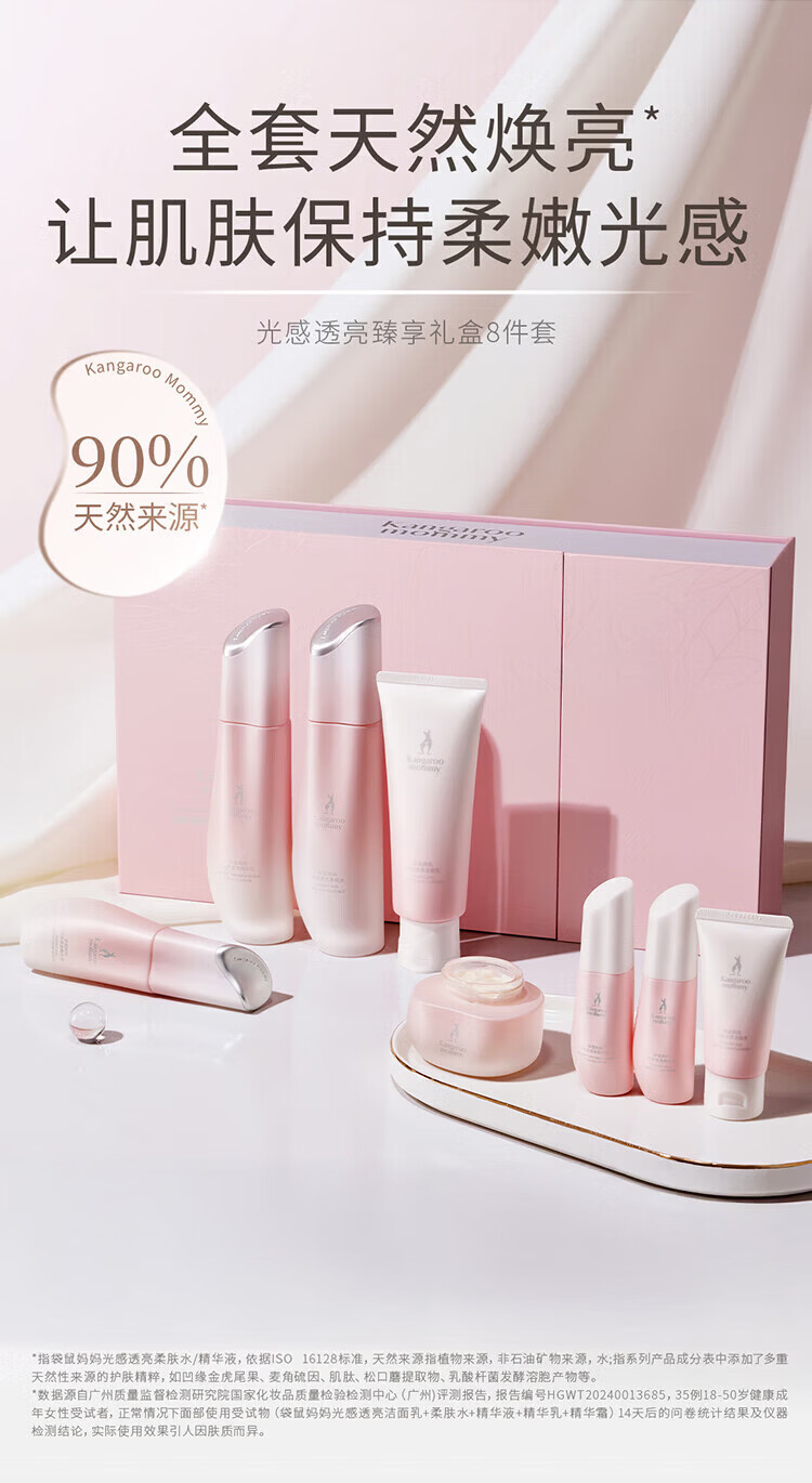 袋鼠妈妈(Kangaroo Mommy)光感护肤套装减黄提亮改善暗沉精华水乳面霜洗面奶保湿补水礼盒 【5件套】洁面+水+乳+面霜+素颜霜