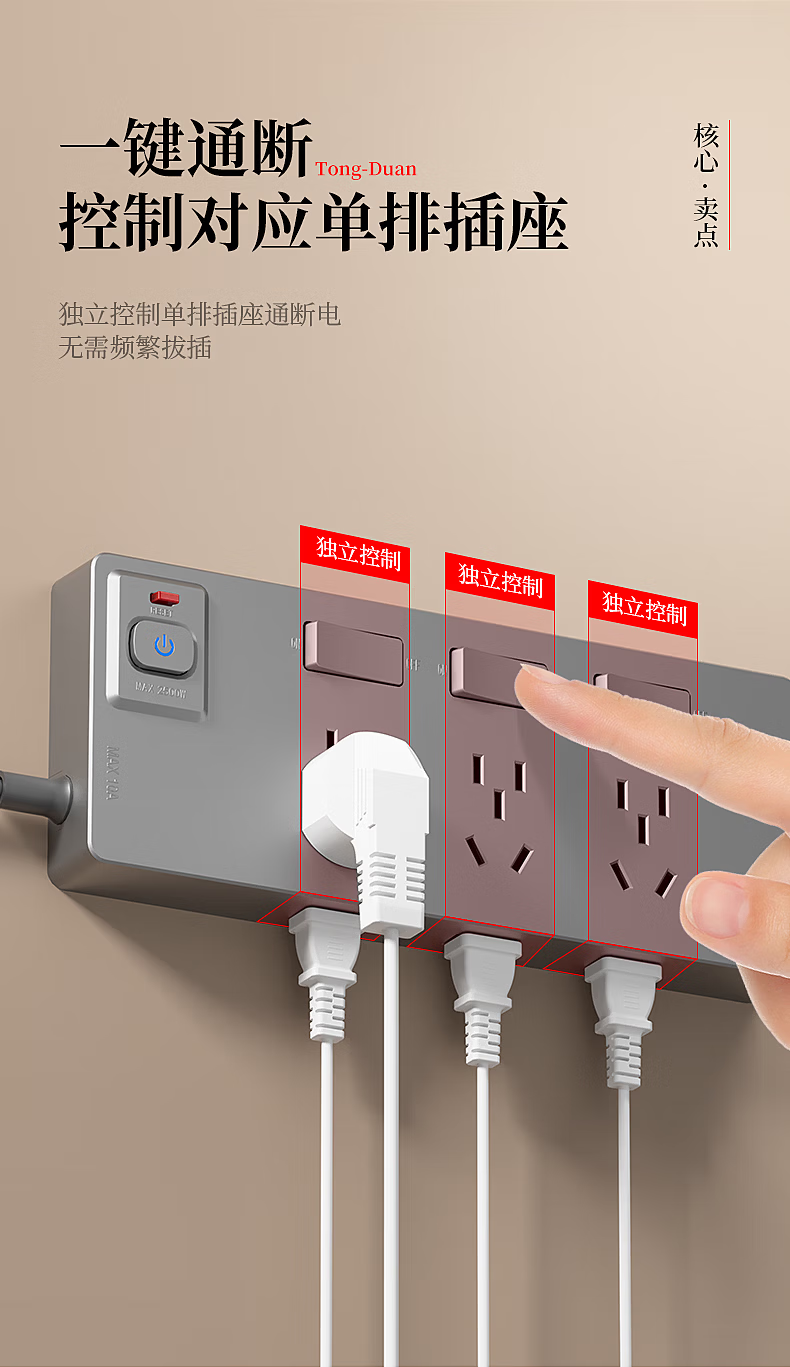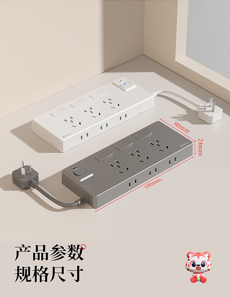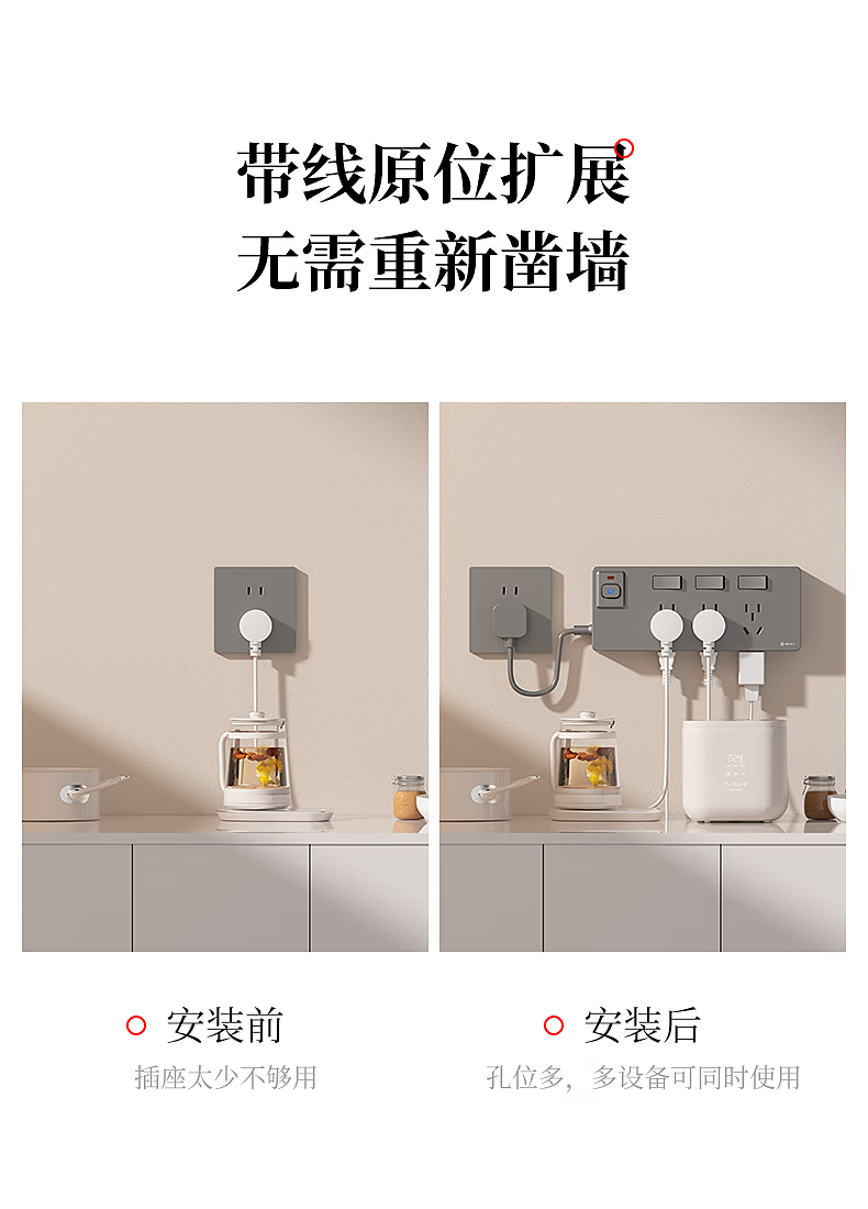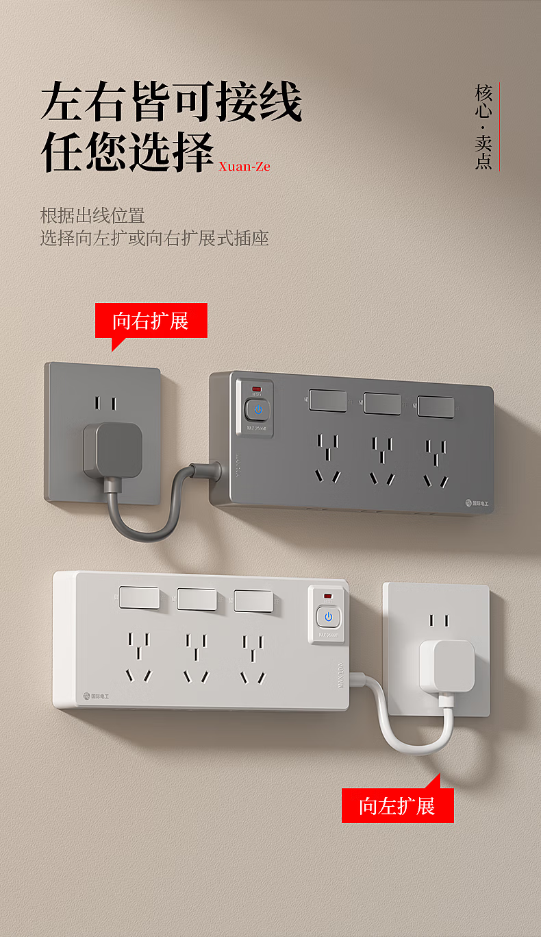 国际电工一转多带线过载保护扩展开关插座分控保护插板左右安装转换器插排 向右拓展三开30厘米21孔-(过载保护)白色 插座