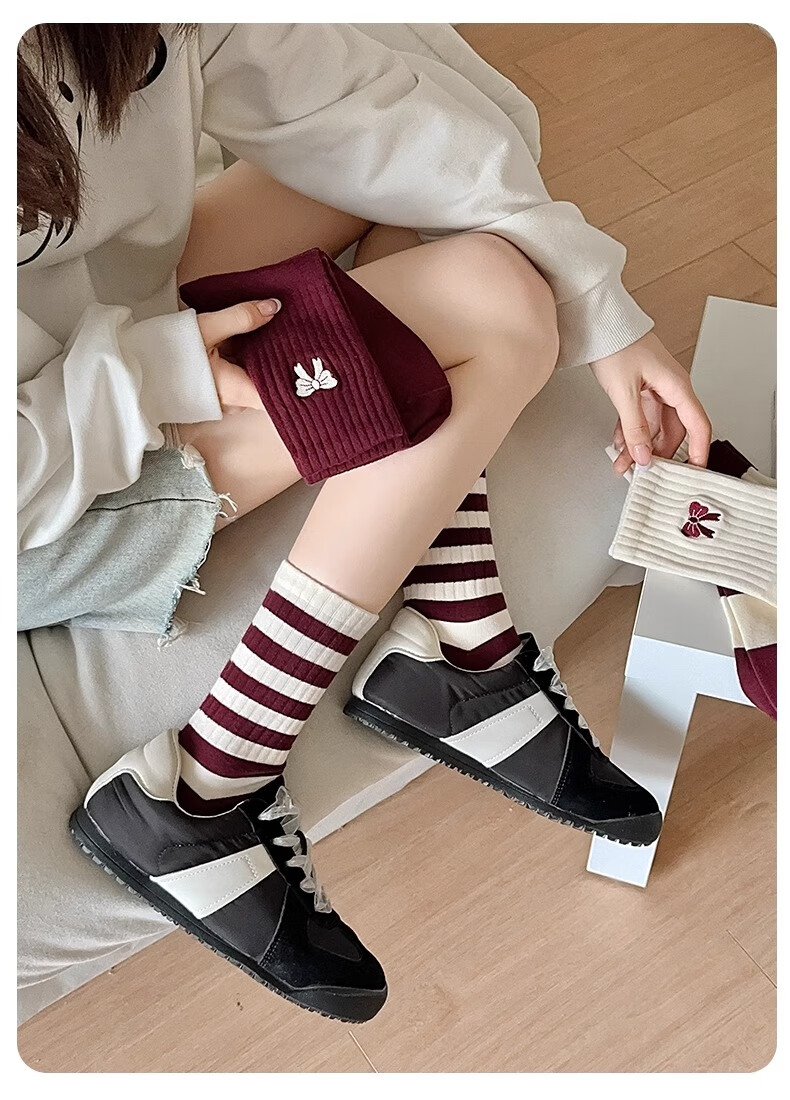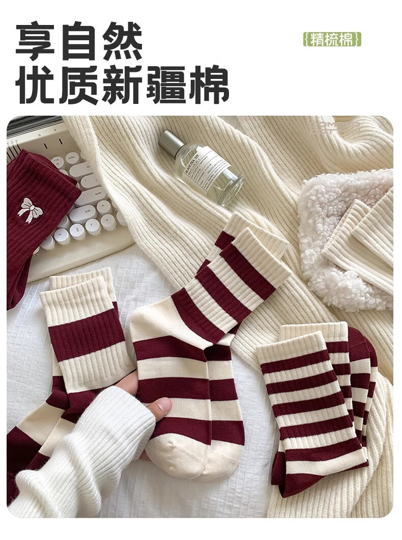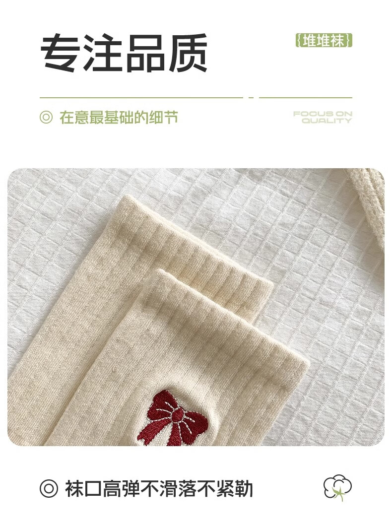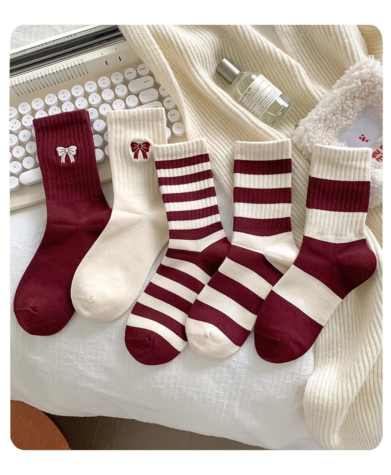 莎兰朵袜子女士中筒春秋季纯棉酒红色高筒蝴蝶结条纹女孩堆堆长袜全棉 V1混色5双装 均码