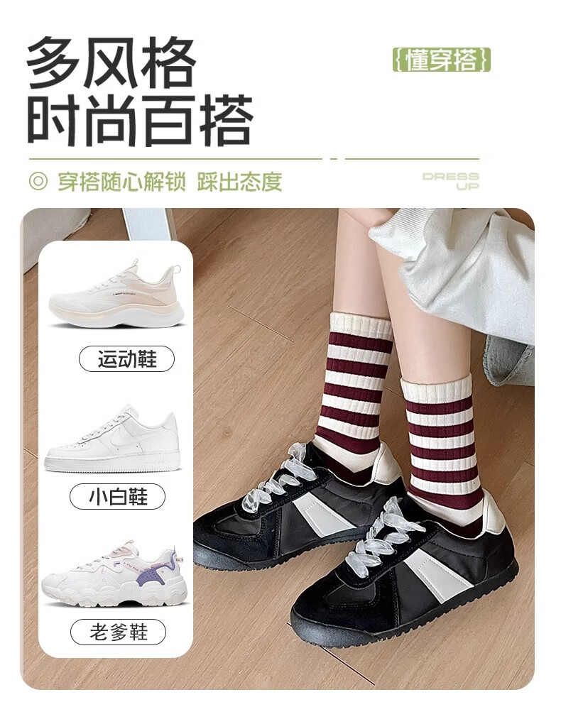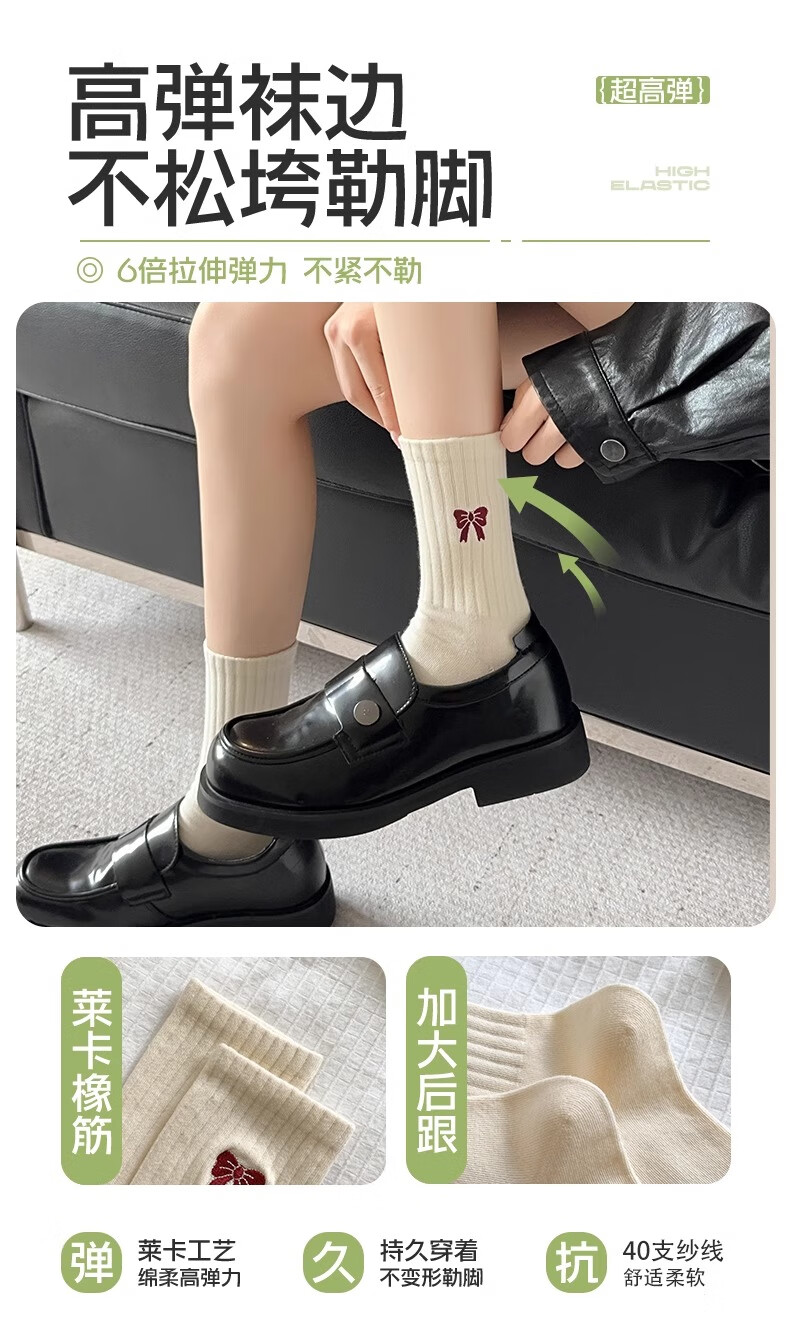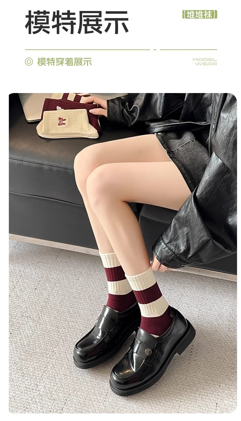 莎兰朵袜子女士中筒春秋季纯棉酒红色高筒蝴蝶结条纹女孩堆堆长袜全棉 V1混色5双装 均码