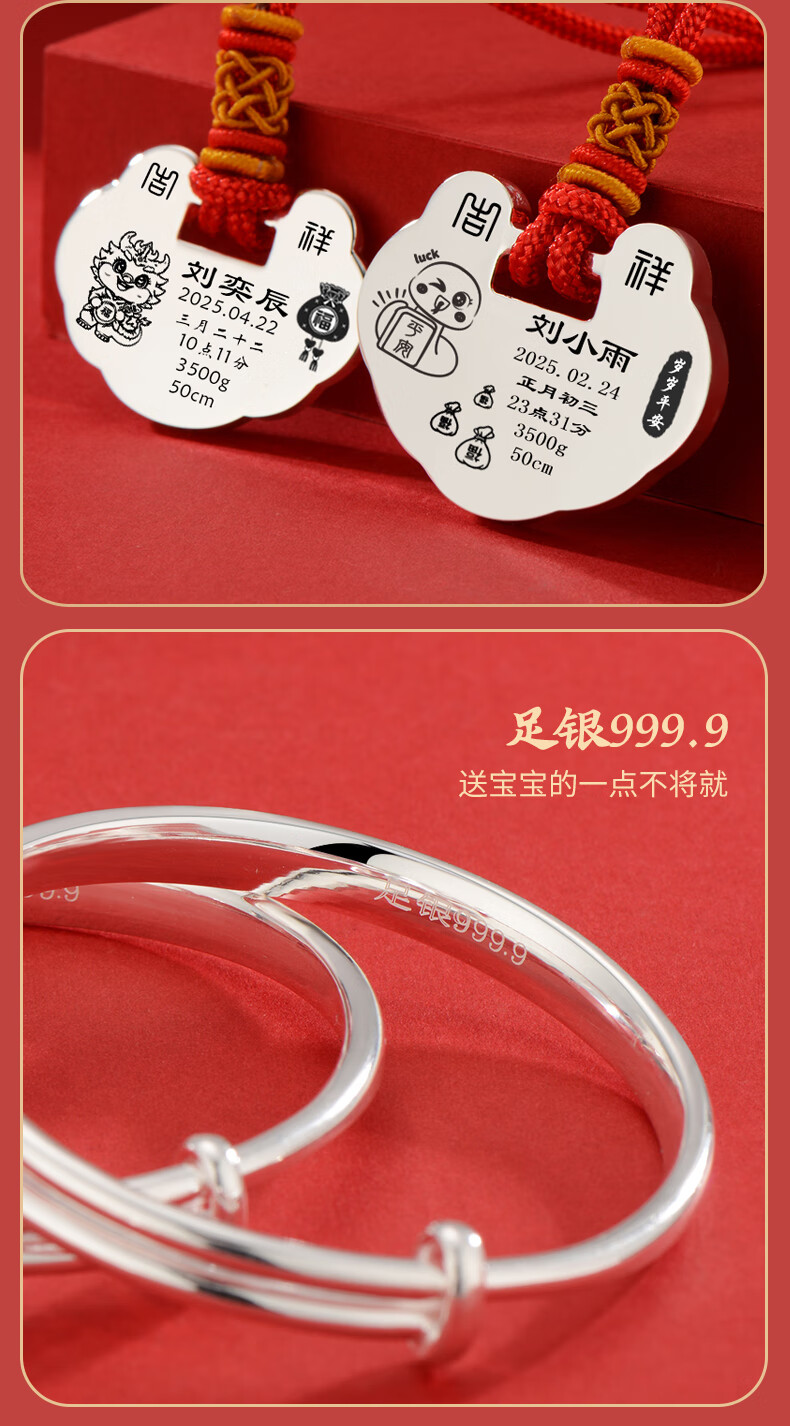 爱贝贝【私人定制】婴儿银手镯足银龙宝宝蛇年满月礼物长命锁银锁银镯子 22克大号锁