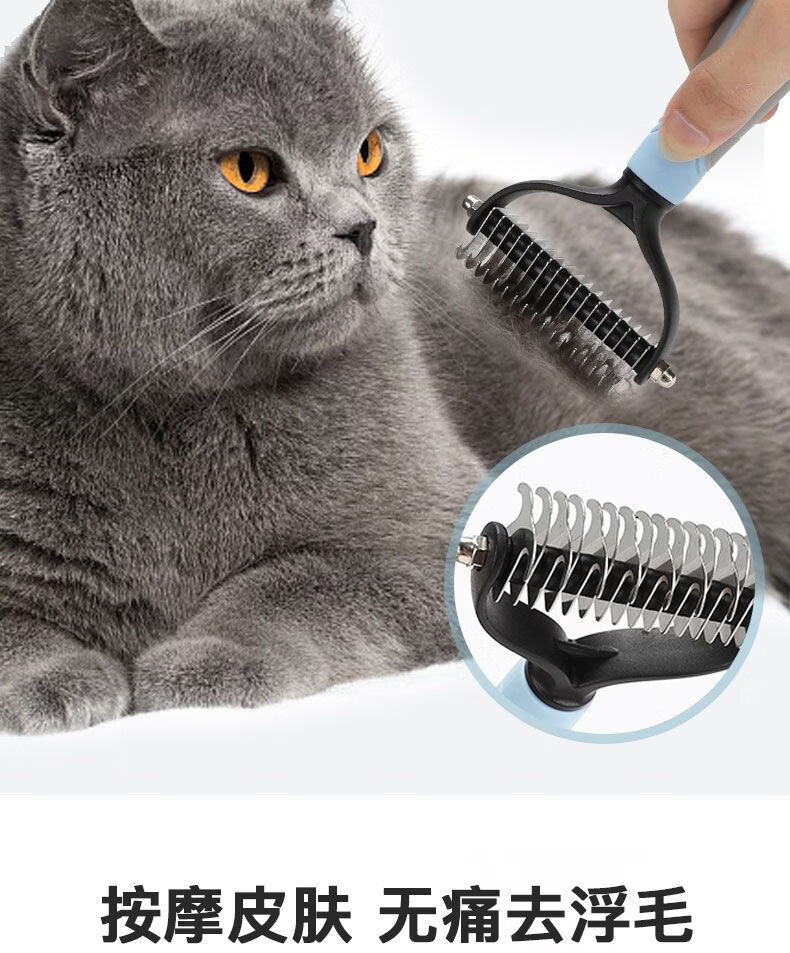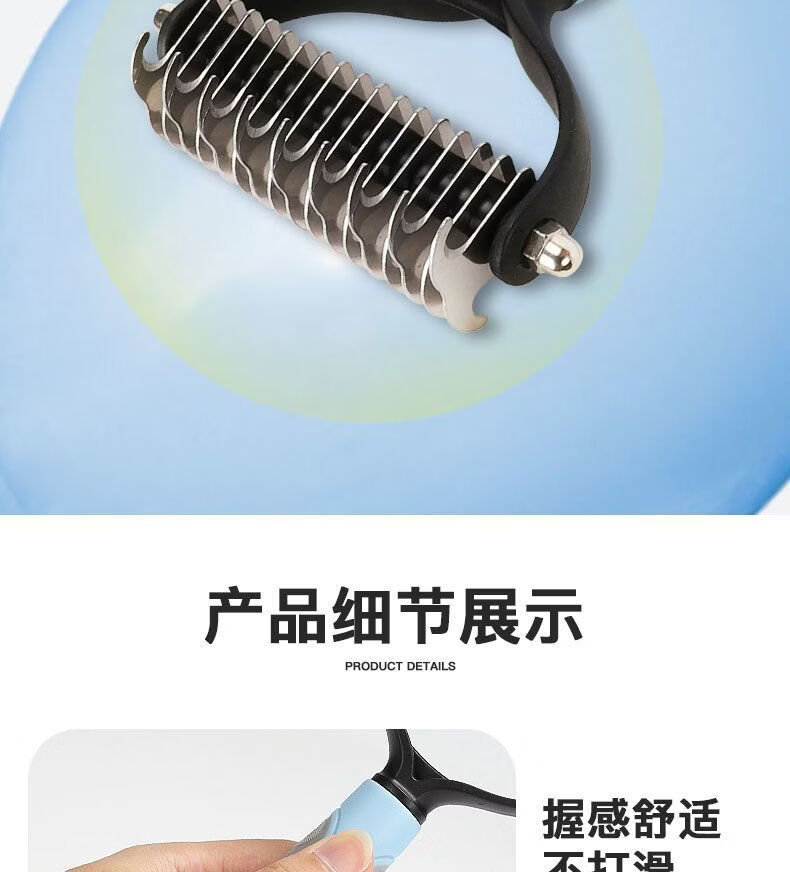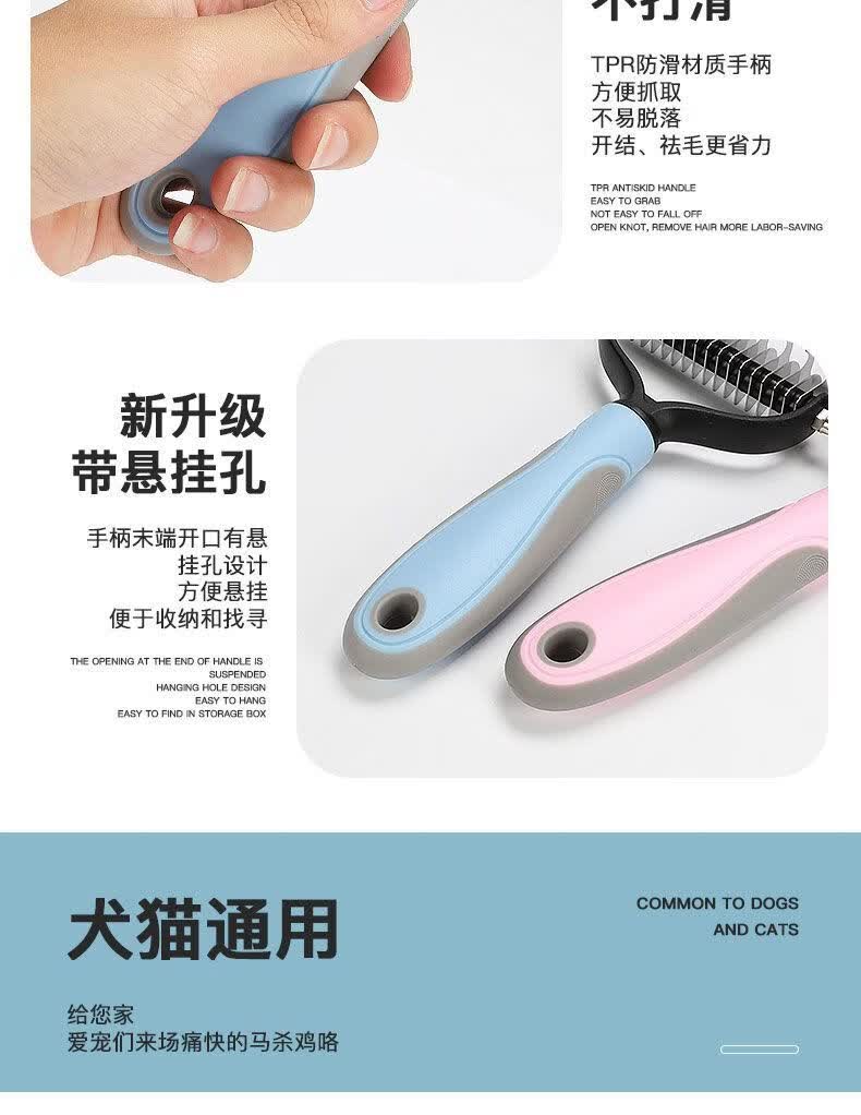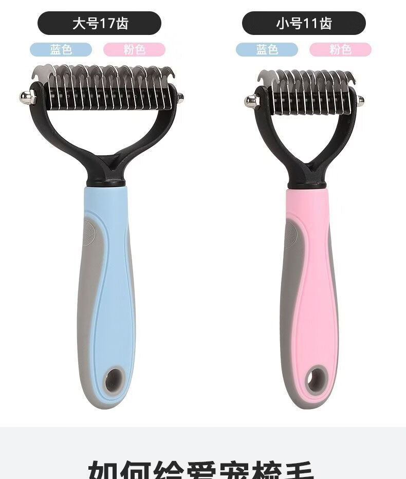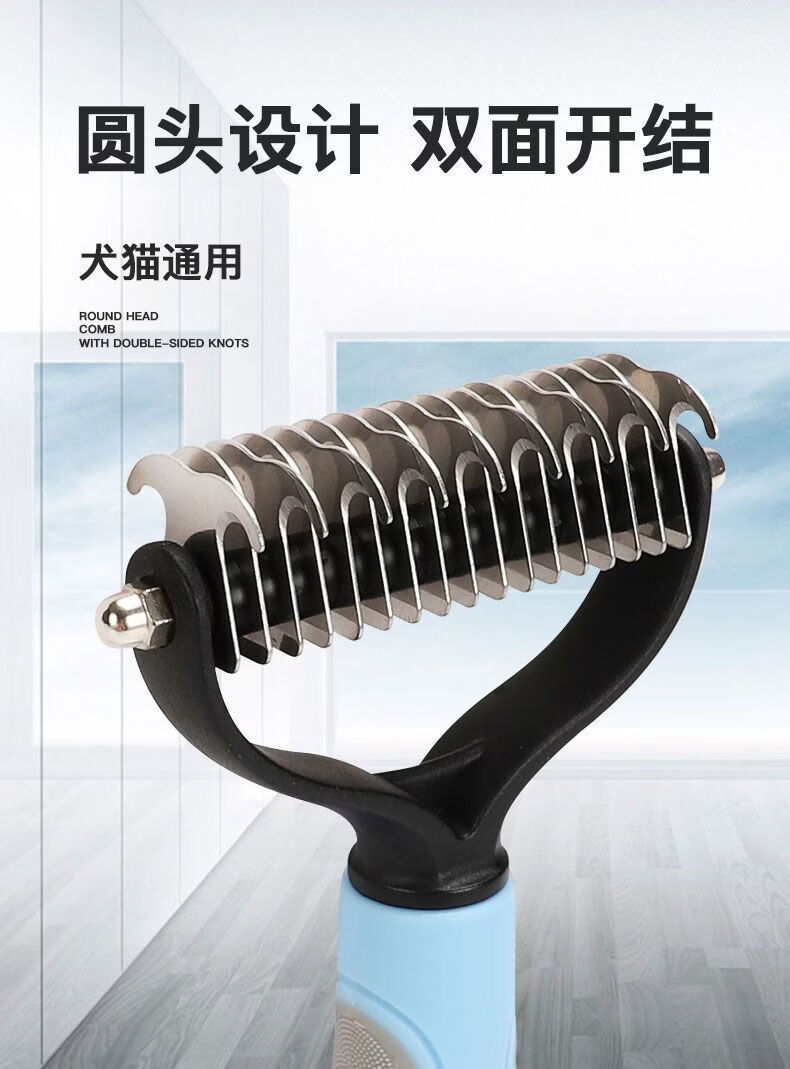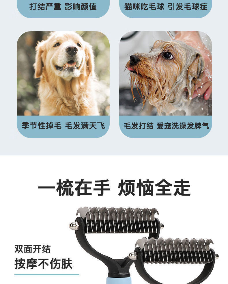 宠物梳子 不锈钢双面开结耙梳猫狗梳子清洁美容脱毛梳宠物开结梳 蓝色大号 OPP袋装