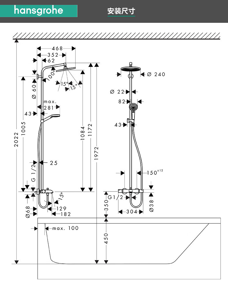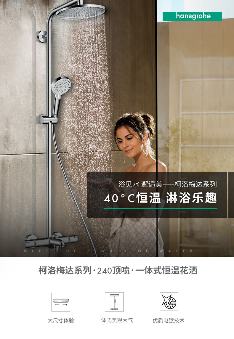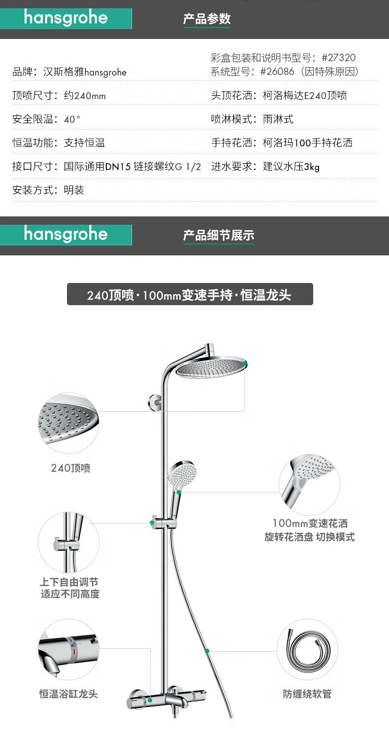汉斯格雅(Hansgrohe)恒温淋浴花洒柯洛梅达S240浴缸龙头带下出水淋浴管 27320007