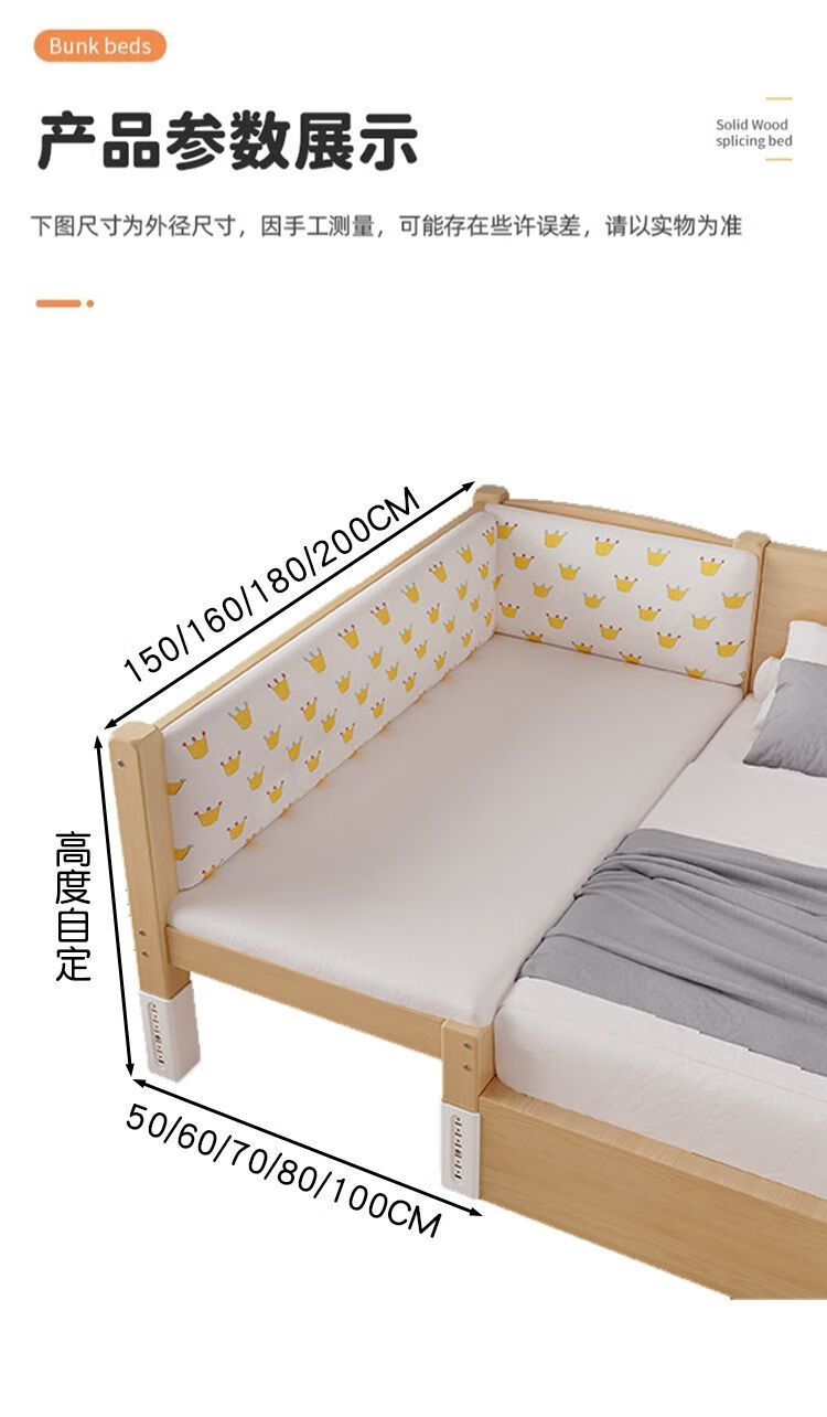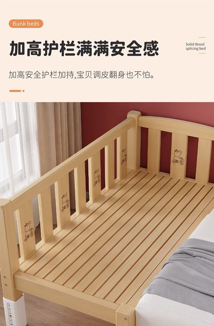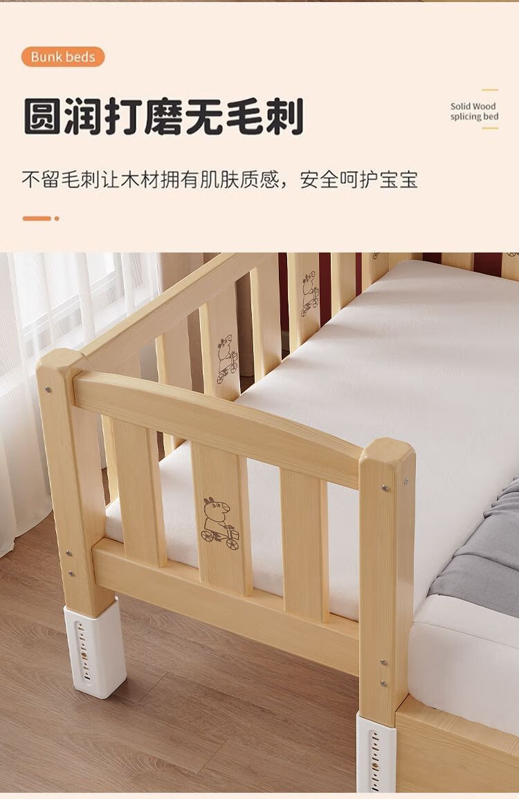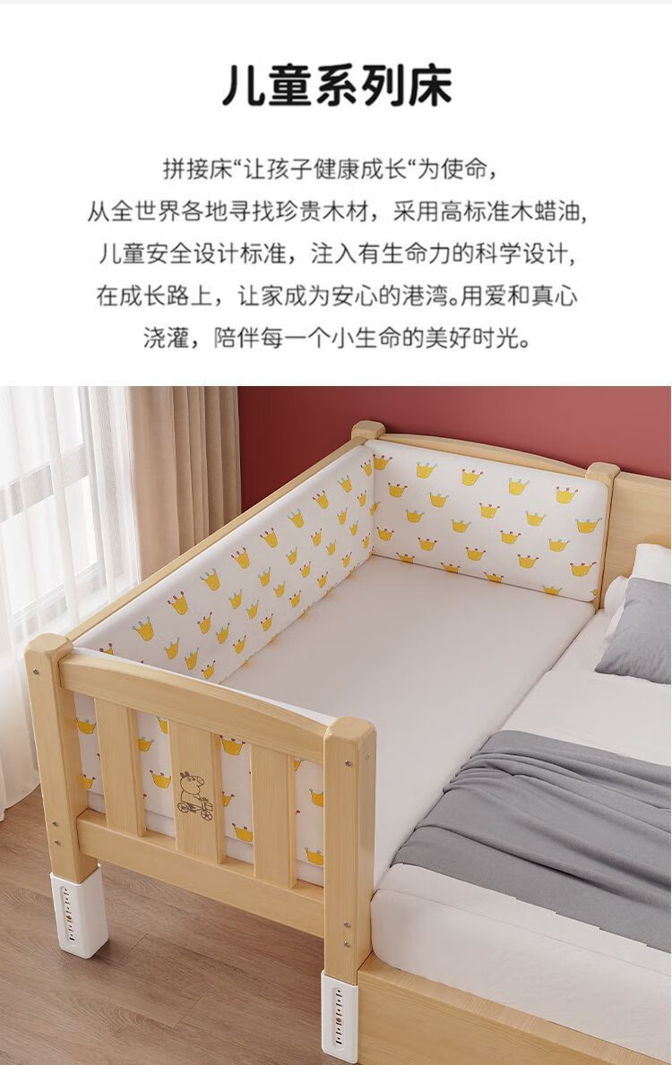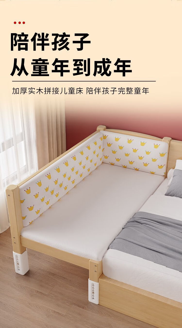 欣慕雅实木拼接床加宽大床边男女宝宝单人小床儿童床带护栏可调节婴儿床 两面护栏单床【床高度可自由调节】 长150宽50高40CM【全实木】