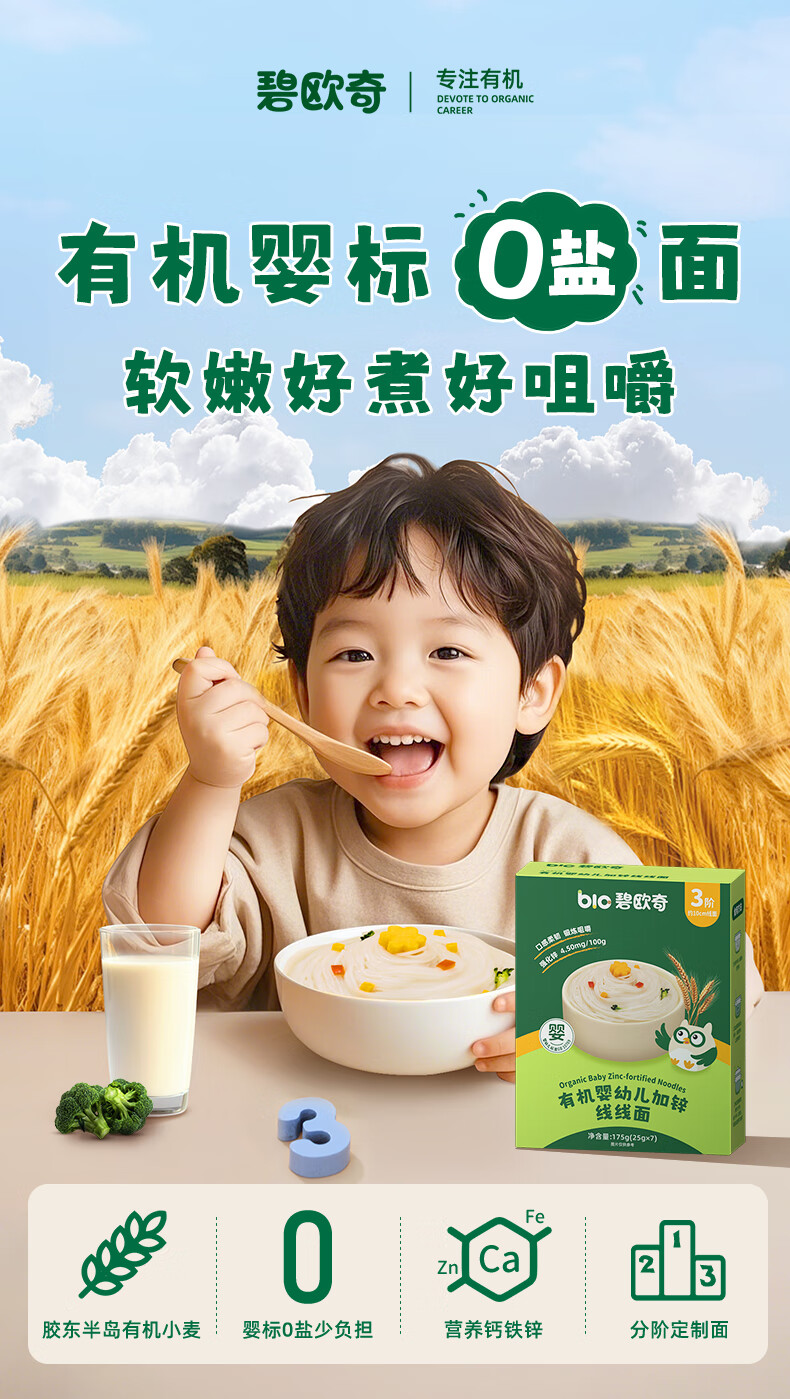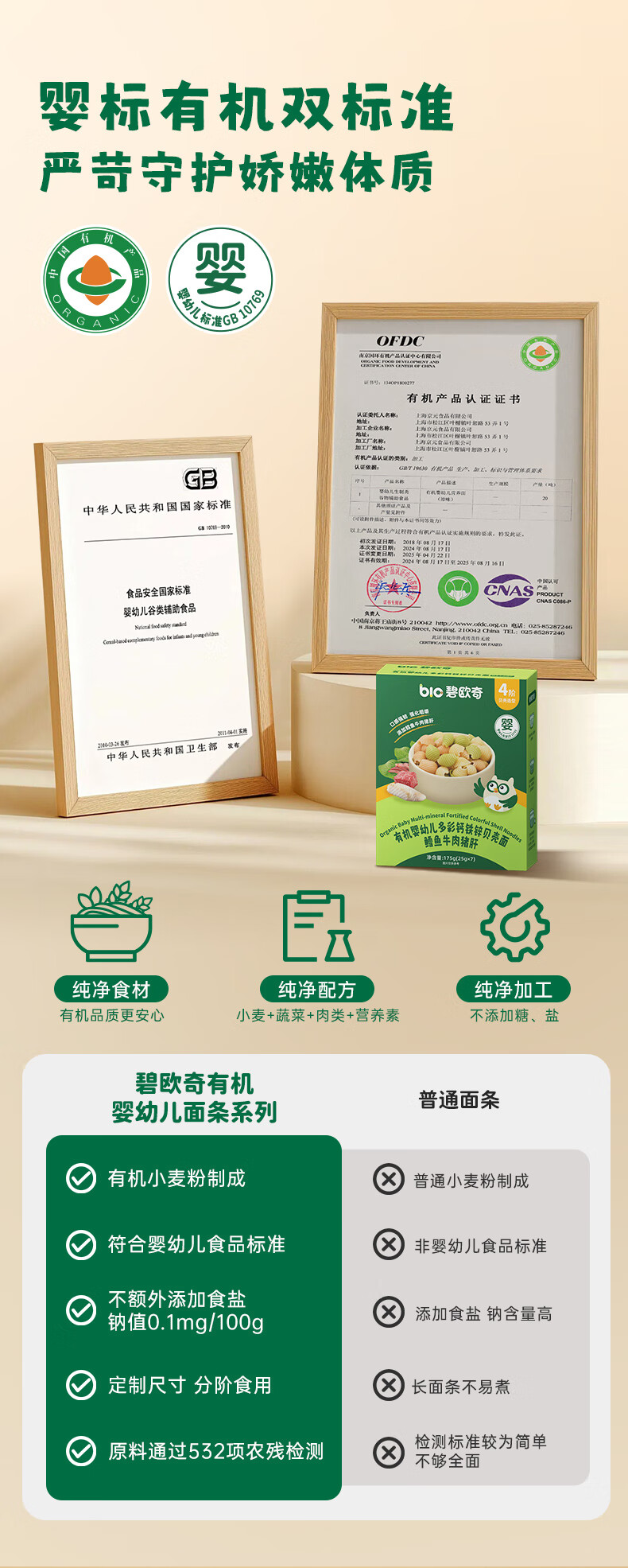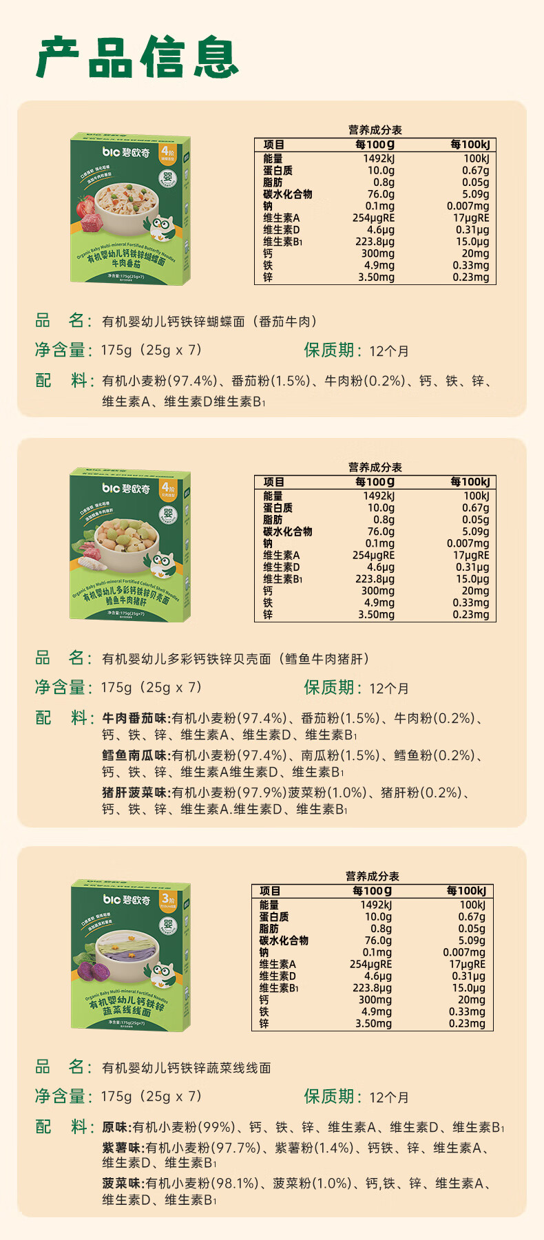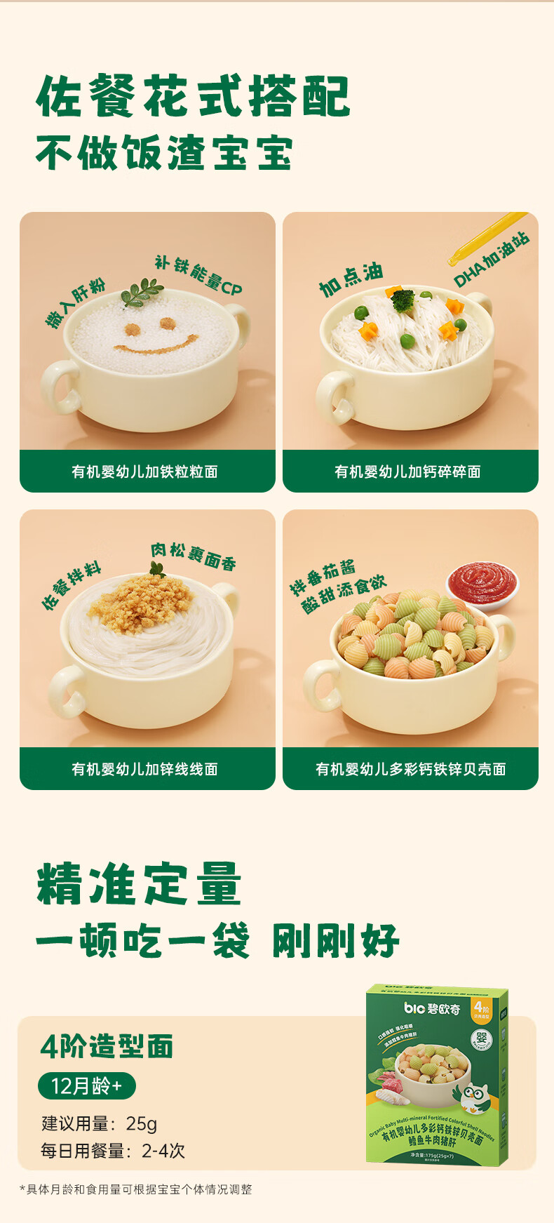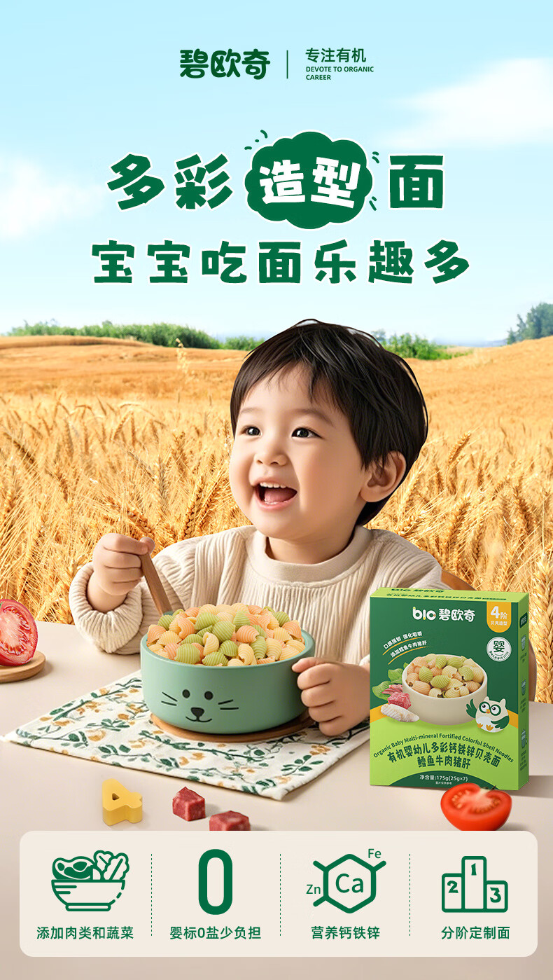 碧欧奇【99元任选6件】有机婴幼儿蔬菜辅食油米面粉面条酱油调味品 12月+|鳕鱼牛肉猪肝贝壳面175g