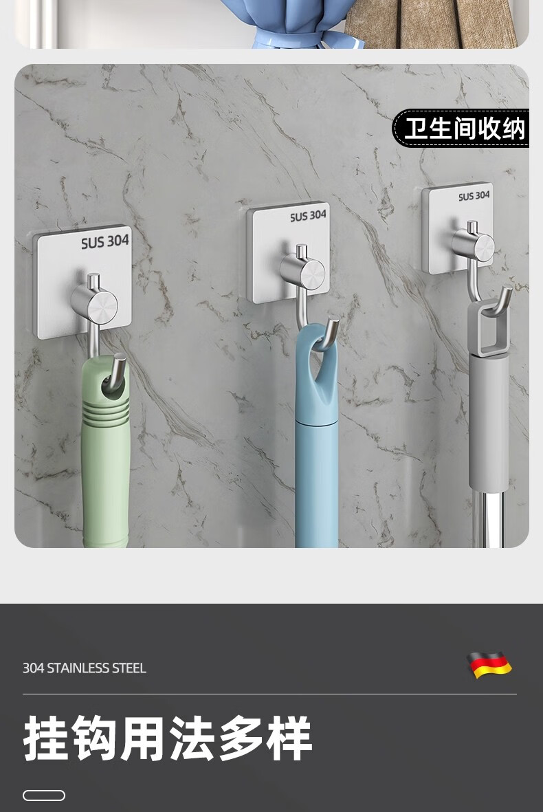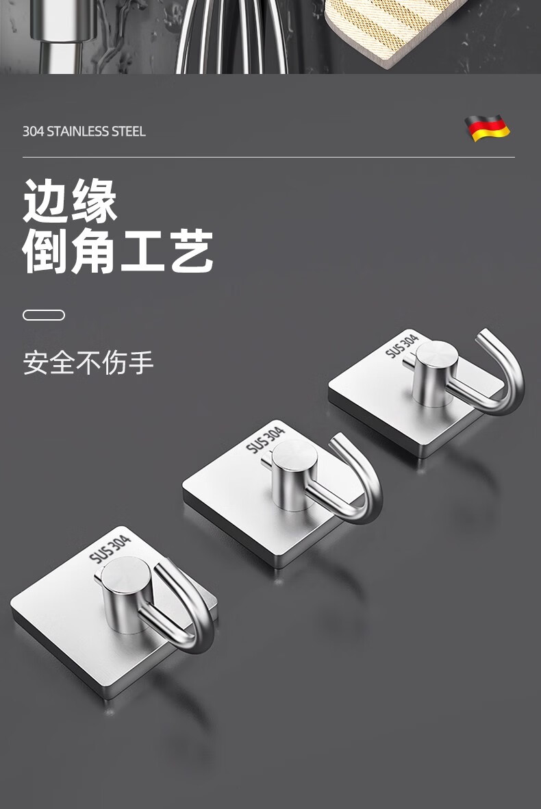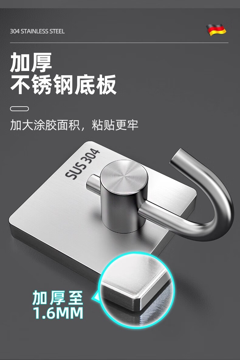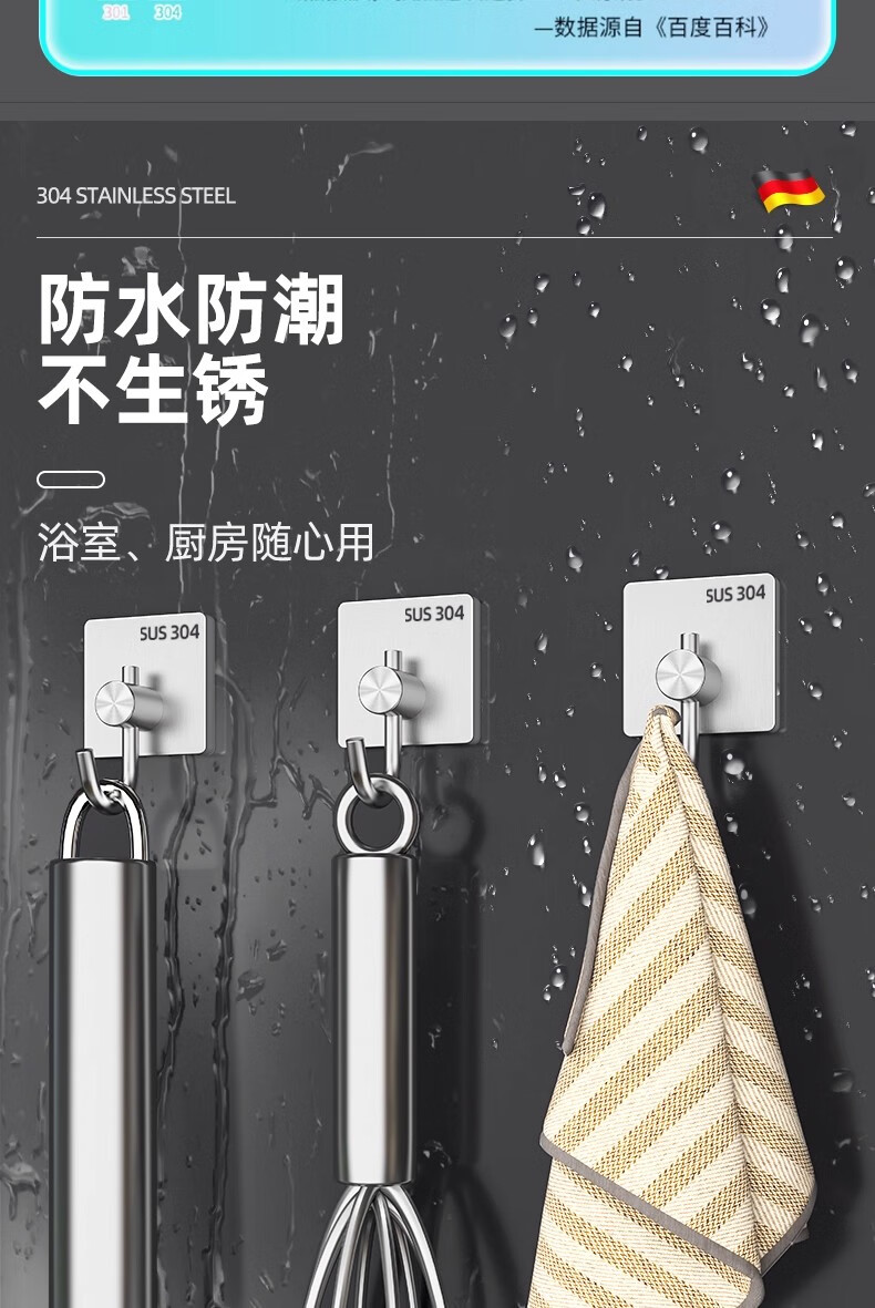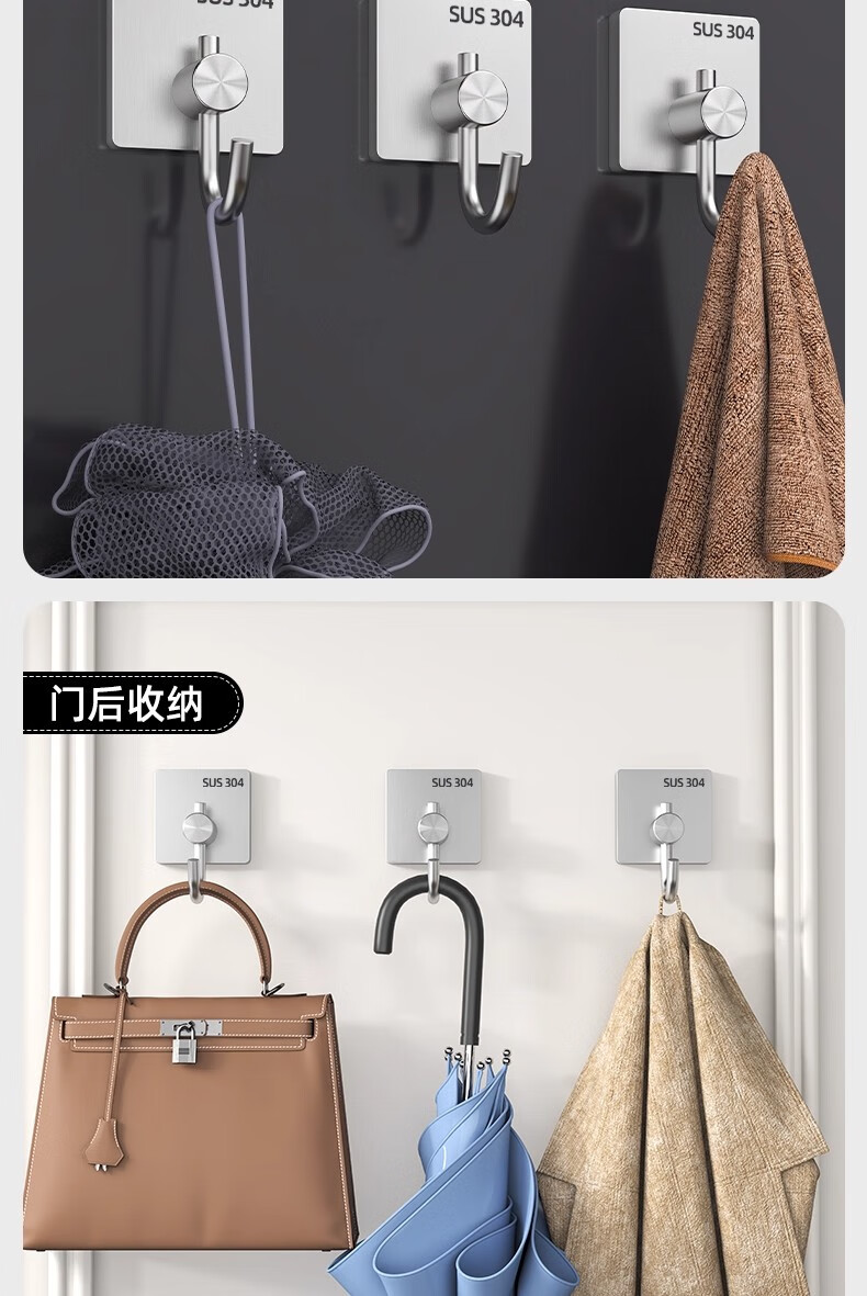 沐阁卫生间浴室不锈钢挂钩超强粘力免打孔厨房粘钩门后挂钩墙贴防水 方形银色【10只装】