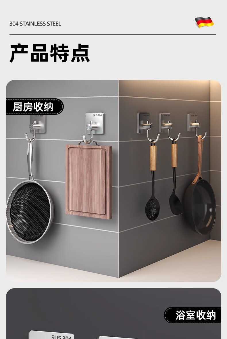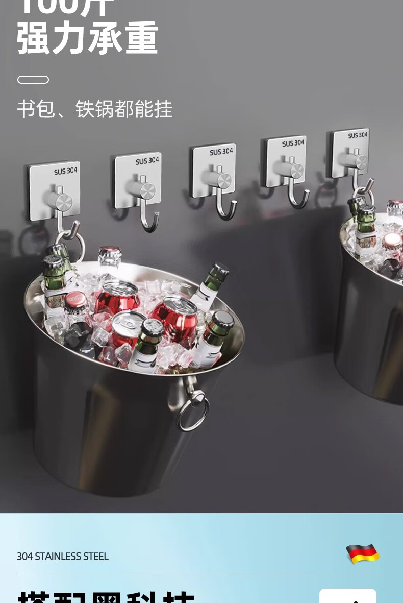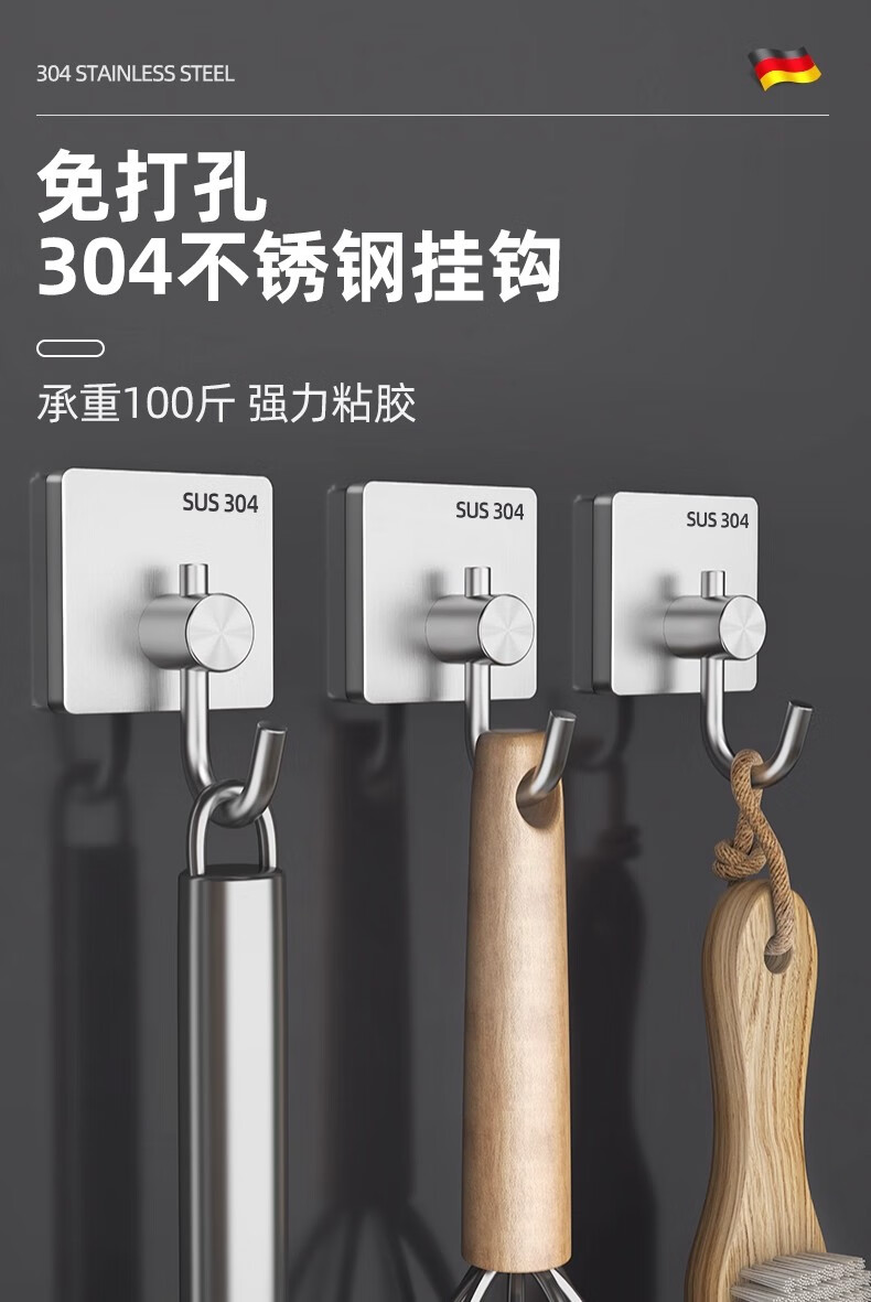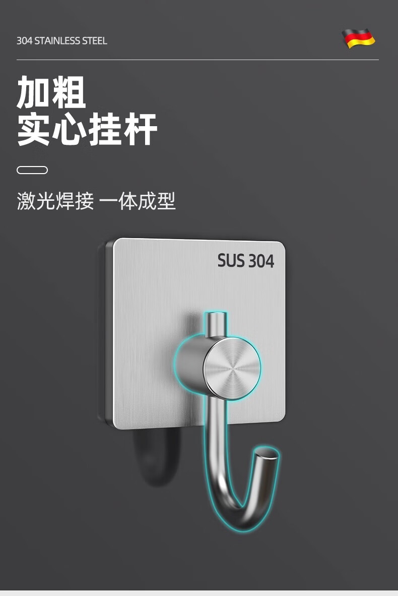 沐阁卫生间浴室不锈钢挂钩超强粘力免打孔厨房粘钩门后挂钩墙贴防水 方形银色【10只装】