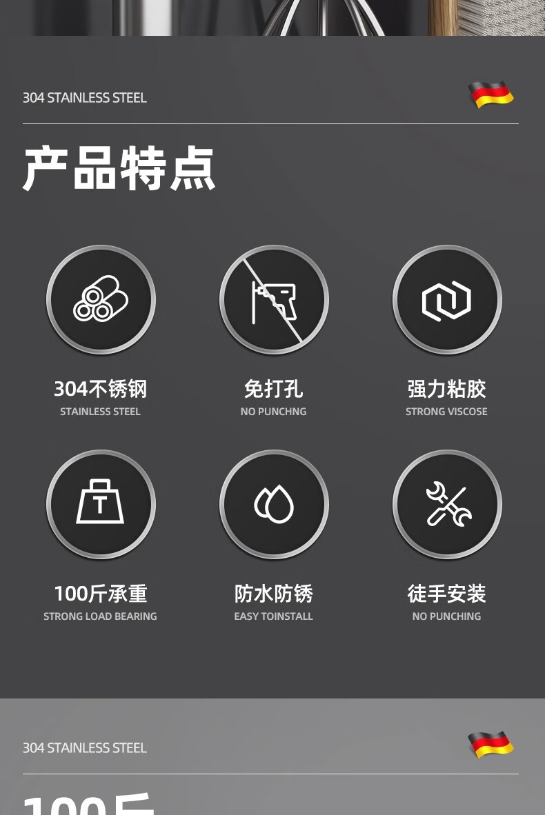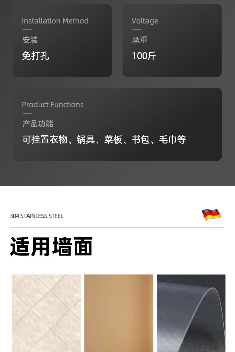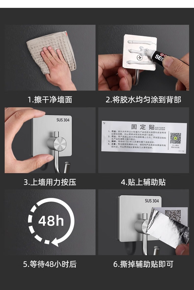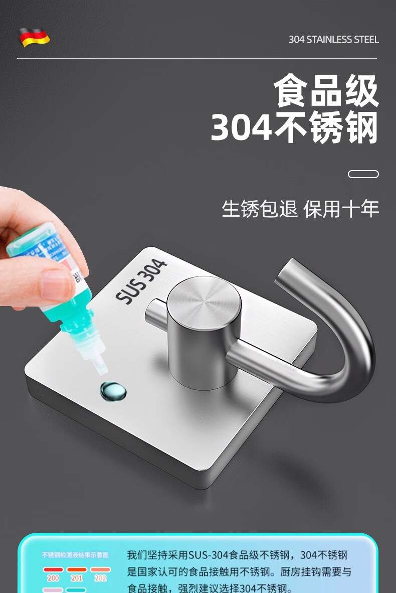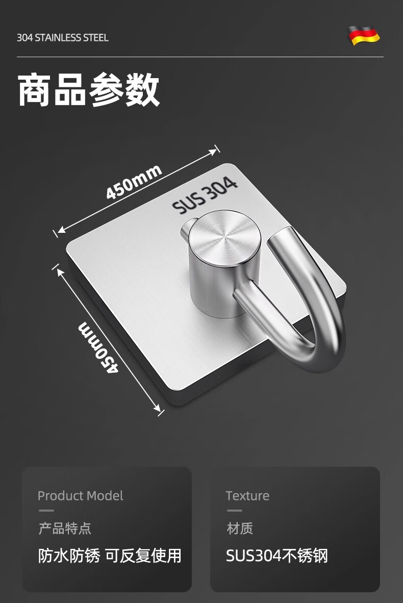 沐阁卫生间浴室不锈钢挂钩超强粘力免打孔厨房粘钩门后挂钩墙贴防水 方形银色【10只装】