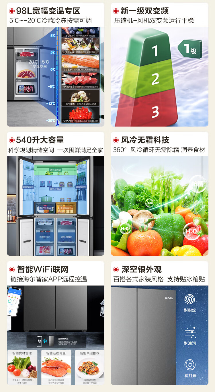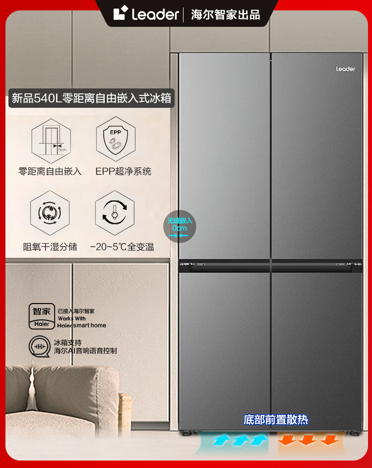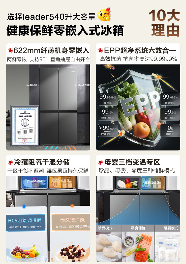 海尔冰箱出品统帅540升零嵌入式四开门十字对开门风冷无霜一级能效变频节能Leader电冰箱 零嵌入+EPP超净系统+全温区变温