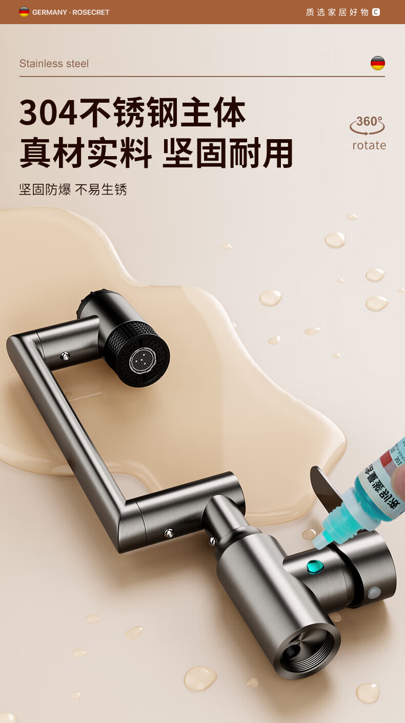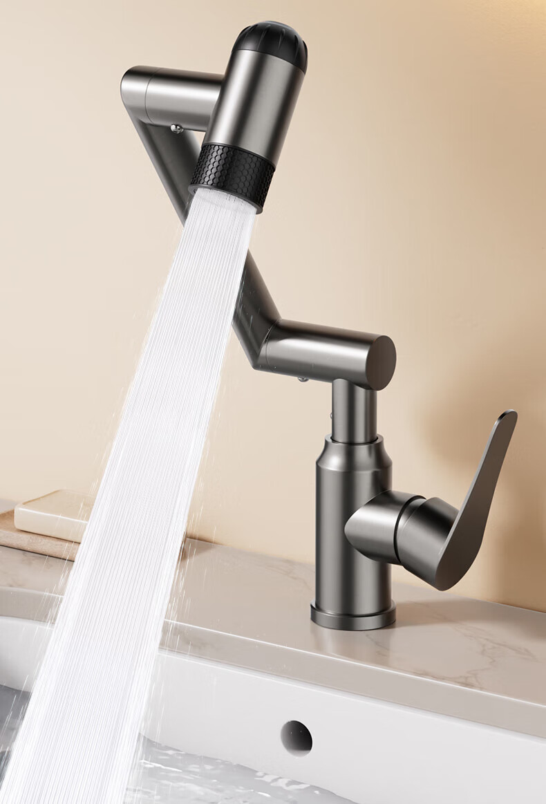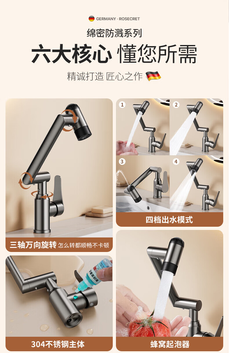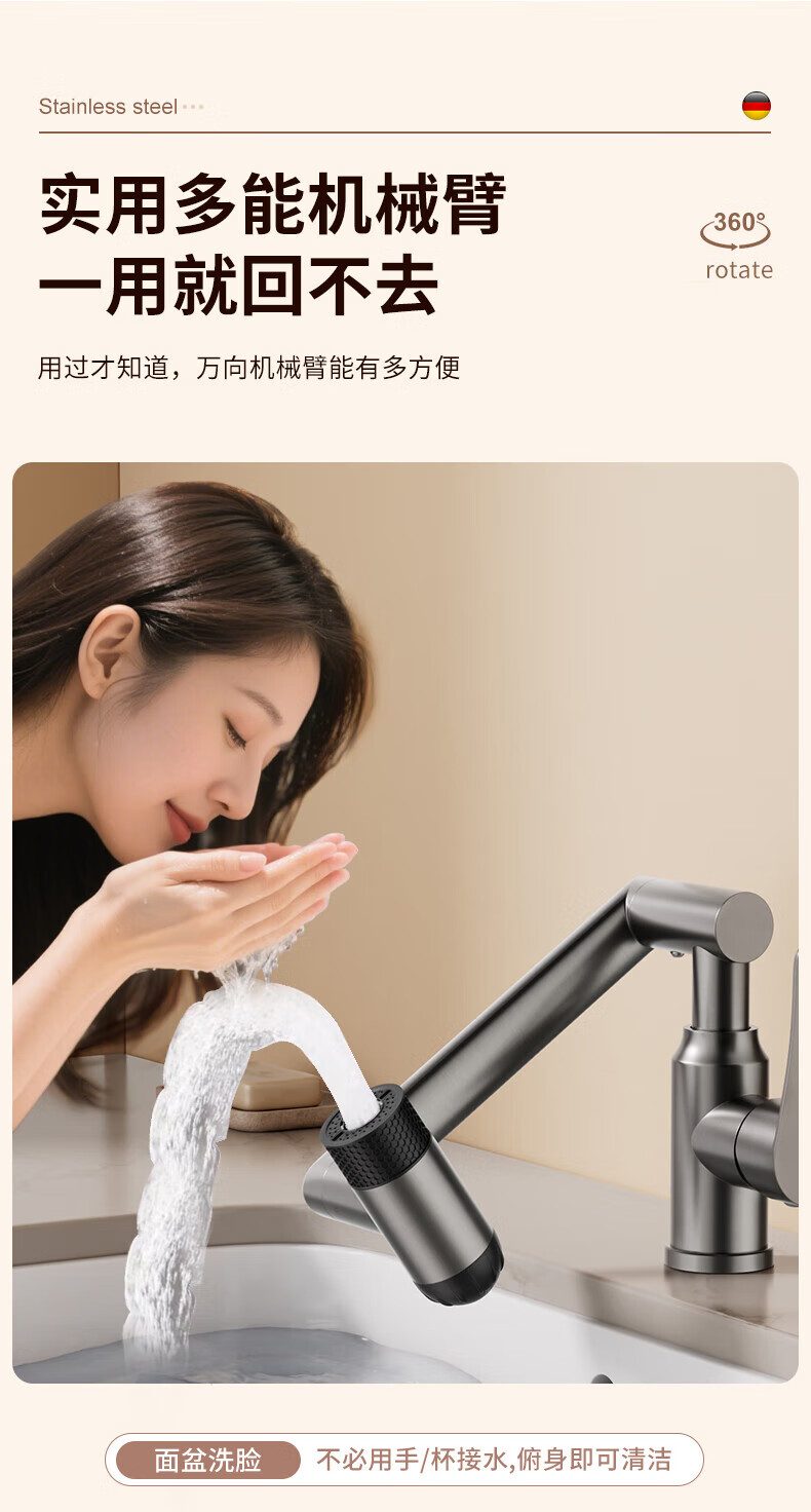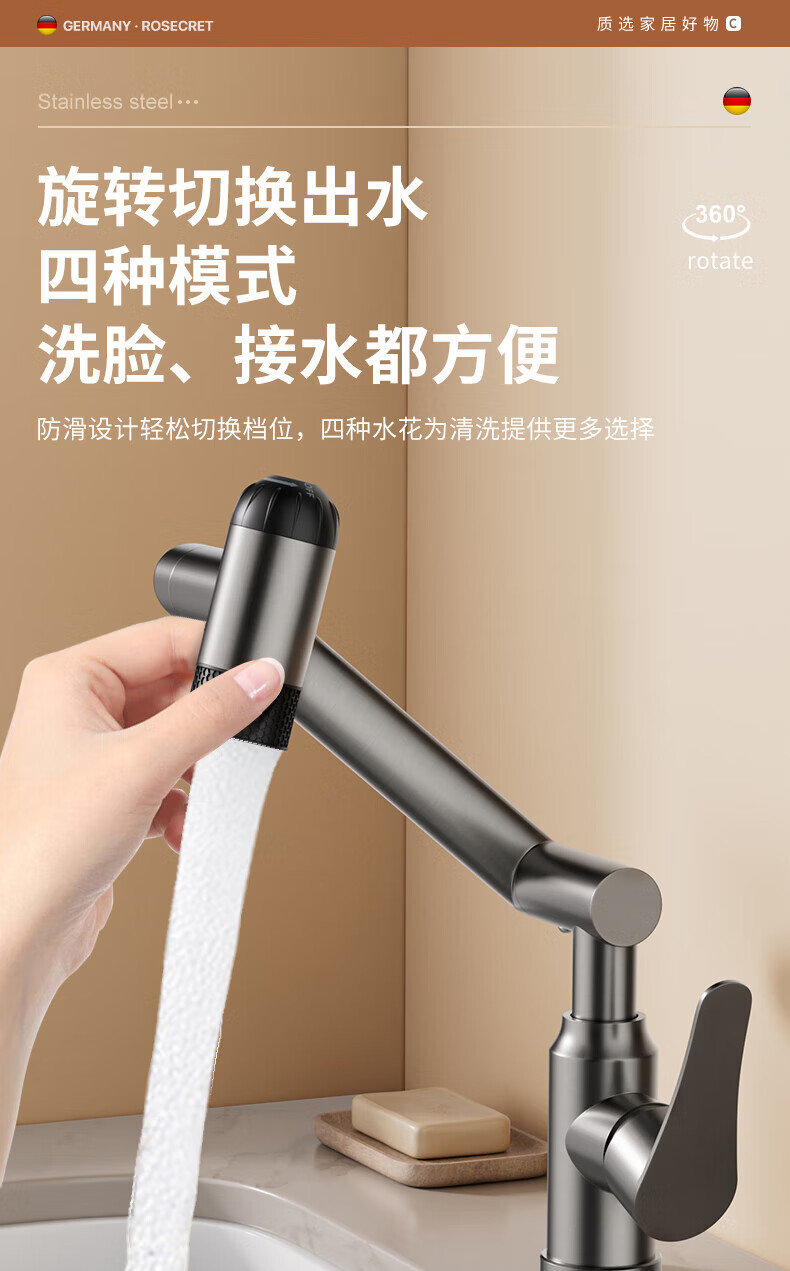 Rosecret【德国】304不锈钢水龙头洗脸盆卫生间面盆洗手盆机械臂冷热龙头 304不锈钢台盆龙头【四档枪灰色】面盆洗脸漱口神器 增压防溅大流量出水丨配80cm冷热进水管*2