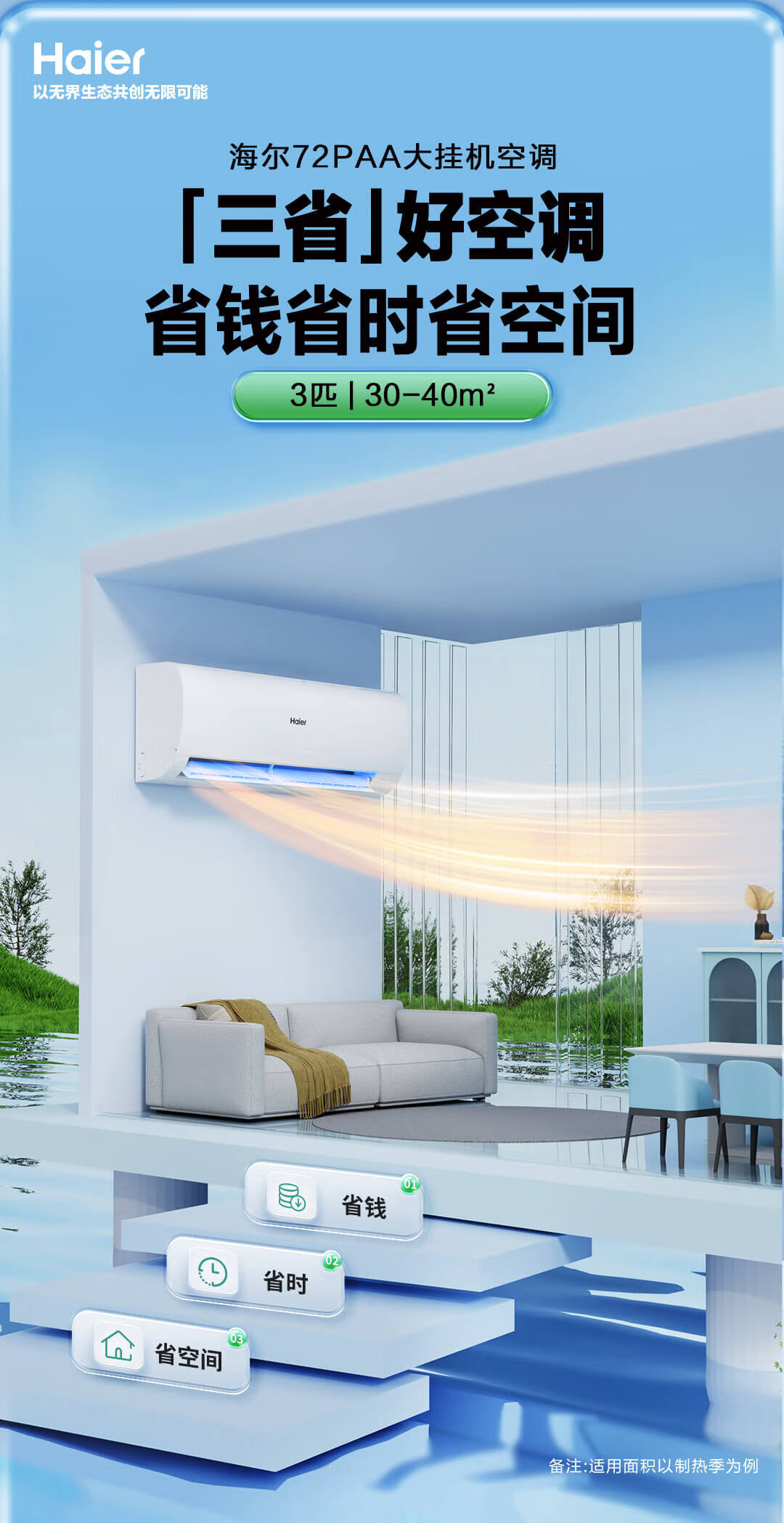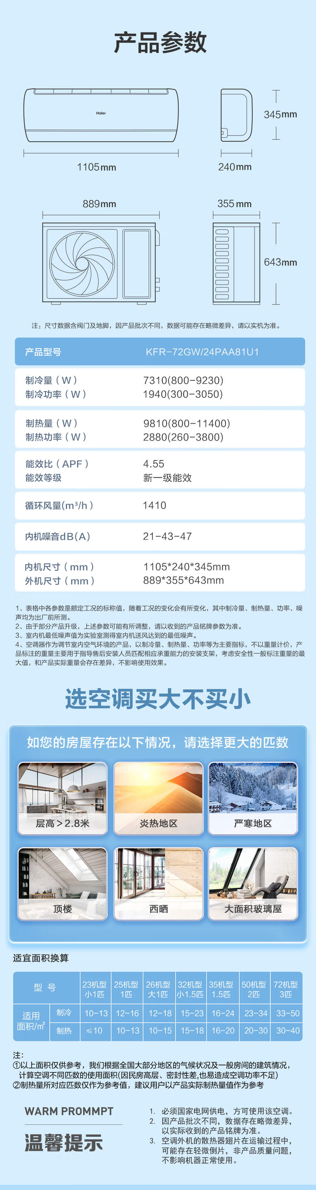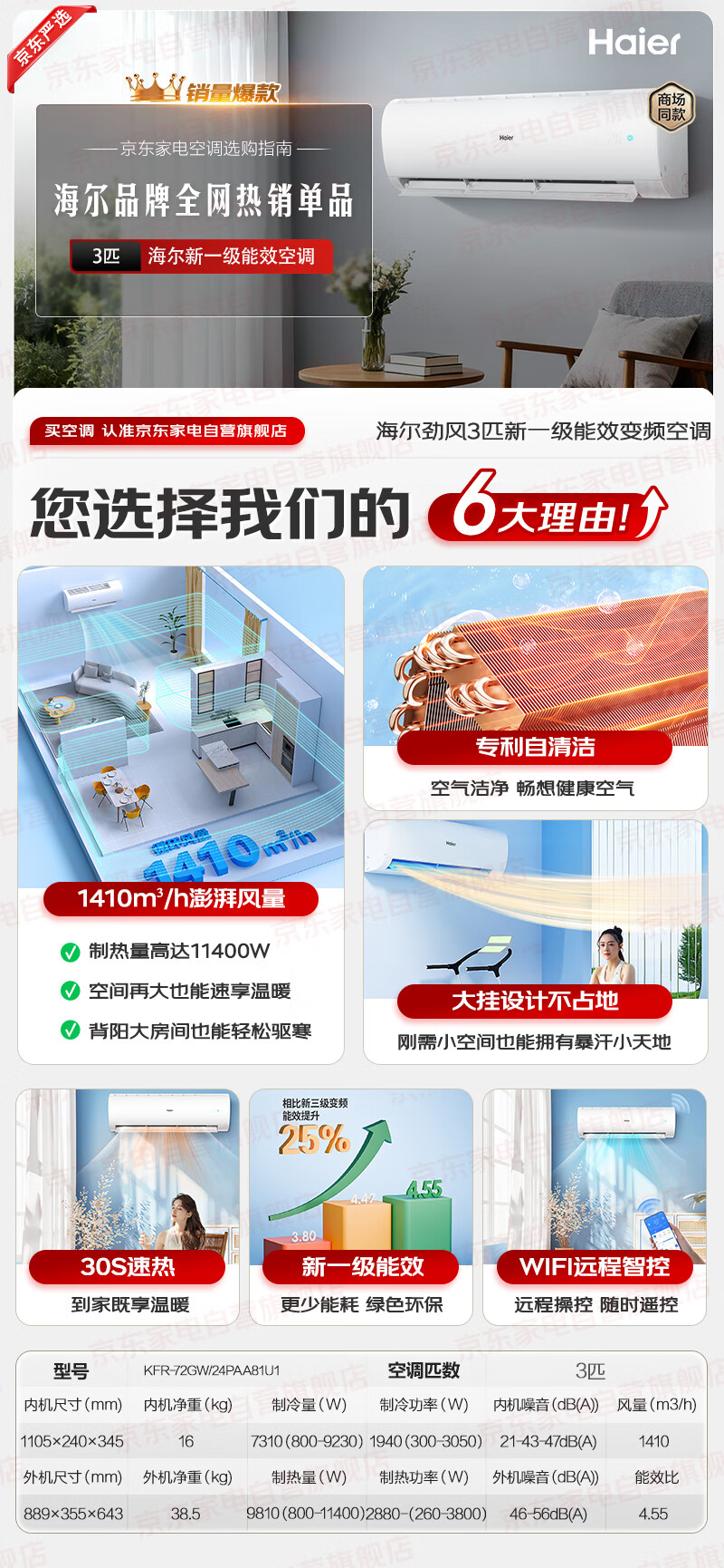 海尔(Haier)空调挂机3匹【小红花】一级能效 省电变频冷暖客厅大挂机大风量 KFR-72GW/24PAA81U1