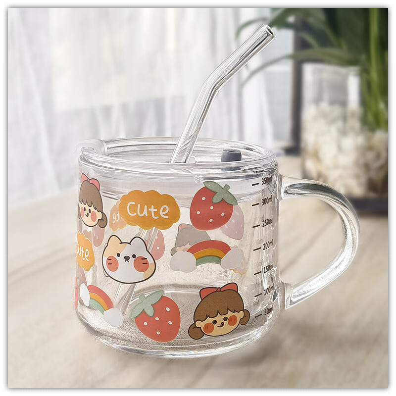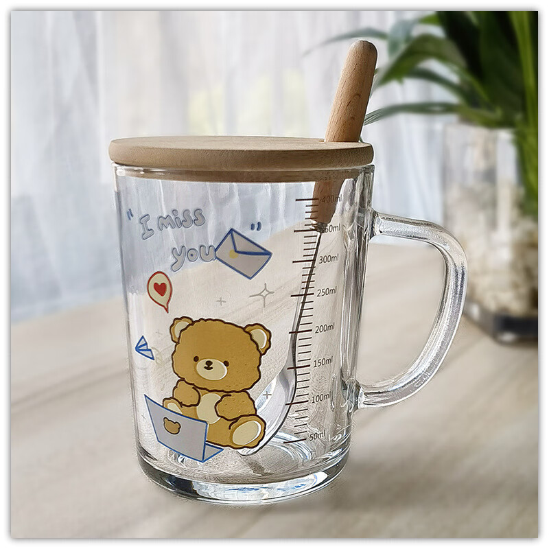【优选百货】ins玻璃杯卡通印花吸管杯加盖勺刻度可爱牛奶杯早餐 350ml 可爱小兔款+竹盖+木柄勺 301-400ml
