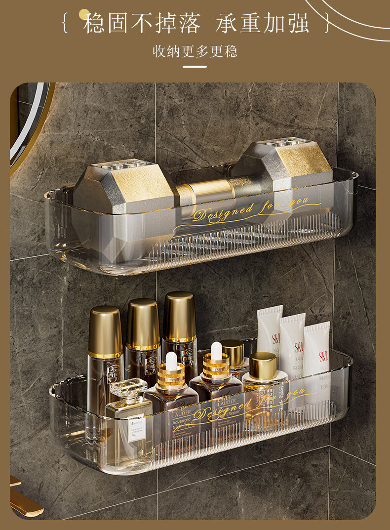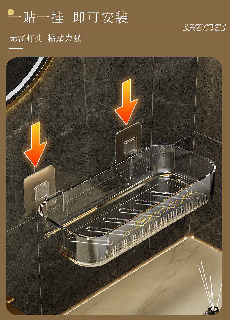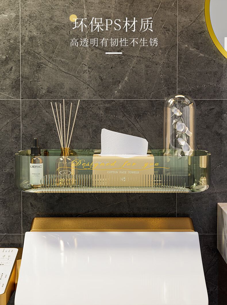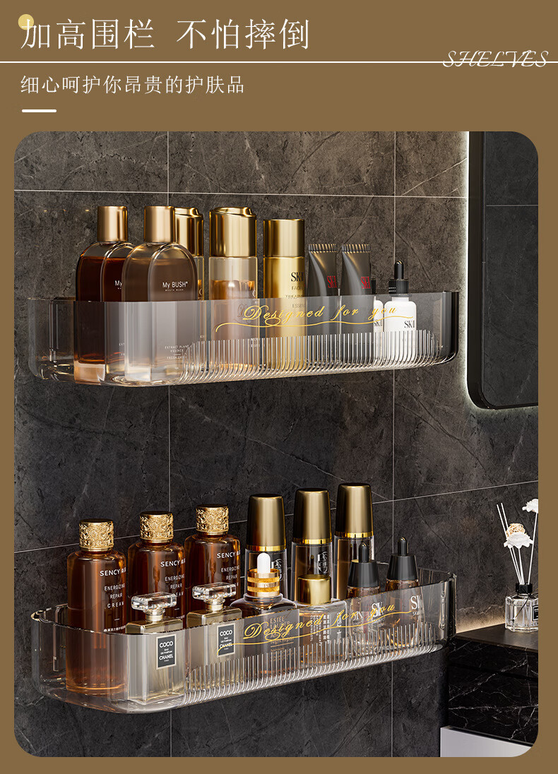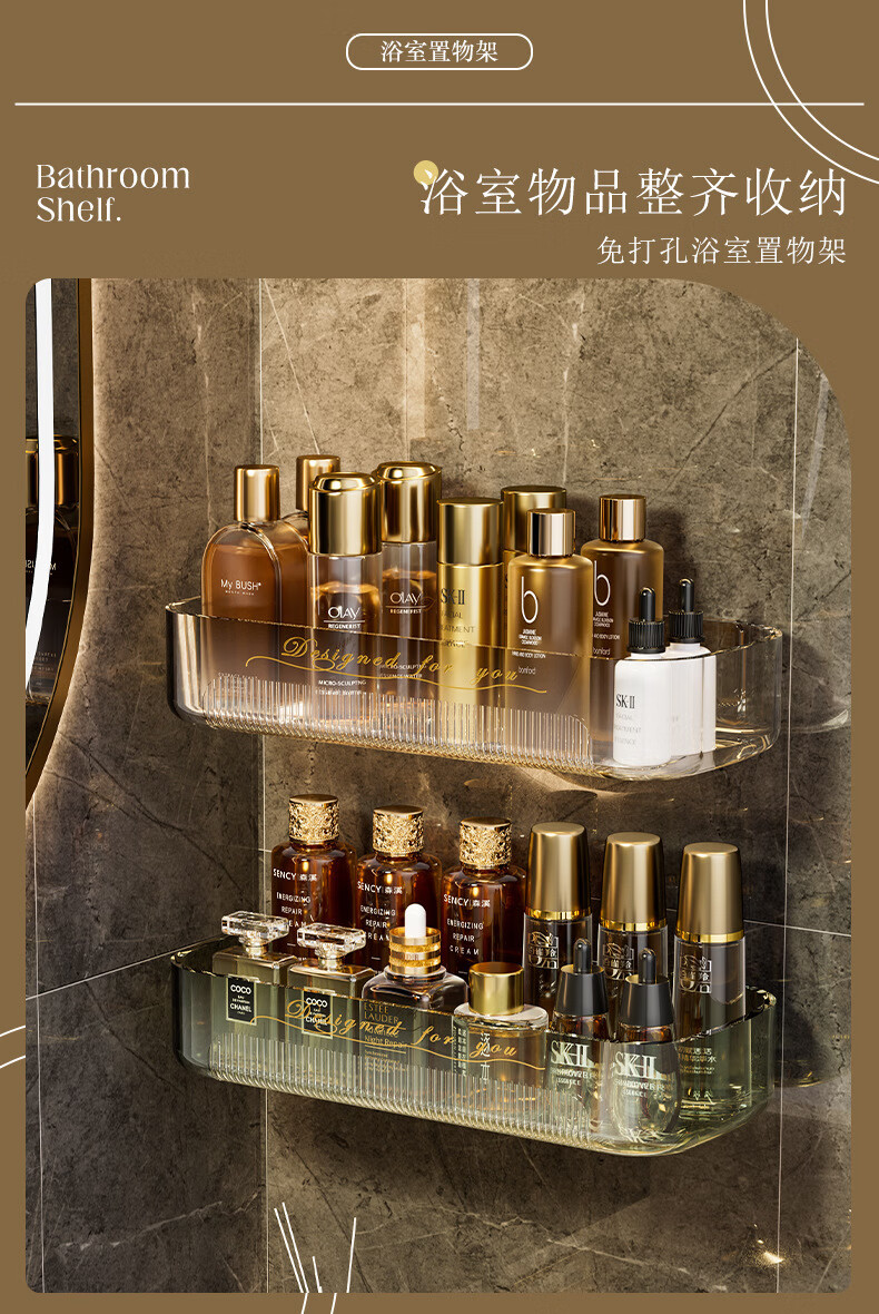 免打孔浴室置物架家用卫生间洗漱用品沥水加高轻奢无痕壁挂收纳架 流光置物架【透明色】