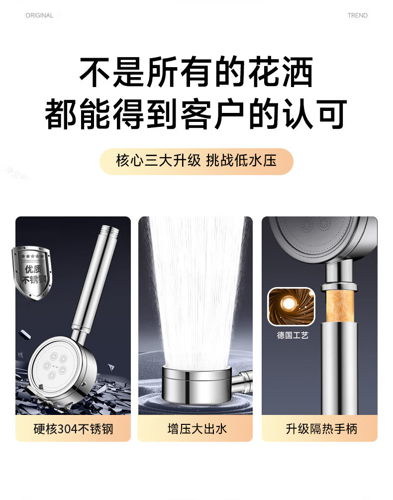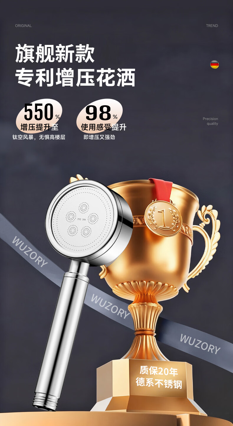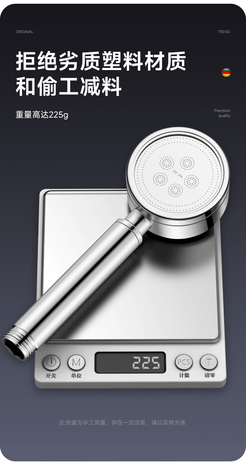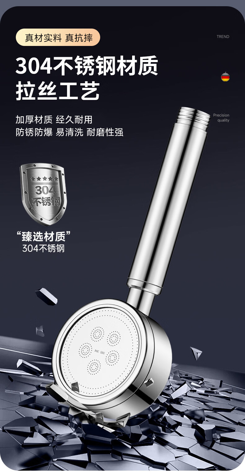 WUZORY【德国】淋浴增压花洒喷头带软管一套家用304不锈钢手持莲蓬喷头 304不锈钢单花洒喷头 真304不锈钢丨畅爽酒店式淋浴