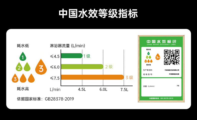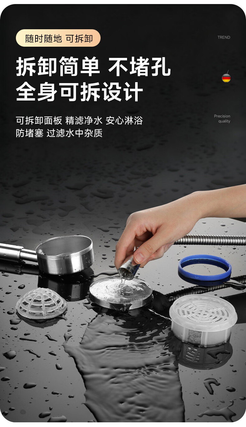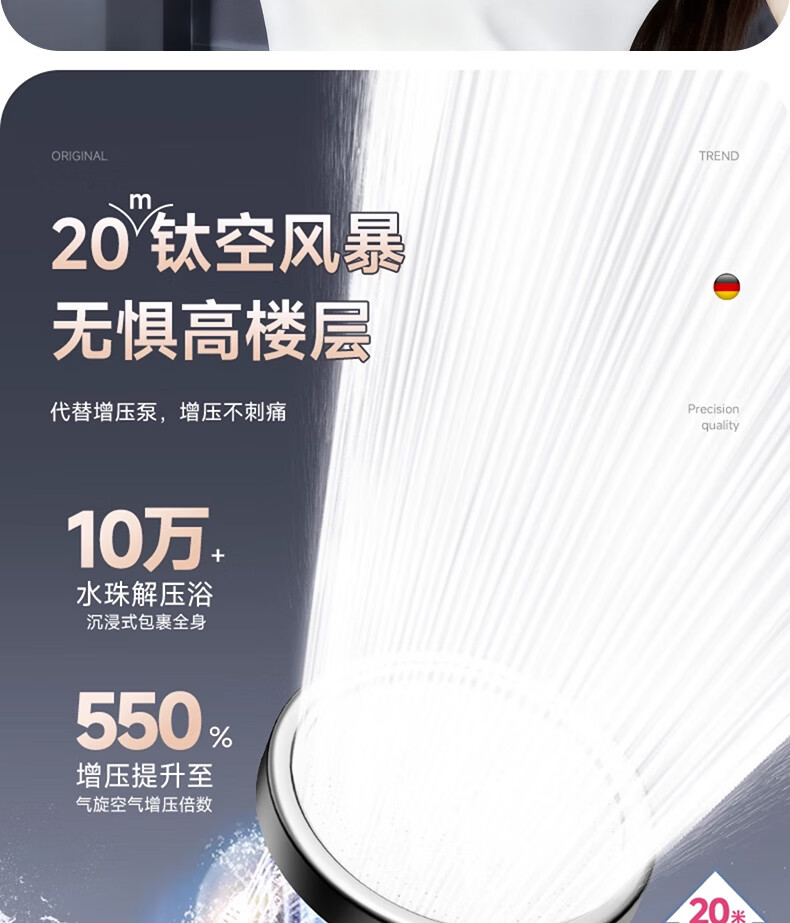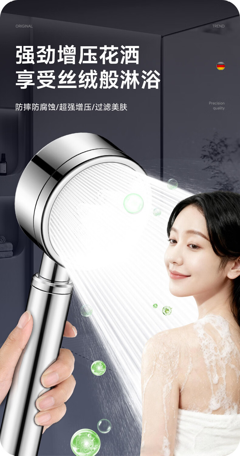 CUNKOY【德国】淋浴增压花洒喷头带软管一套浴室洗澡加压莲蓬花洒头套装 五档增压花洒+1.5米软管【雅黑】 强劲增压丨密集大出水