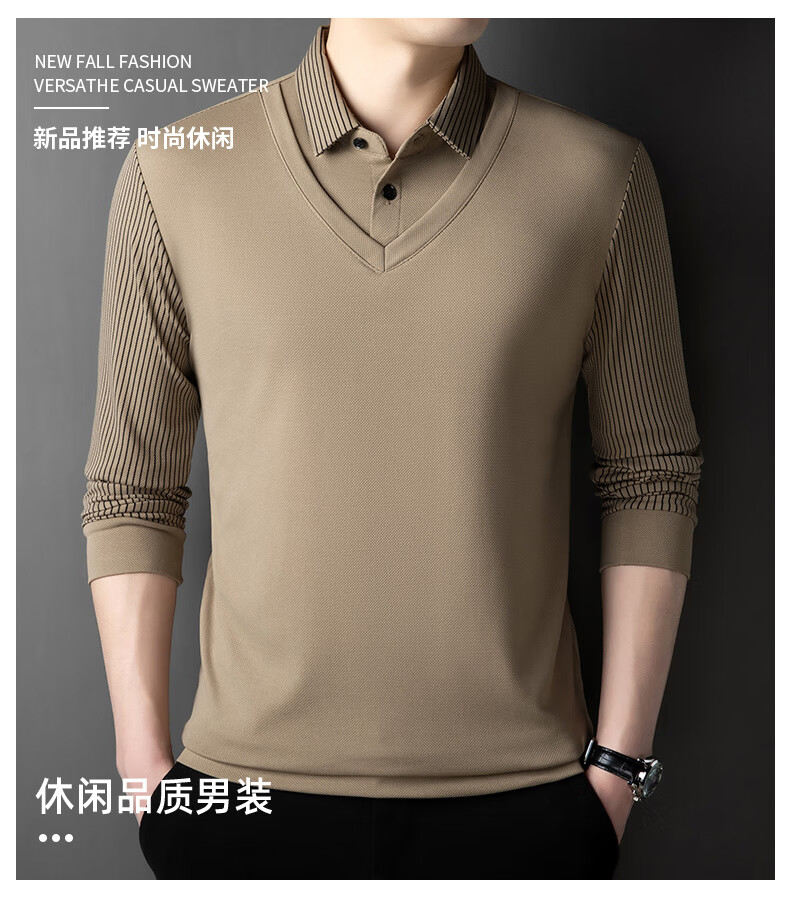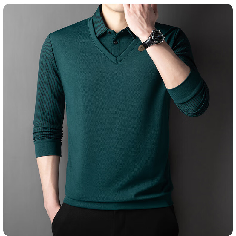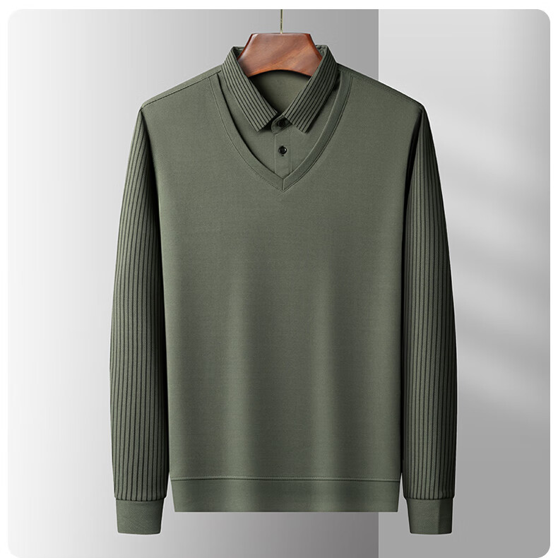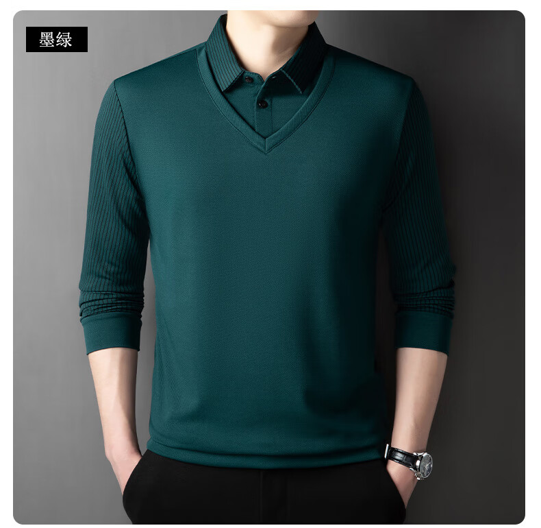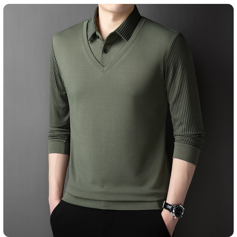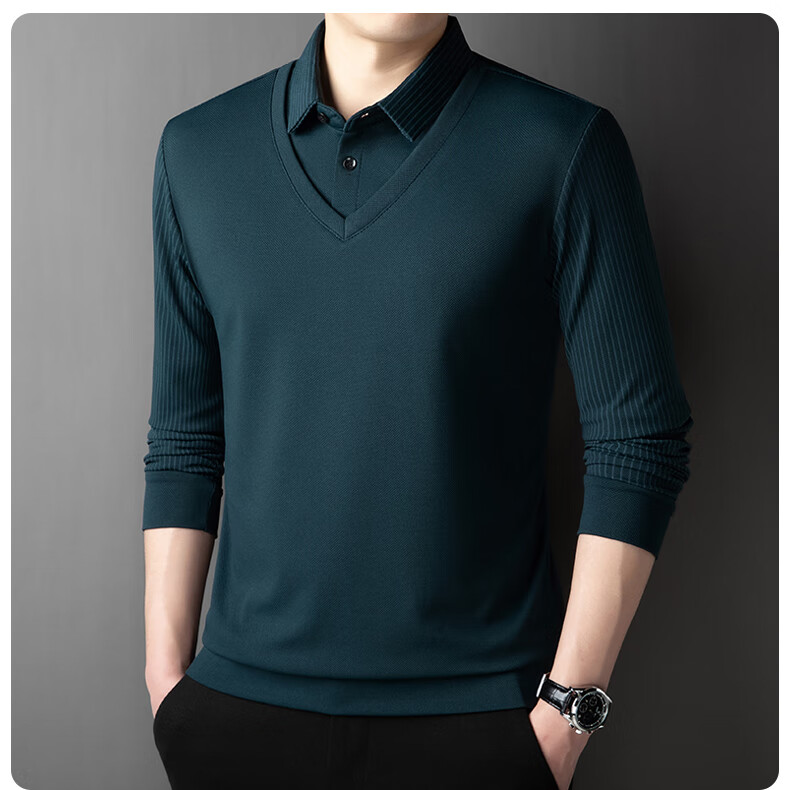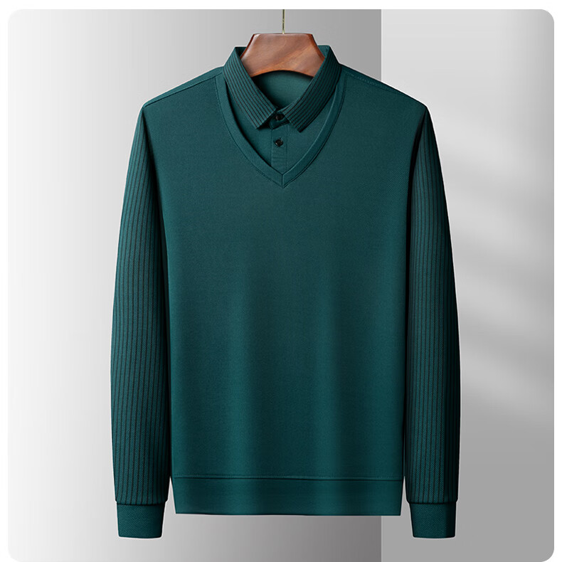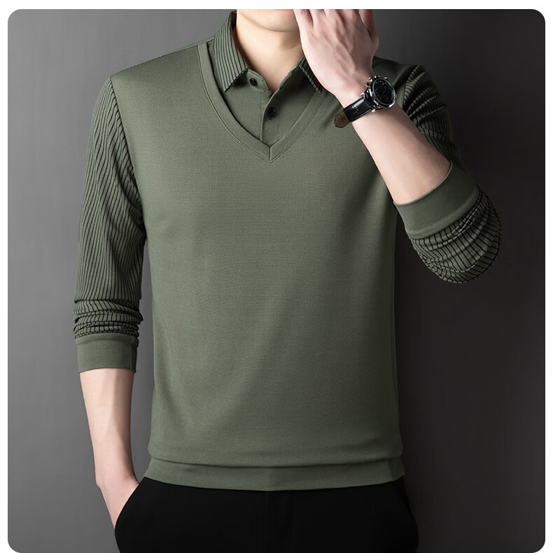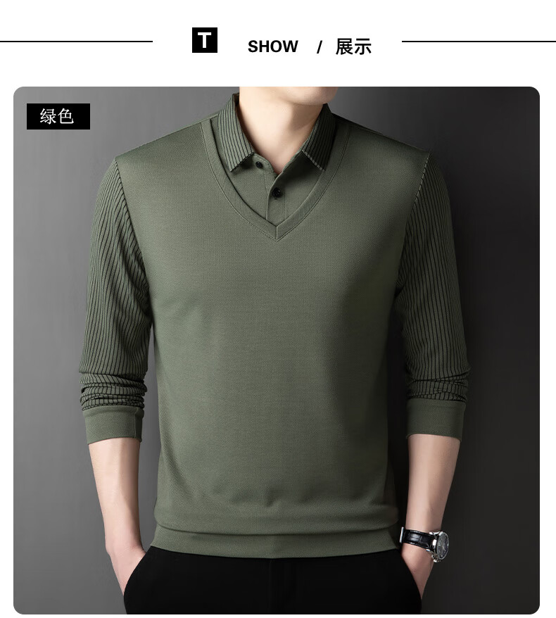 雅鹿男装加绒加厚假两件毛衣男士休闲翻领时尚潮流男装上衣t恤衫 豆绿加绒 XL (175)(建议140-155斤)