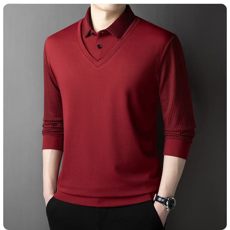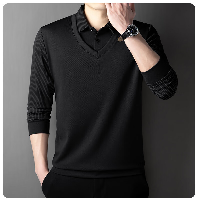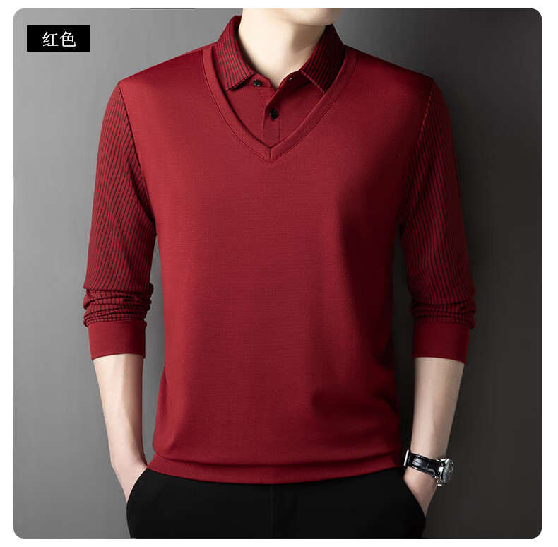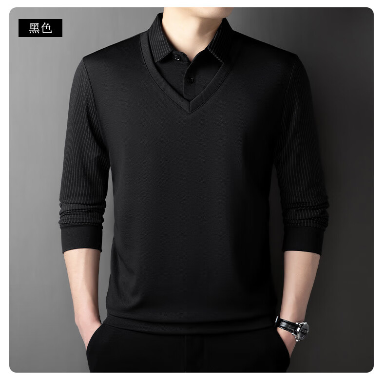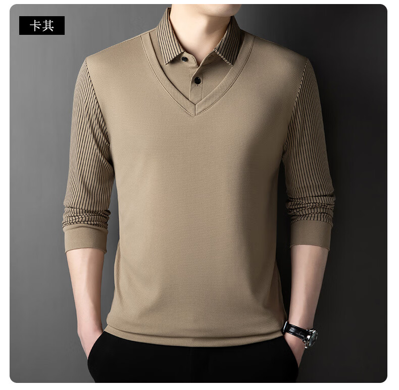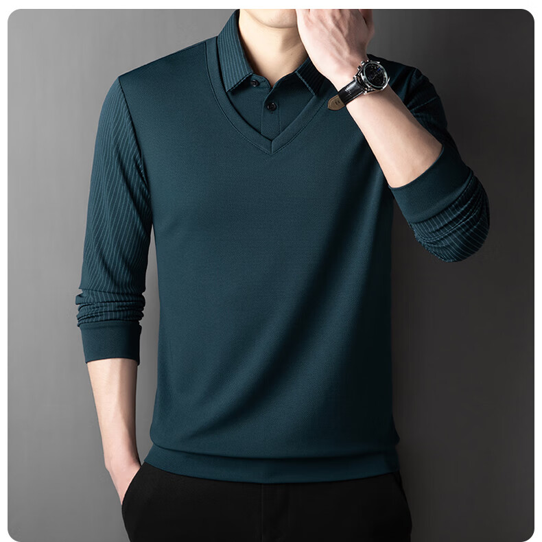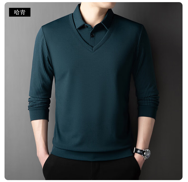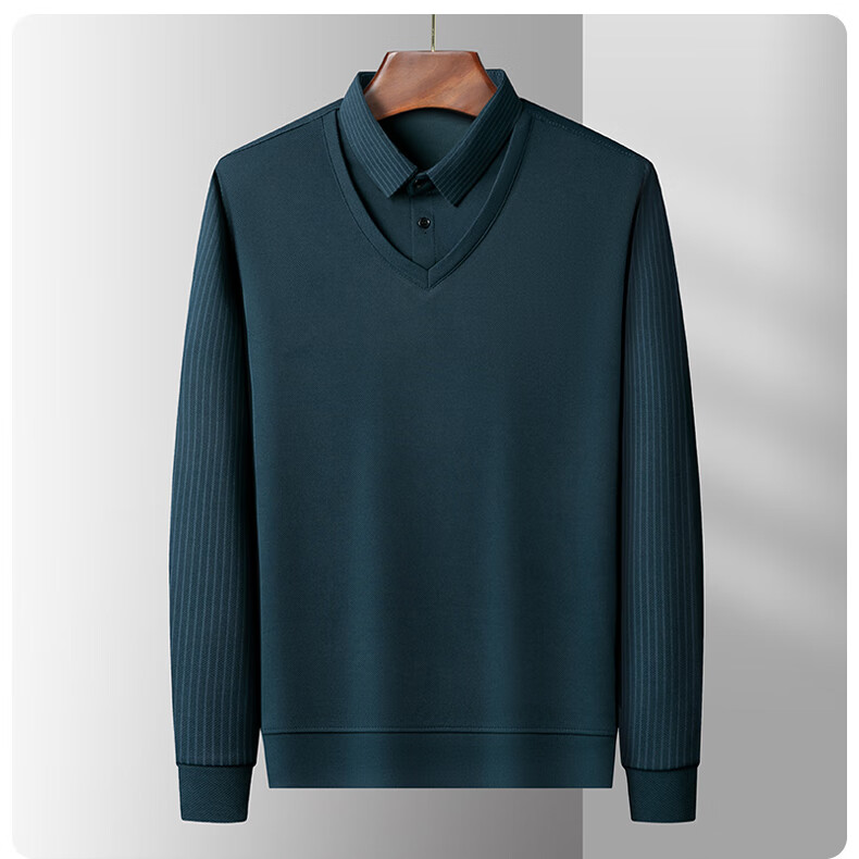雅鹿男装加绒加厚假两件毛衣男士休闲翻领时尚潮流男装上衣t恤衫 豆绿加绒 XL (175)(建议140-155斤)