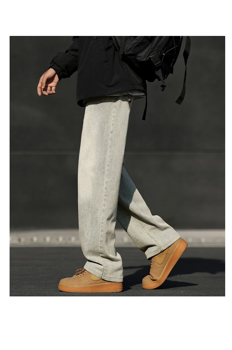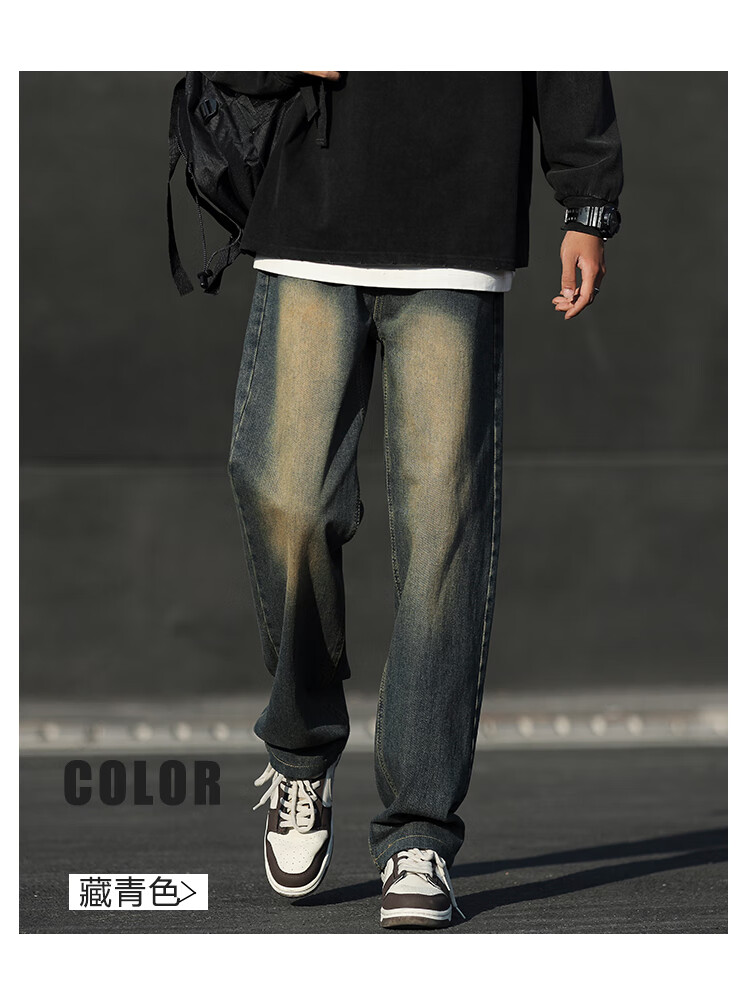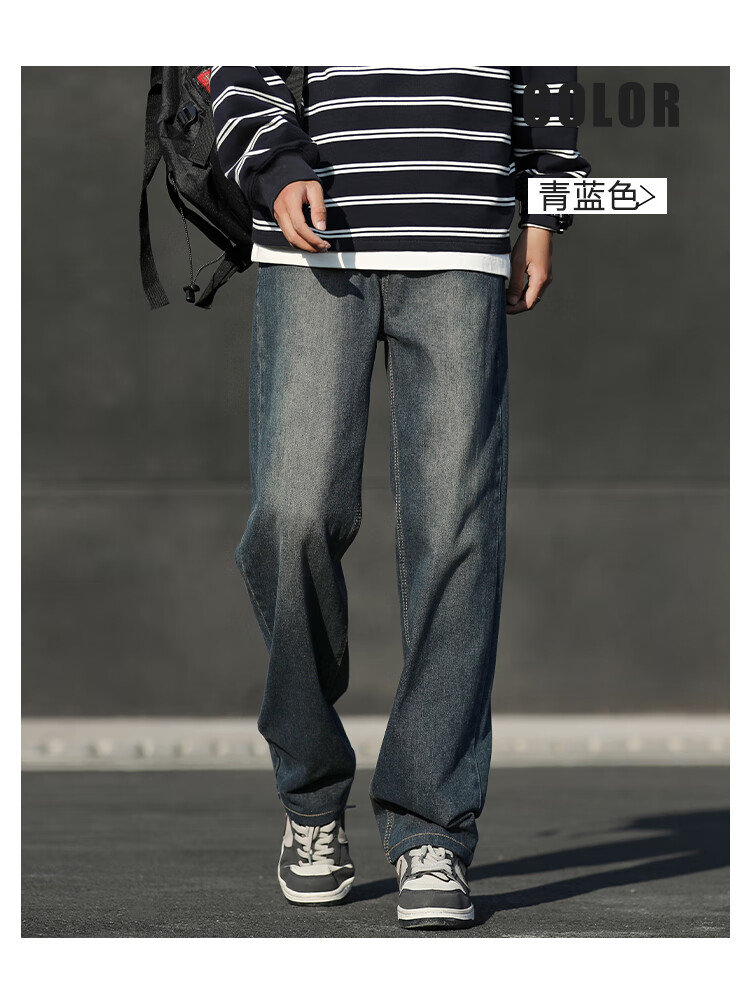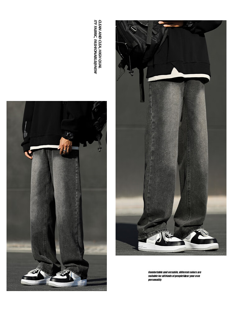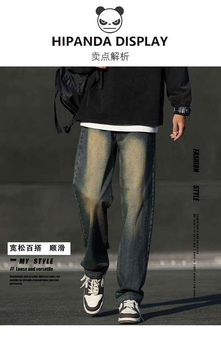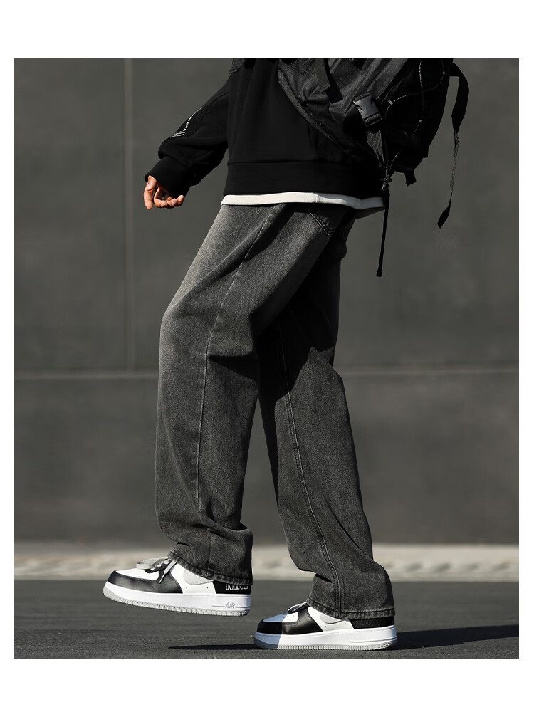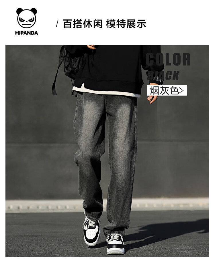 HIPANDA你好熊猫男裤2025年秋冬美式宽松水洗直筒牛仔裤复古休闲长裤子男 烟黑色-加绒款 S