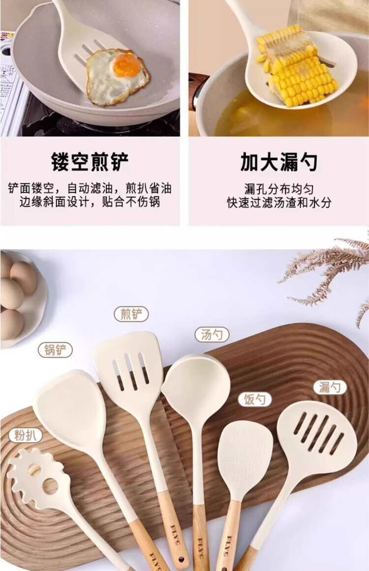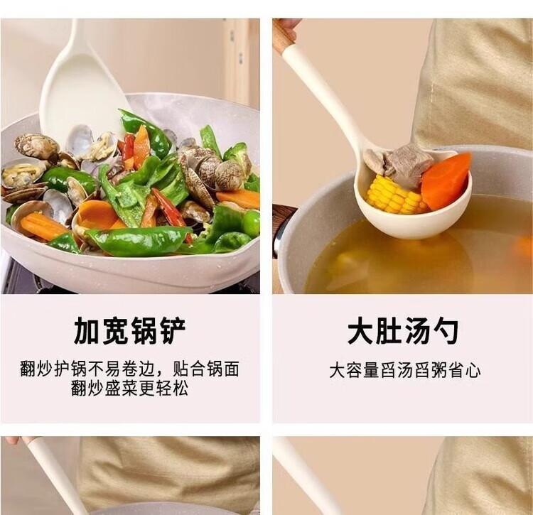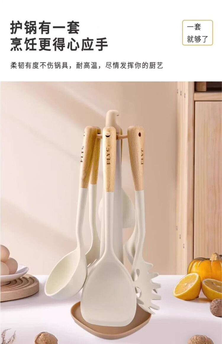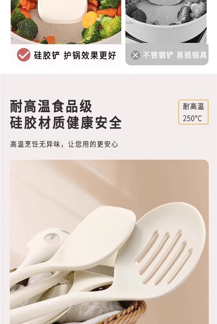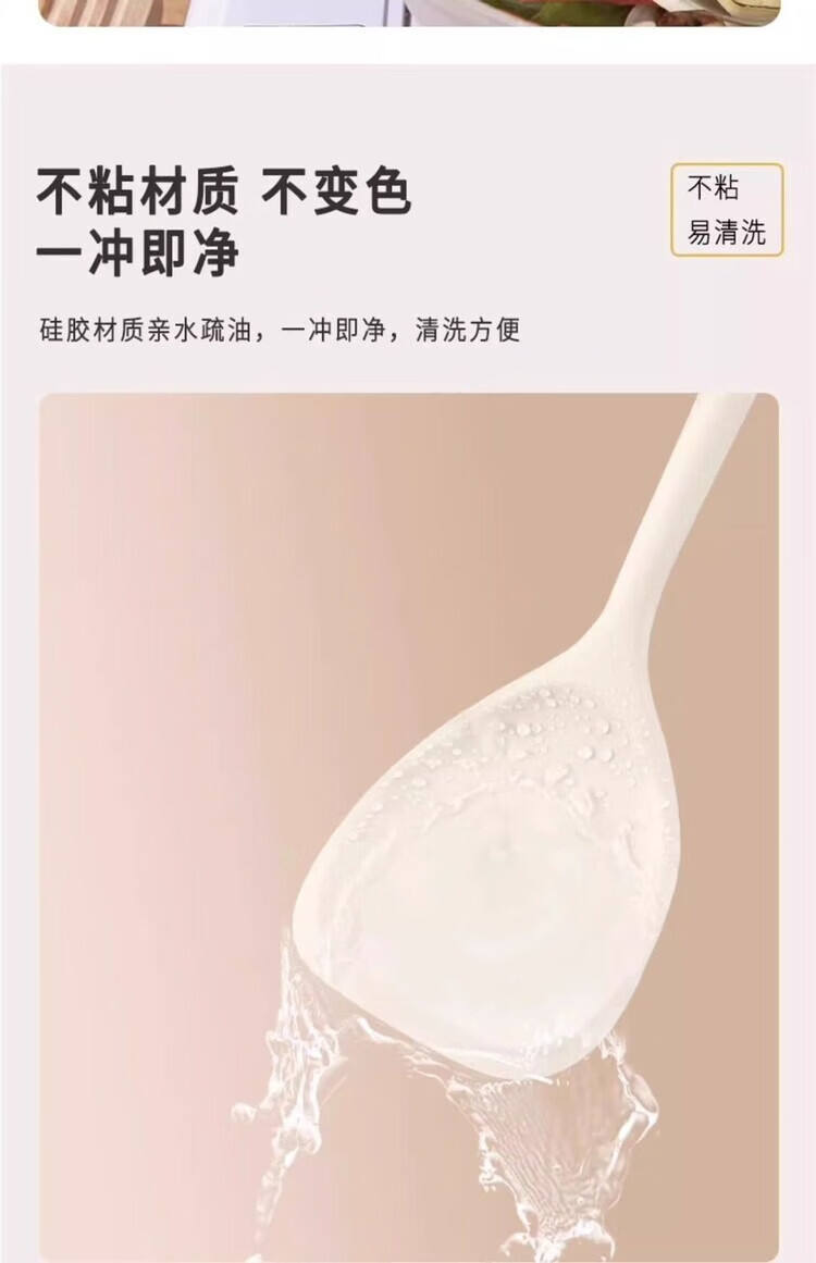 简漾硅胶锅铲套装炒菜铲子厨具全套不粘锅专用饭勺煎铲耐高温硅胶厨具 耐高温硅胶+不伤锅 米白色厨具7件套