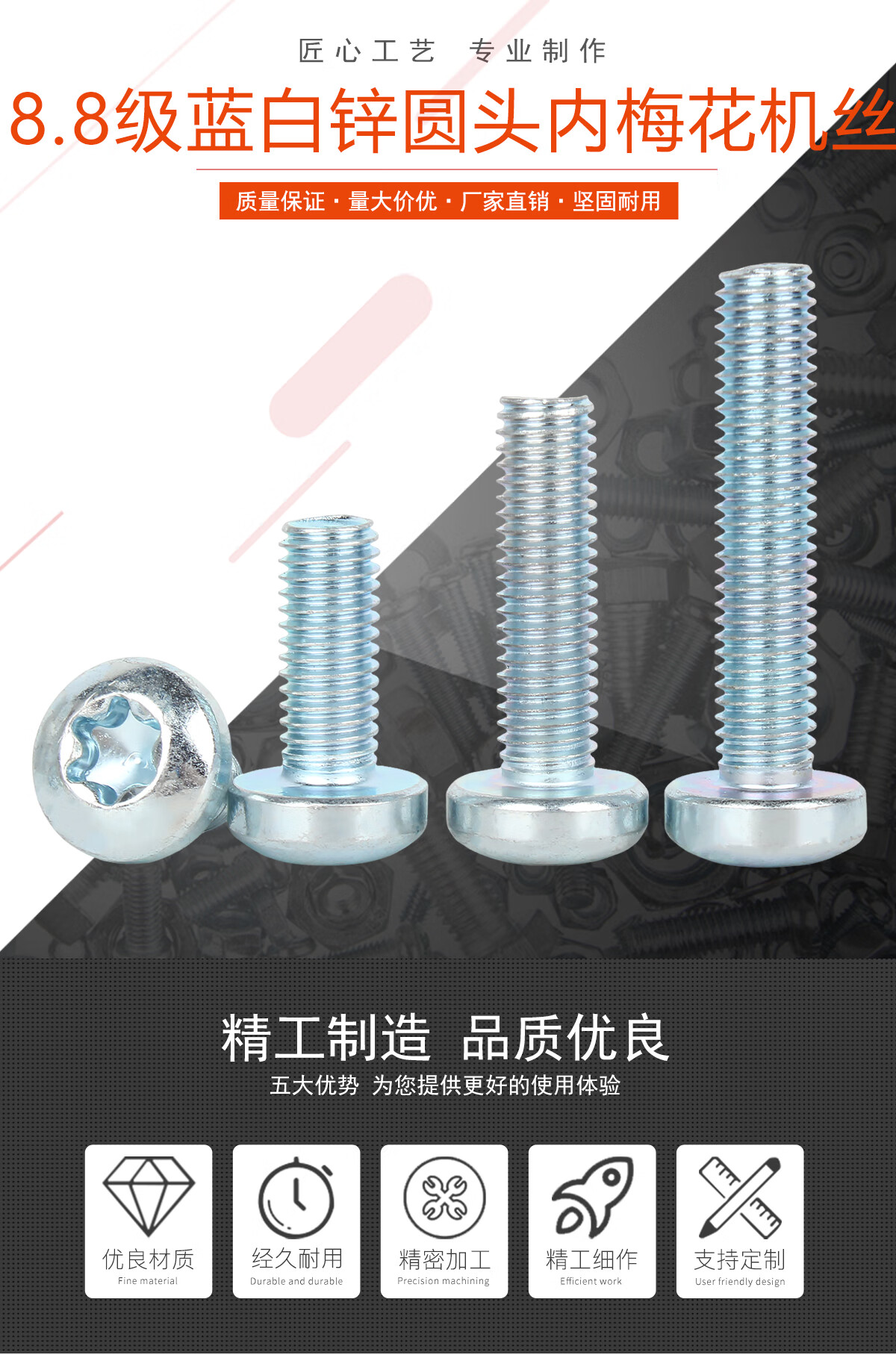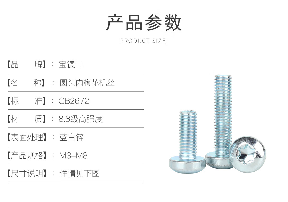 宝德丰8.8级镀锌盘头内梅花螺丝钉GB2672圆头花形槽防盗螺栓 M3M4M5M6M8 M3x6(200只)