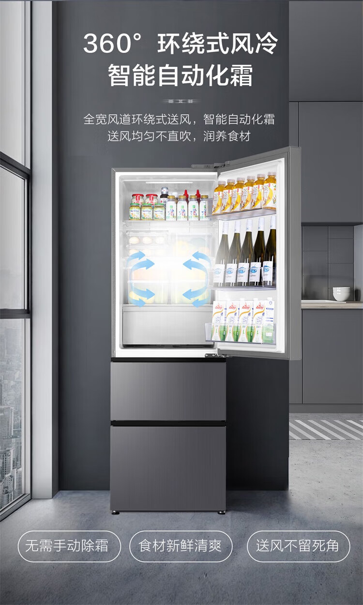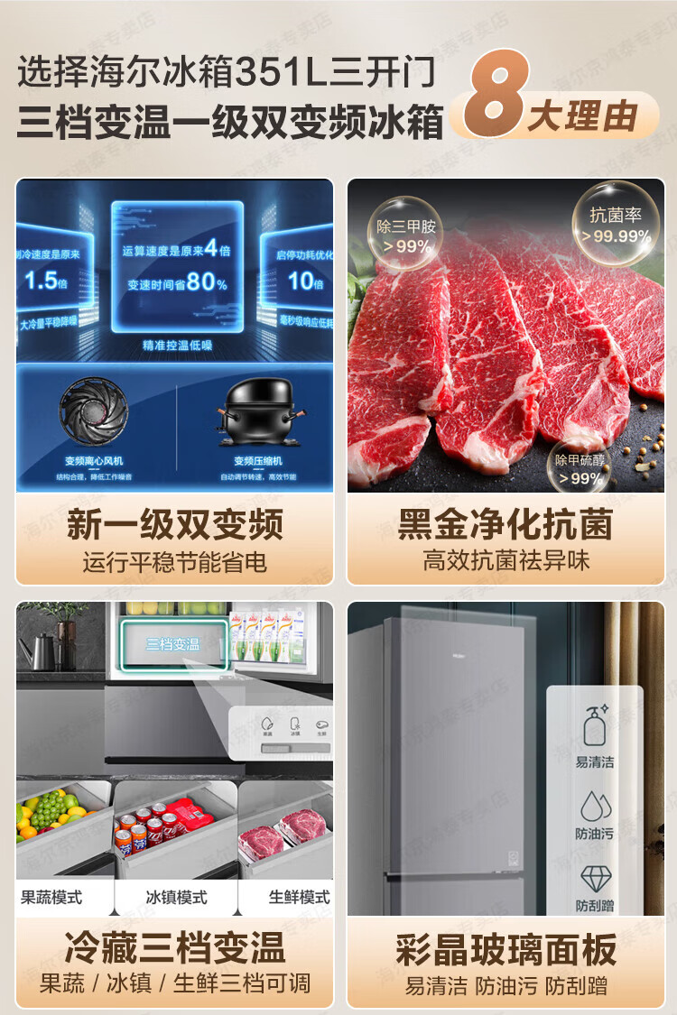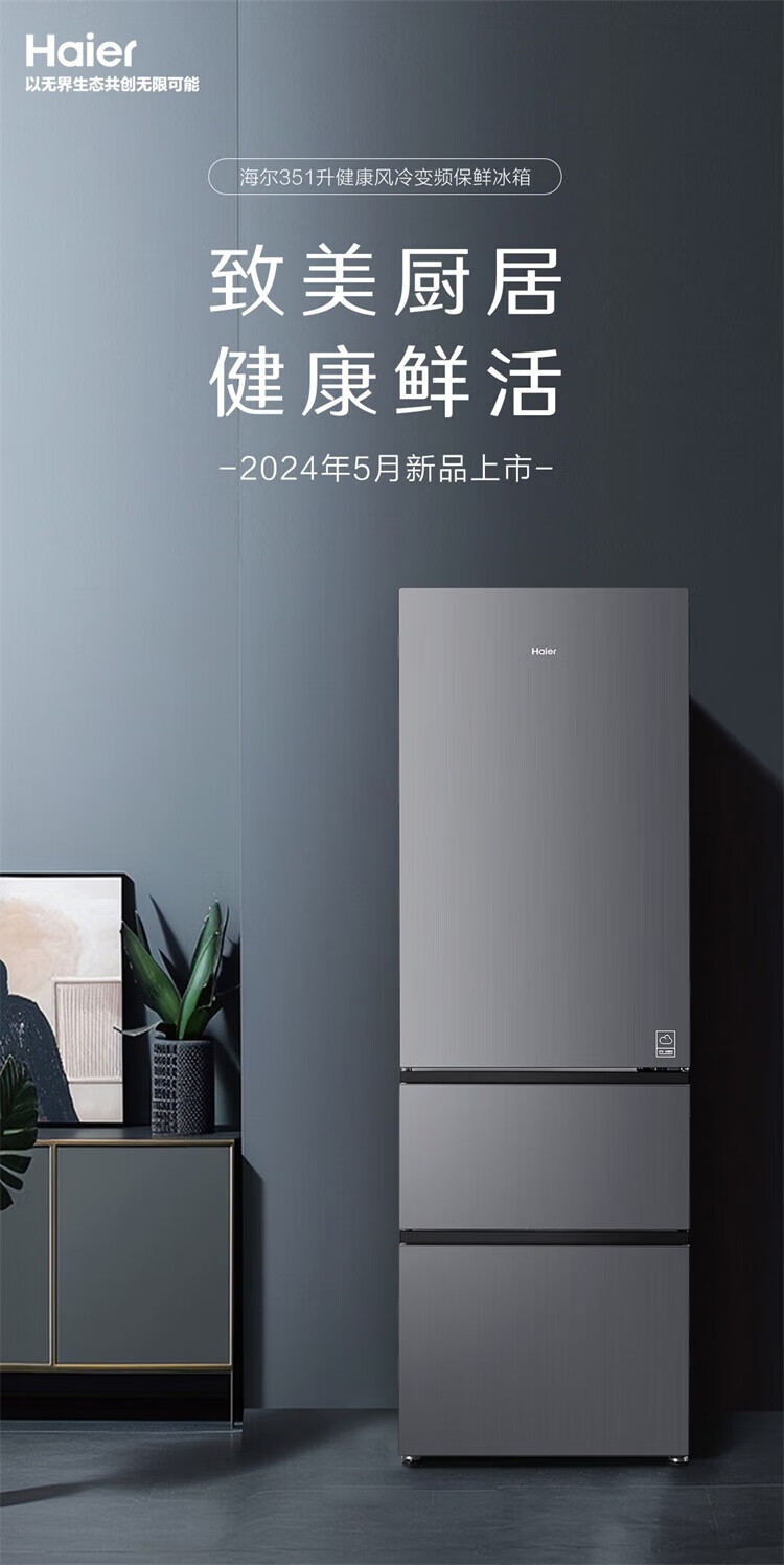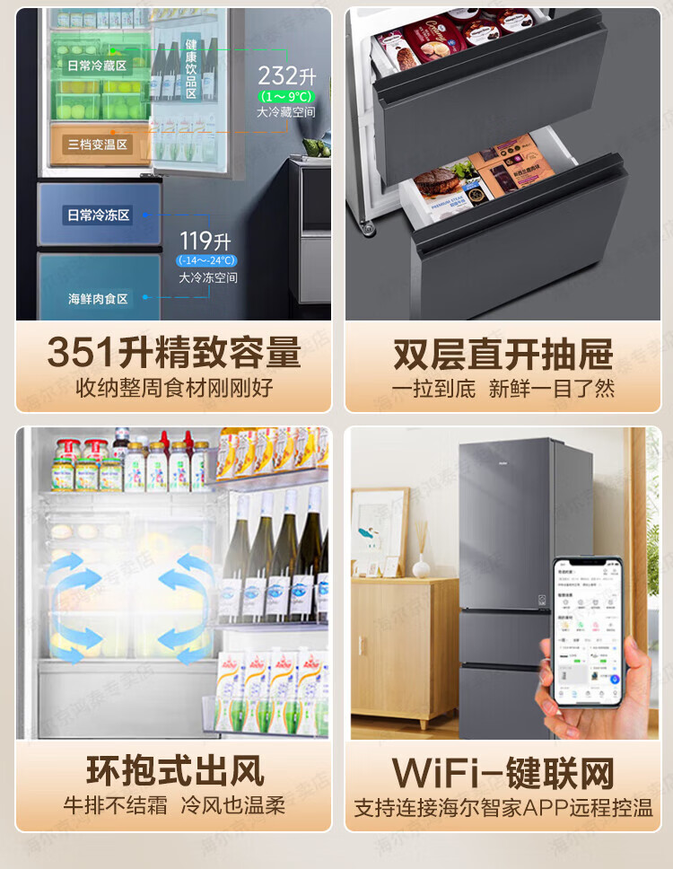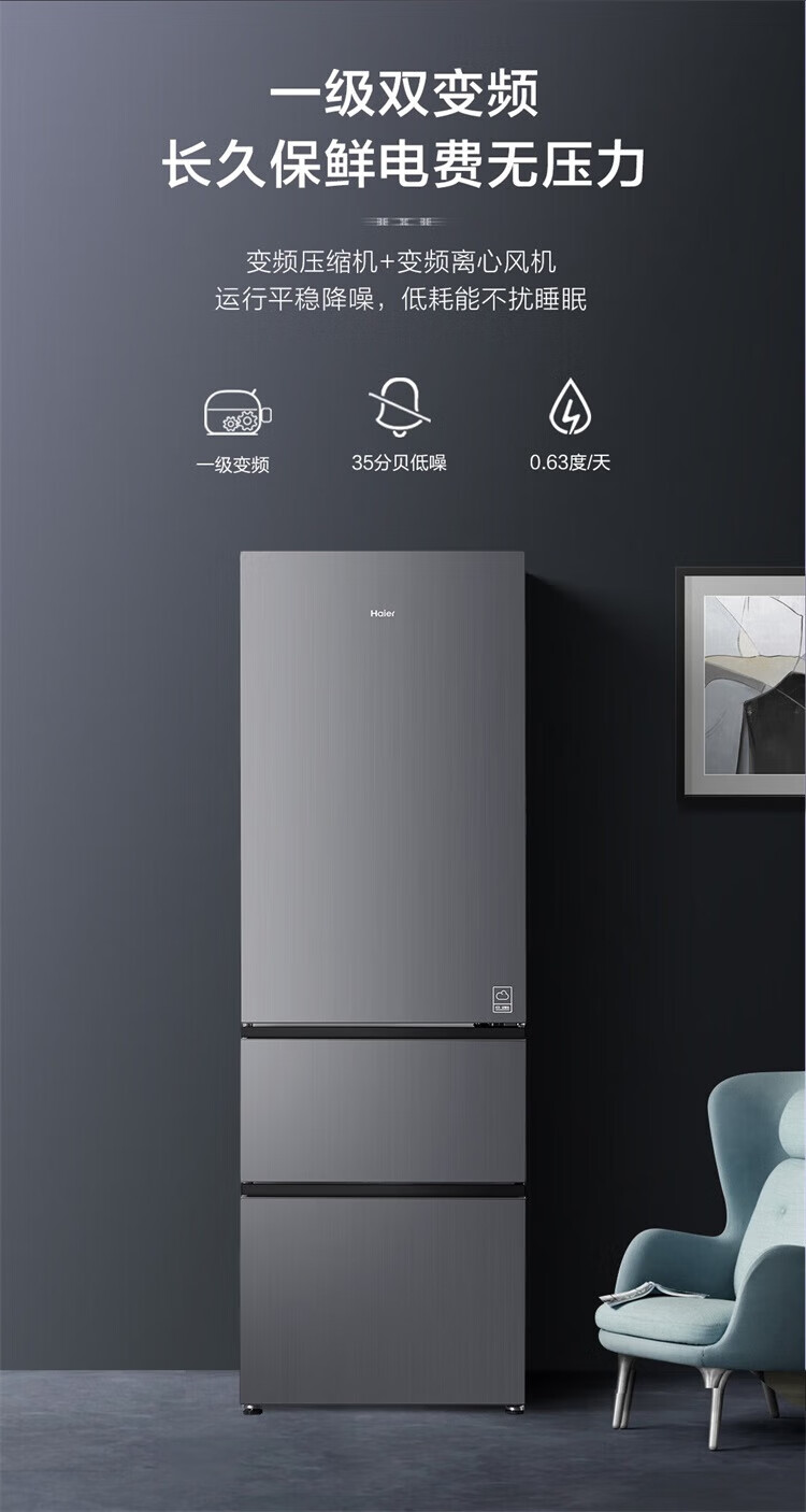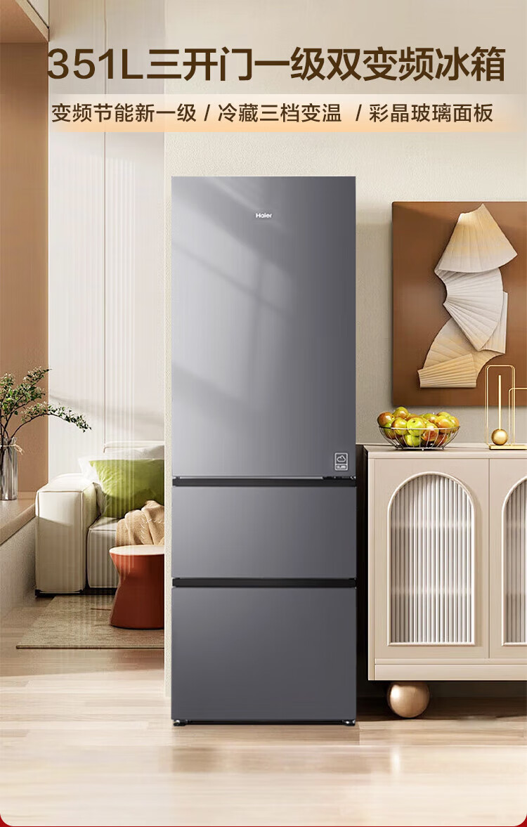 海尔冰箱351升法式三开门多门双变频节能一级能效双循环系统风冷无霜小型出租房屋家电家用国家补贴20% 黑金净化+三挡变温区+WIFI智控+支持以旧换新